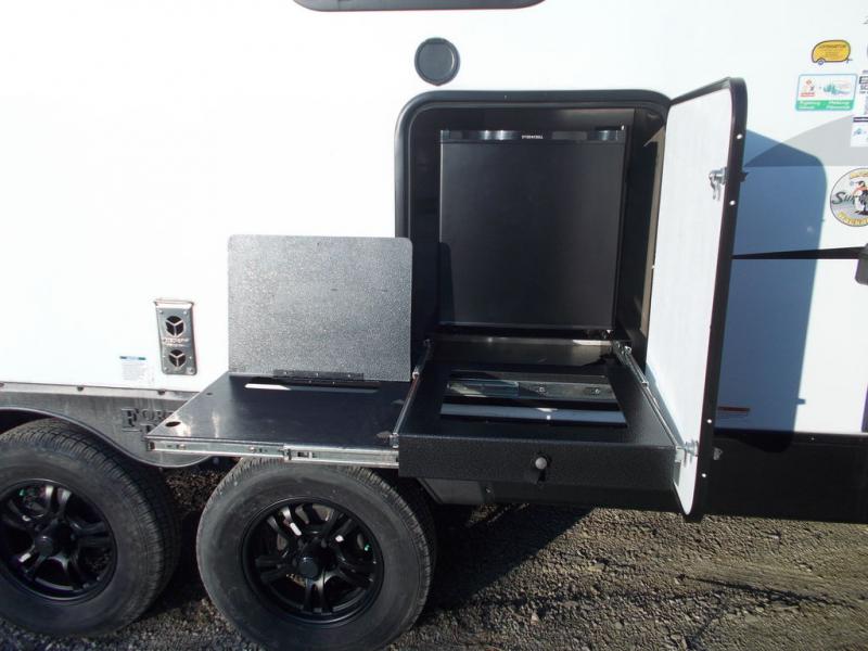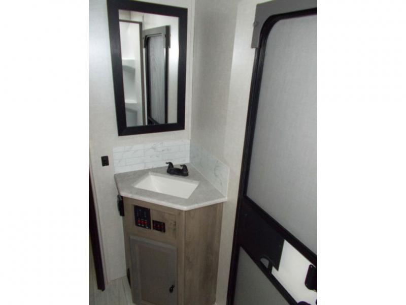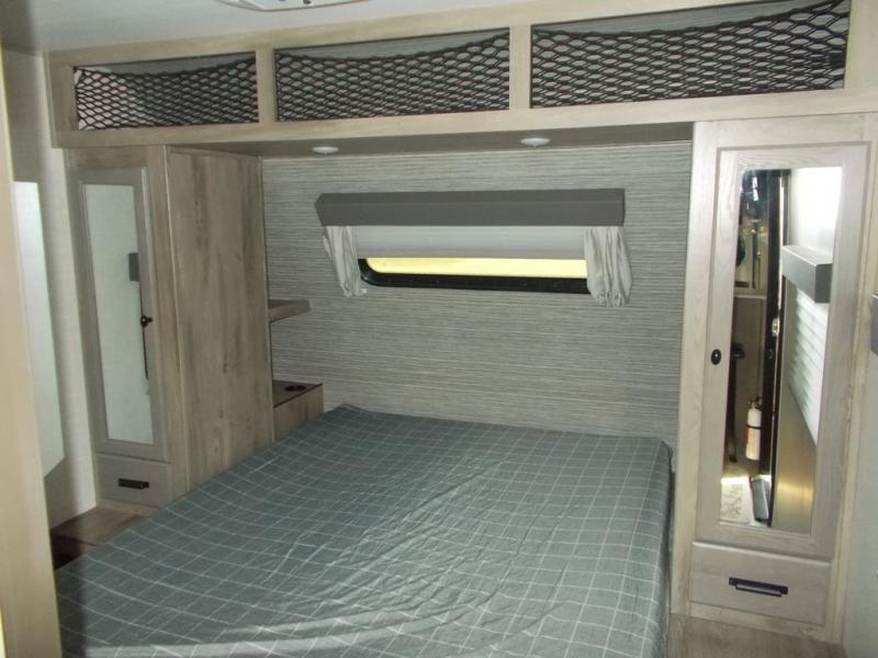 This dual entry travel trailer is the ultimate getaway for your weekend trips to the lake. You can easily bring along the mountain bikes with the under-bunk storage, and the rear storage door will make it easy to get them out when you're ready to ride. Within the large slide out you'll find a booth dinette and tri-fold sofa for seating and sleeping space, plus there is a breakfast bar with stools the little ones are sure to love. Check out the beautiful barn doors that lead to the front bedroom where you'll find a queen-size bed and dual wardrobes. Don't let this travel trailer slip away!