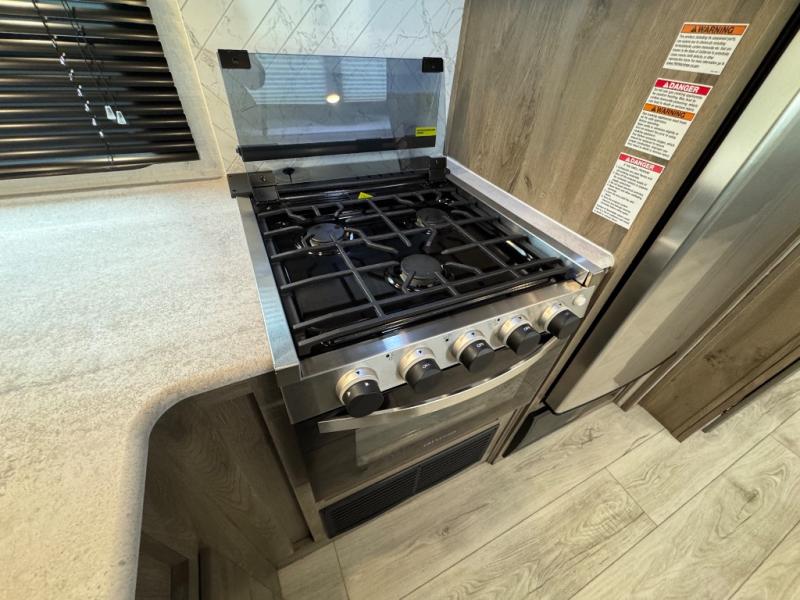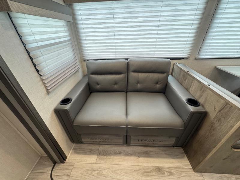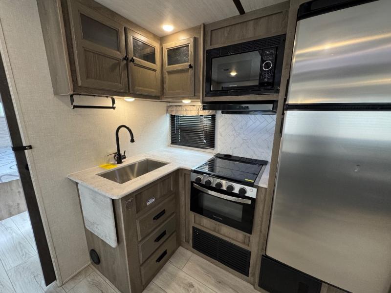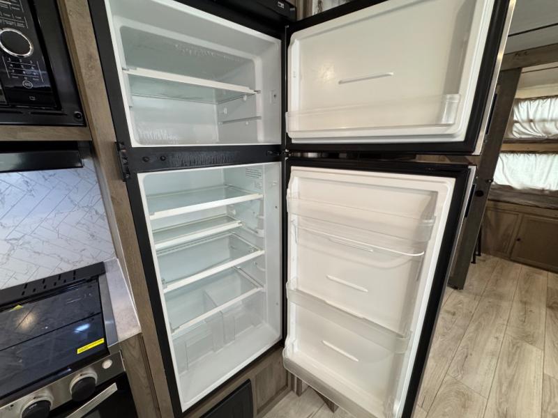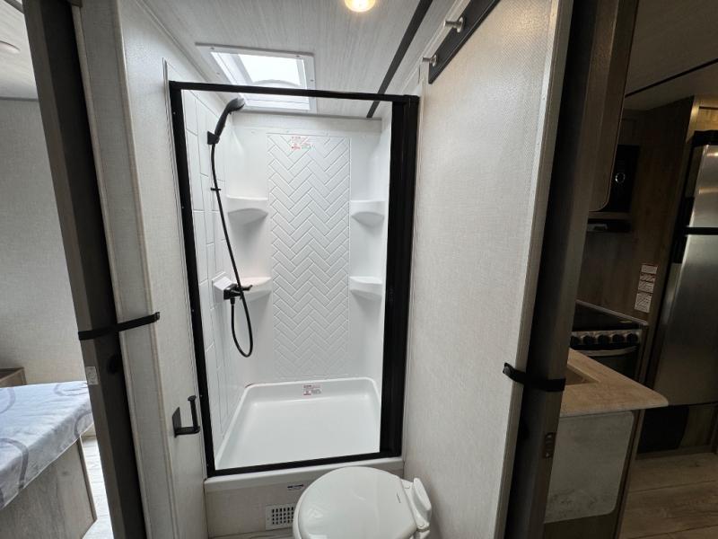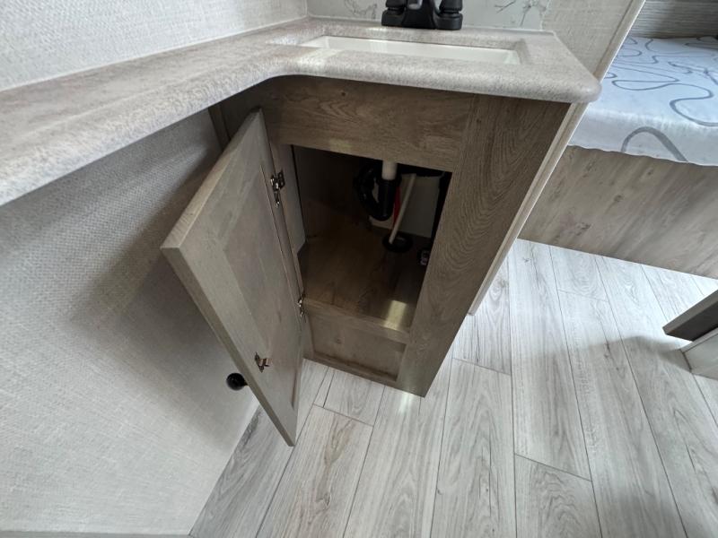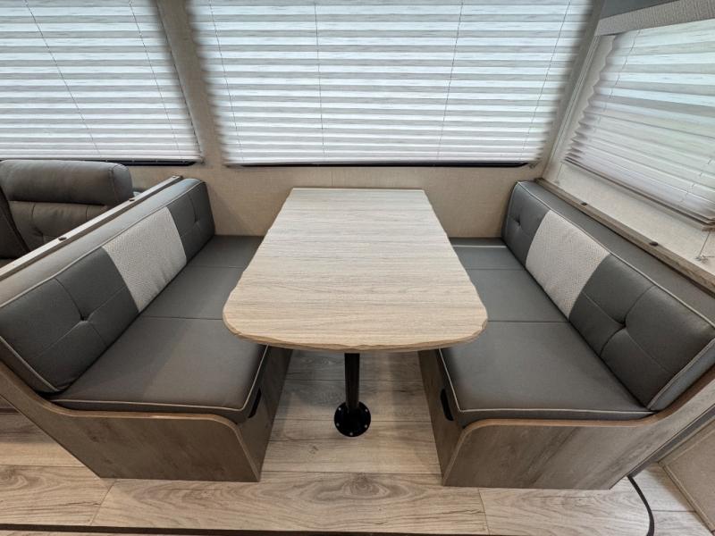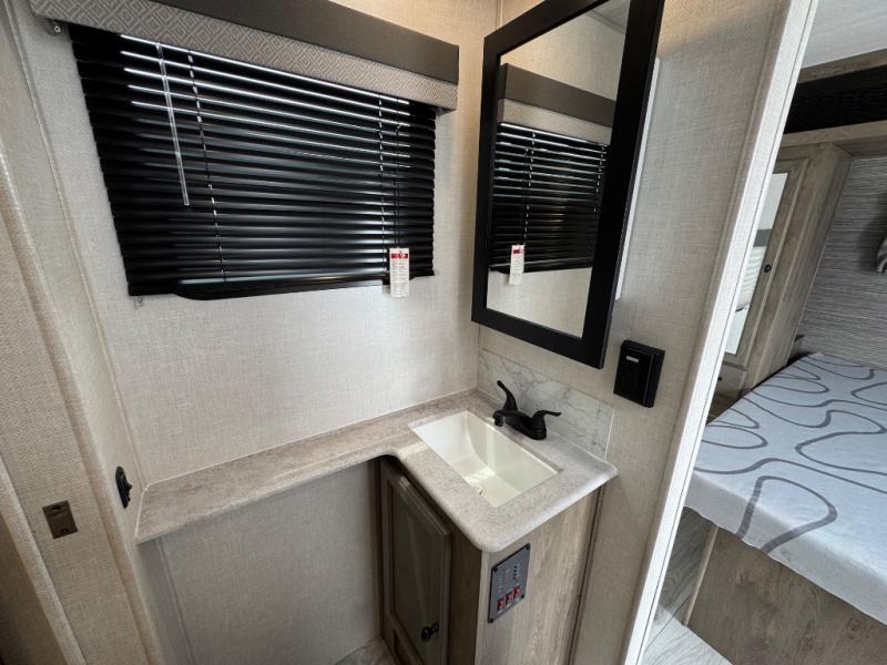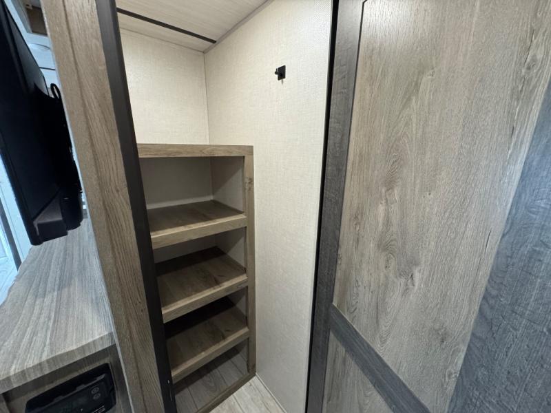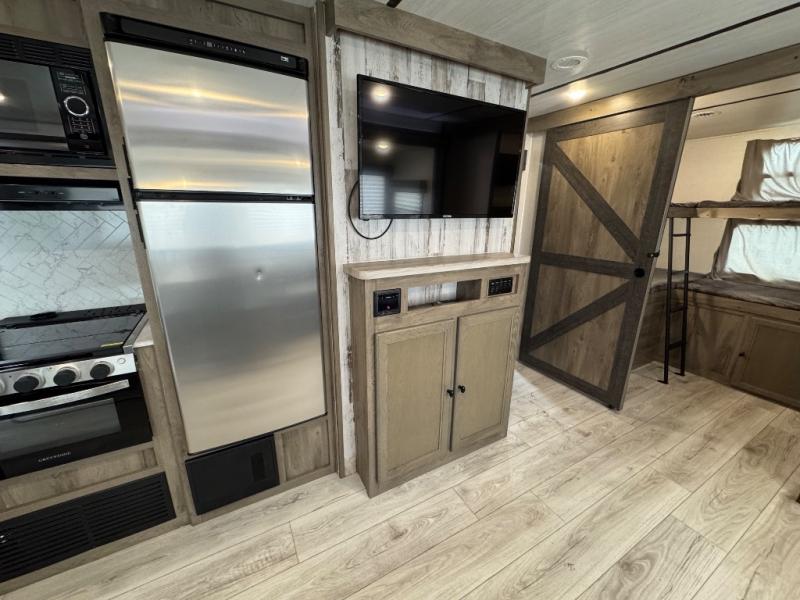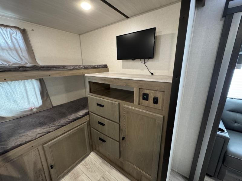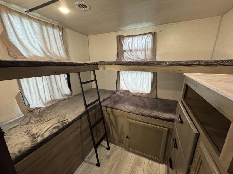 This spacious travel trailer is perfect for those who need plenty of sleeping space! There are four bunks in the bunkhouse for little ones or your friends, and the front master bedroom will feel just like home with its queen-size bed and dual drawers. You'll find a sofa and U-shaped dinette within the large slide in the main living area, and there is a walk-in pantry to store food, jackets, or umbrellas. Don't overlook the exterior that includes an outside kitchen, a 21' one touch electric awning, and outside storage!