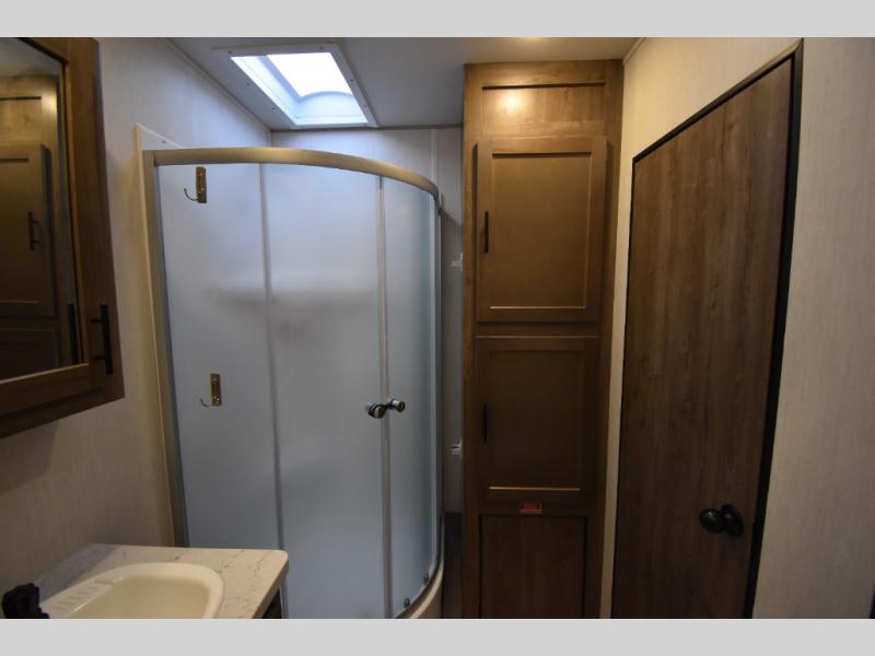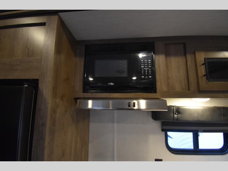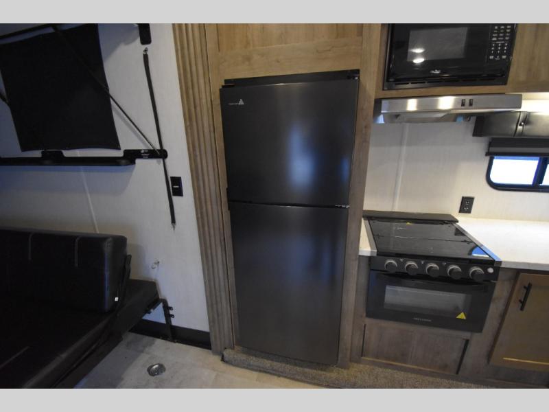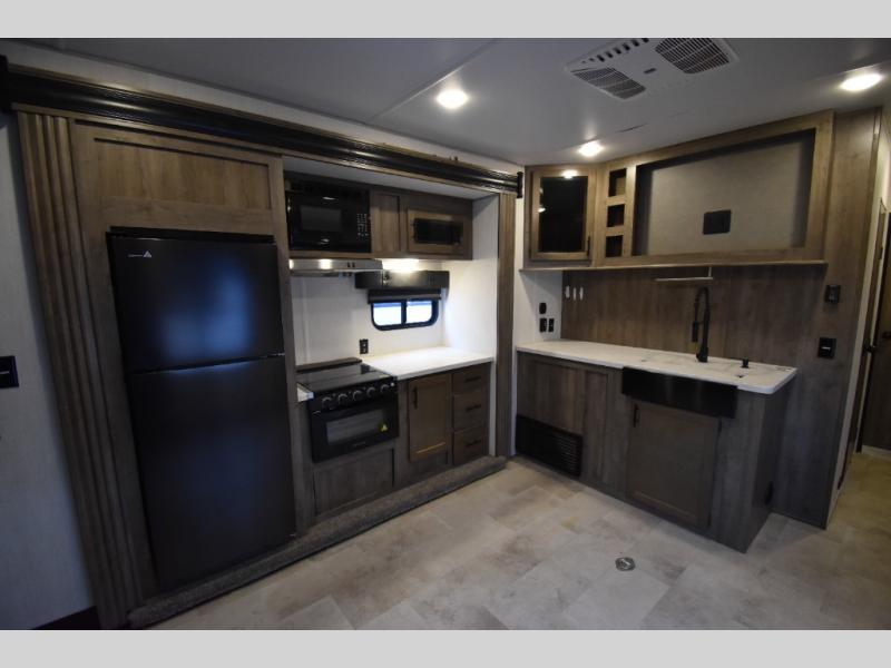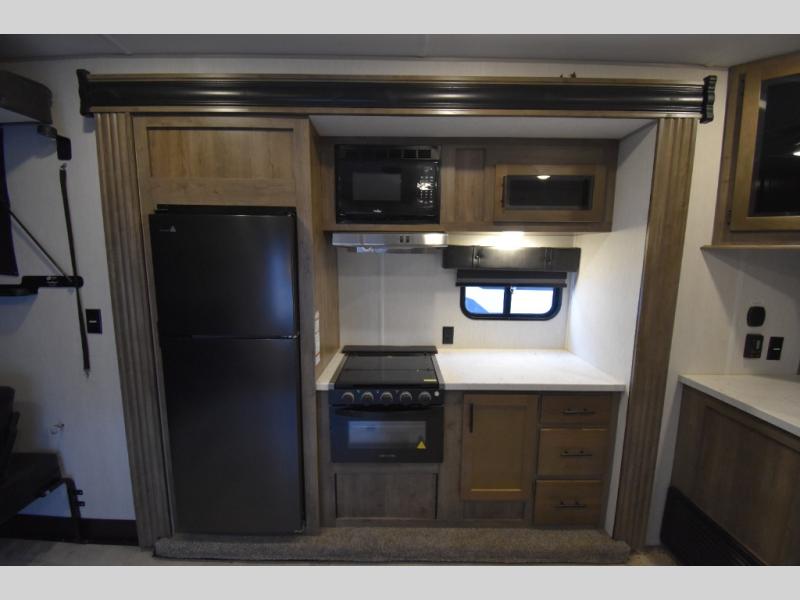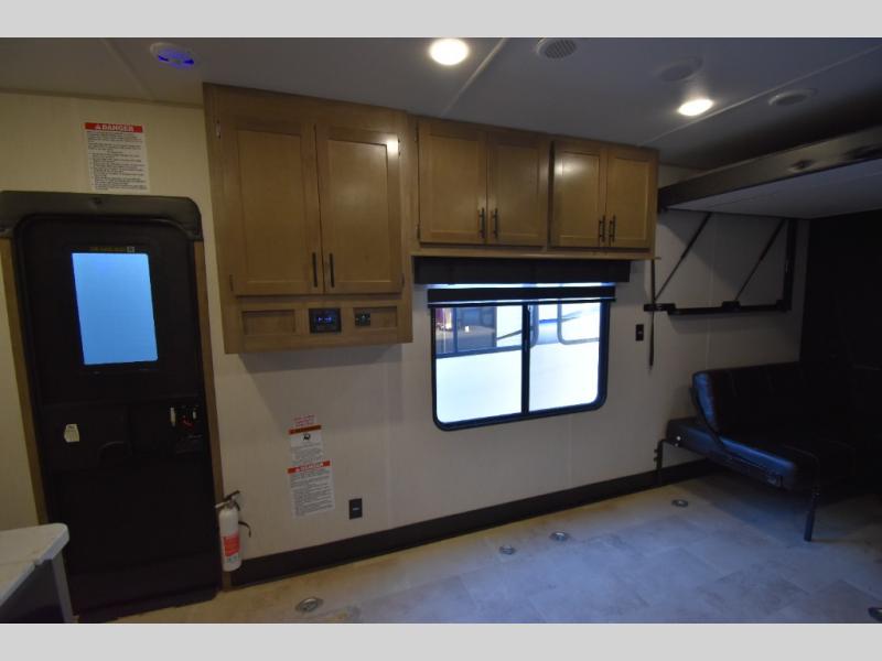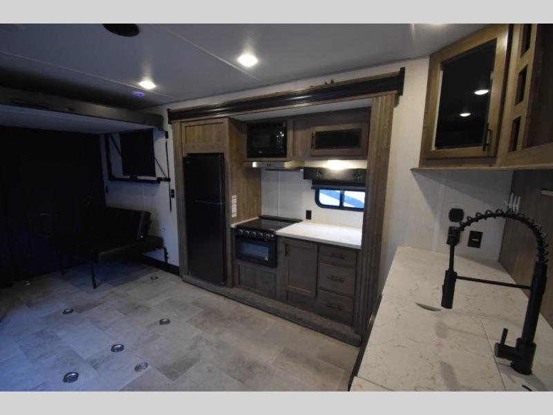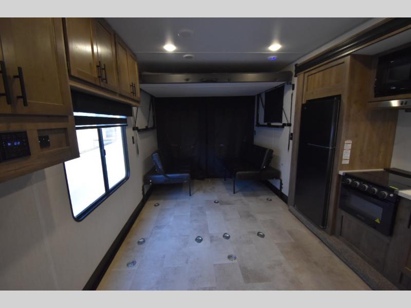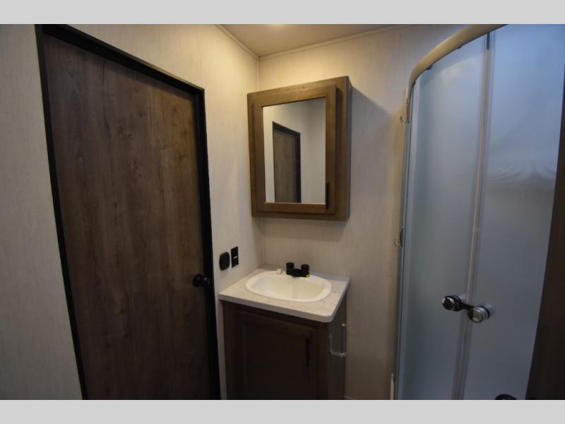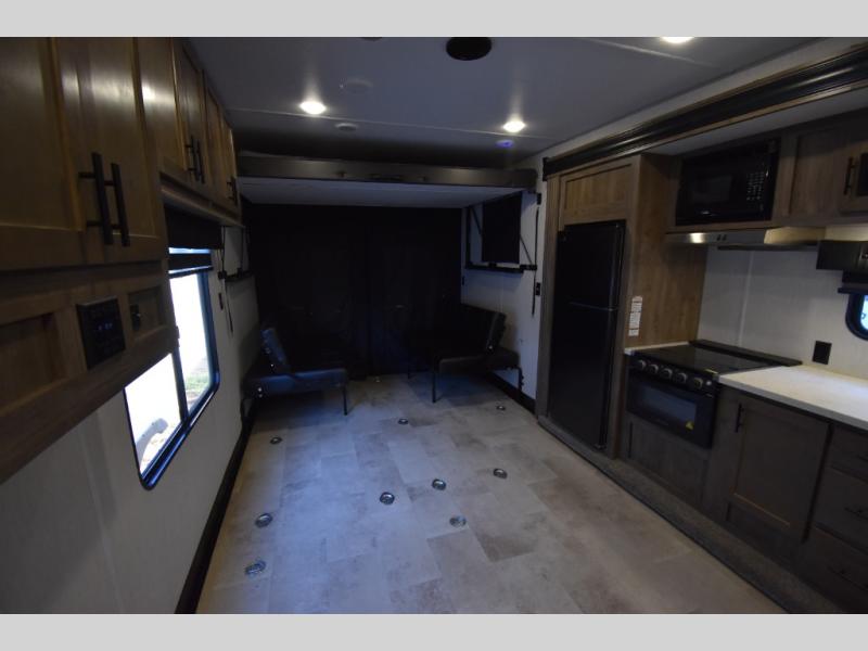 Camping with your favorite ride-on toys is easier than ever in this toy hauler. The 15' total garage space provides tons of space for your gear, plus there is a slide out that will give the chef more room to cook meals. Relax on the roll-overs sofas or add the optional lounge chairs for a more at-home feel. There is plenty of counter space in the kitchen, plus a pantry for snacks or dry goods. You will appreciate the dual entry bath that will give you a private entrance into the front bedroom. Here, you can sleep soundly on the king bed and store your clothes in the dual wardrobes.