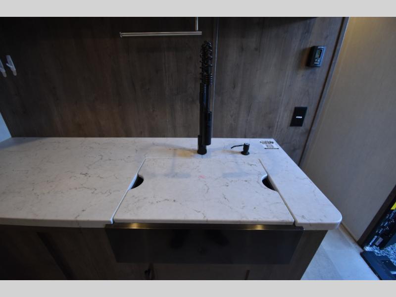 The Vengeance Rogue by Forest River is a budget-friendly toy hauler that you can really get on board with! Some of the features within the Rogue Platinum Package are the zebra shades that will keep light out, a glass shower enclosure, ultracold heated holding tank pads, and much more. There is an outside shower with hot and cold water so you can fill the dogs water bowl or wash the mud from your riding gear, and the enclosed underbelly will allow you to extend your camping season. You will love the look of the residential black stainless steel farm sink, along with seamless countertops and LED interior lighting with accents.