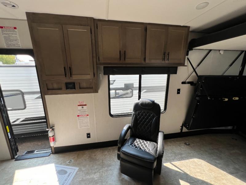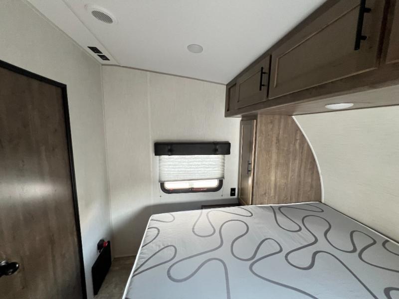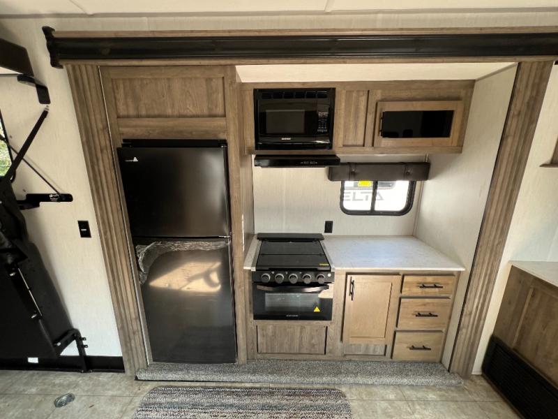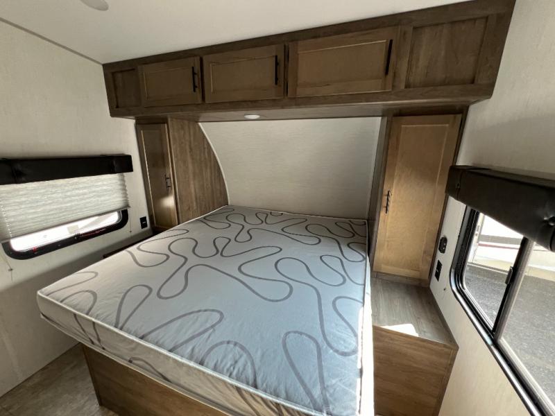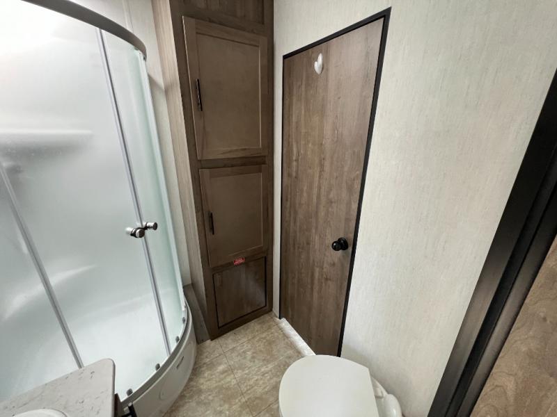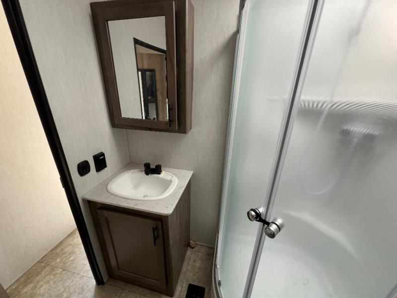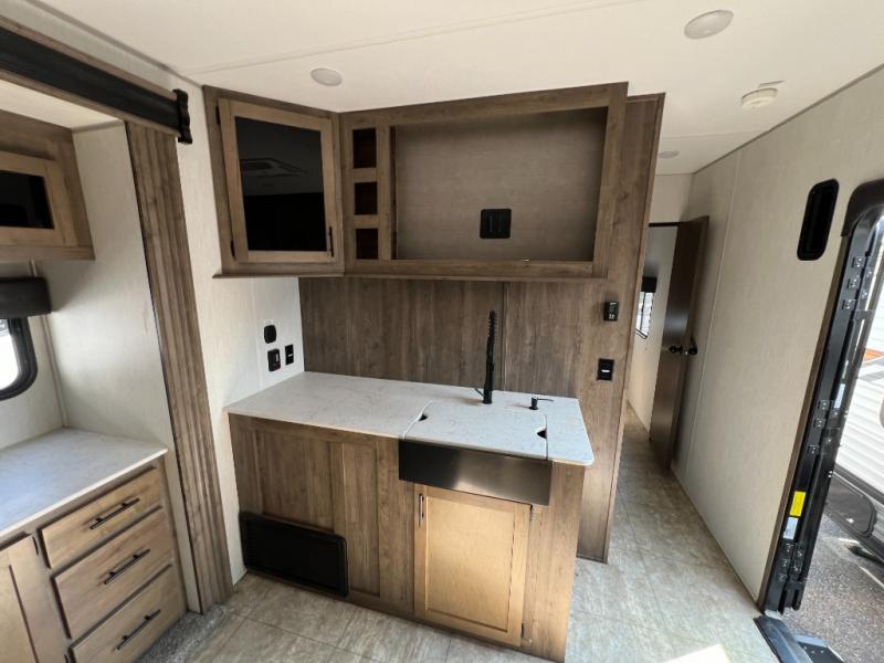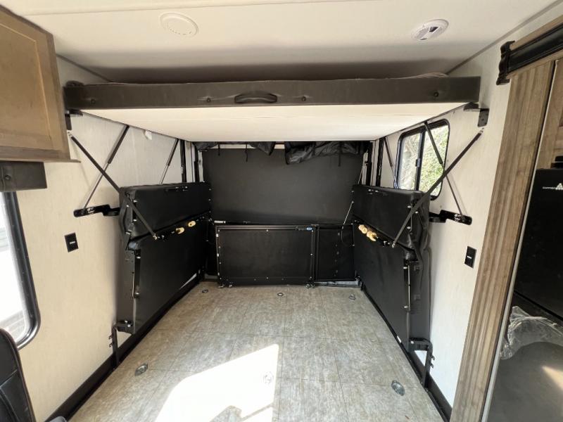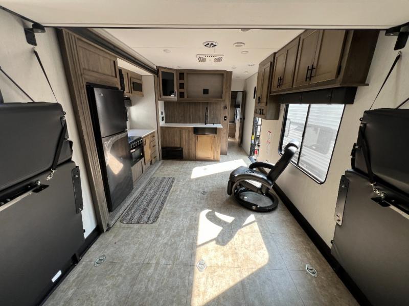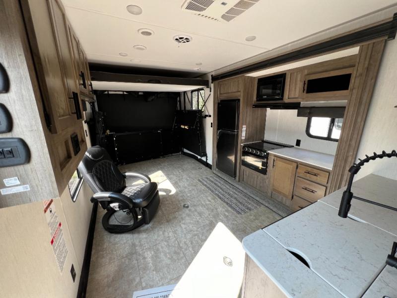 Camping with your favorite ride-on toys is easier than ever in this toy hauler. The 15' total garage space provides tons of space for your gear, plus there is a slide out that will give the chef more room to cook meals. Relax on the roll-overs sofas or add the optional lounge chairs for a more at-home feel. There is plenty of counter space in the kitchen, plus a pantry for snacks or dry goods. You will appreciate the dual entry bath that will give you a private entrance into the front bedroom. Here, you can sleep soundly on the king bed and store your clothes in the dual wardrobes.