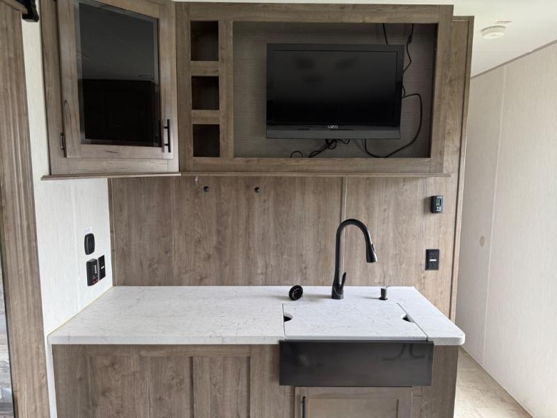 Camping with your favorite ride-on toys is easier than ever in this toy hauler. The 15' total garage space provides tons of space for your gear, plus there is a slide out that will give the chef more room to cook meals. Relax on the roll-overs sofas or add the optional lounge chairs for a more at-home feel. There is plenty of counter space in the kitchen, plus a pantry for snacks or dry goods. You will appreciate the dual entry bath that will give you a private entrance into the front bedroom. Here, you can sleep soundly on the king bed and store your clothes in the dual wardrobes.