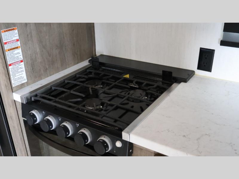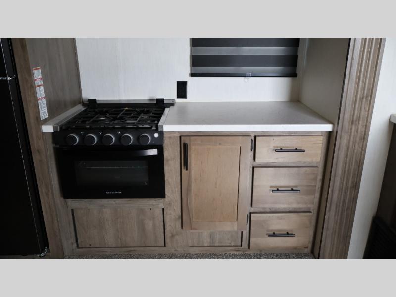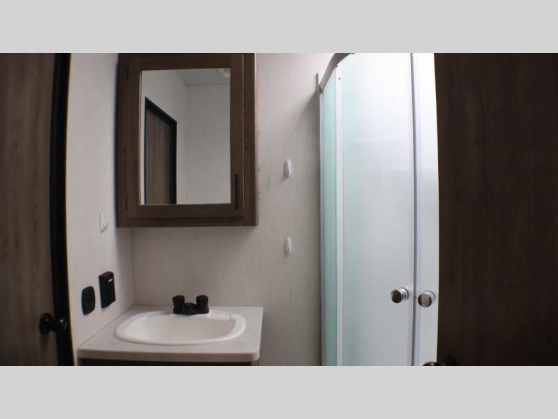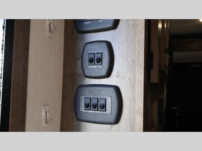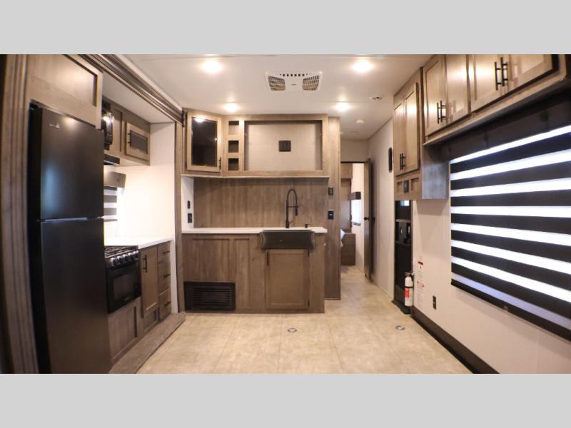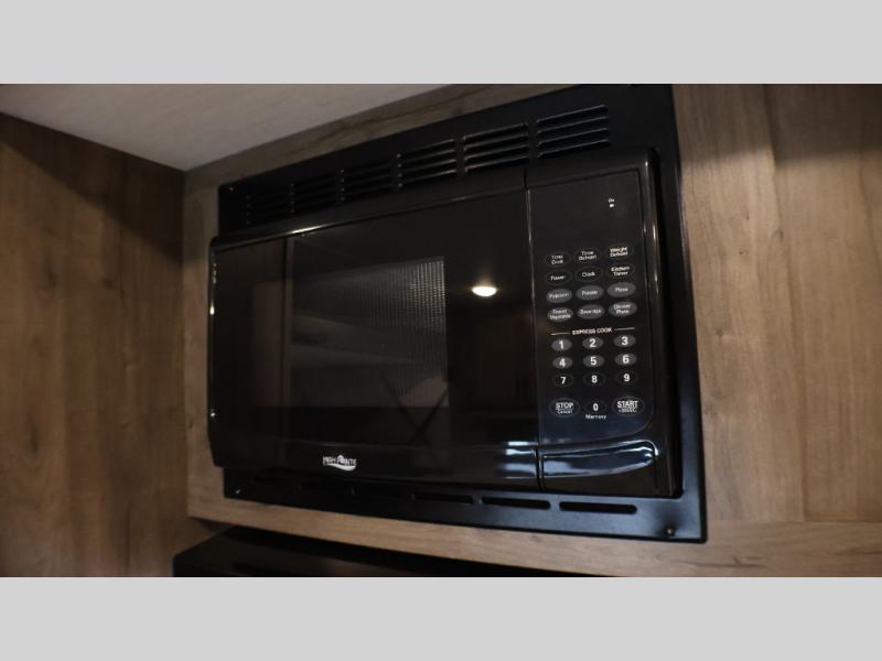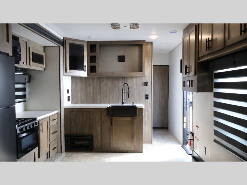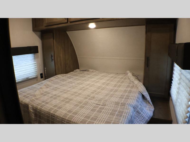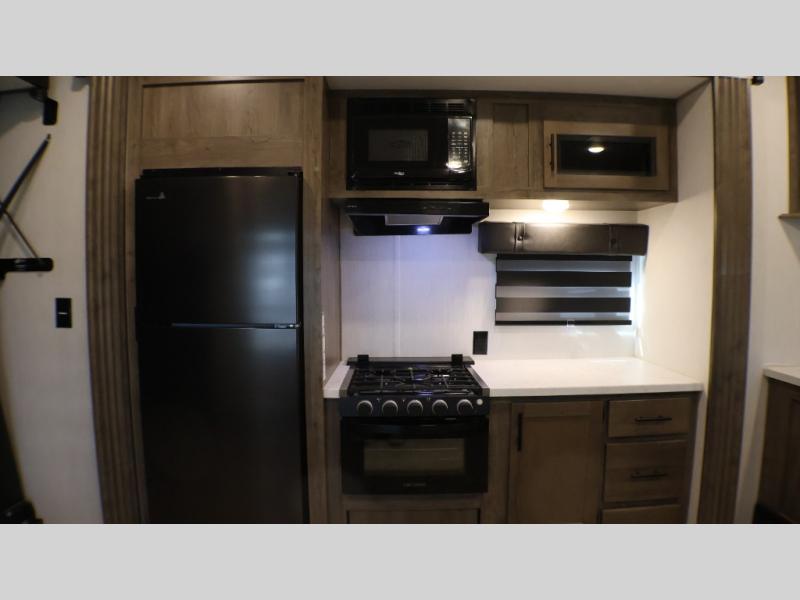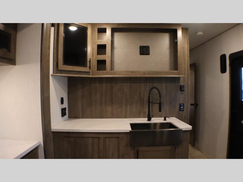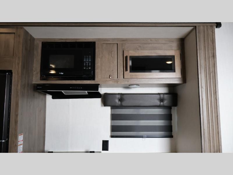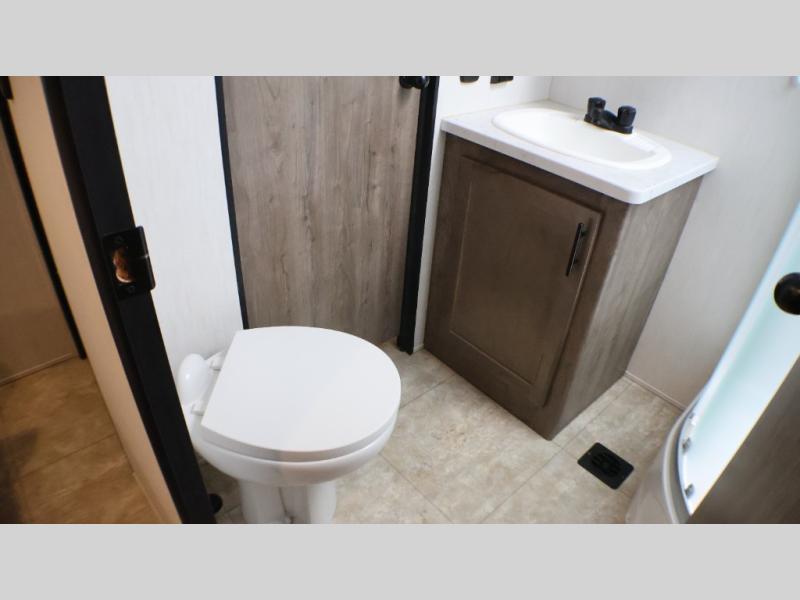 Camping with your favorite ride-on toys is easier than ever in this toy hauler. The 15' total garage space provides tons of space for your gear, plus there is a slide out that will give the chef more room to cook meals. Relax on the roll-overs sofas or add the optional lounge chairs for a more at-home feel. There is plenty of counter space in the kitchen, plus a pantry for snacks or dry goods. You will appreciate the dual entry bath that will give you a private entrance into the front bedroom. Here, you can sleep soundly on the king bed and store your clothes in the dual wardrobes.