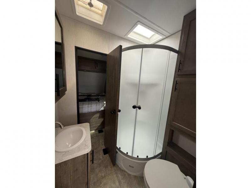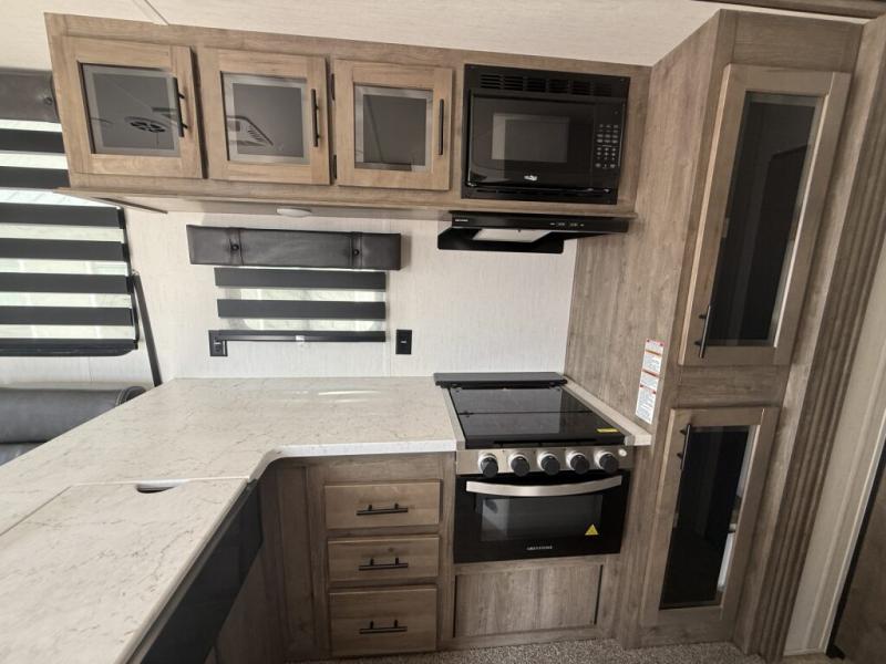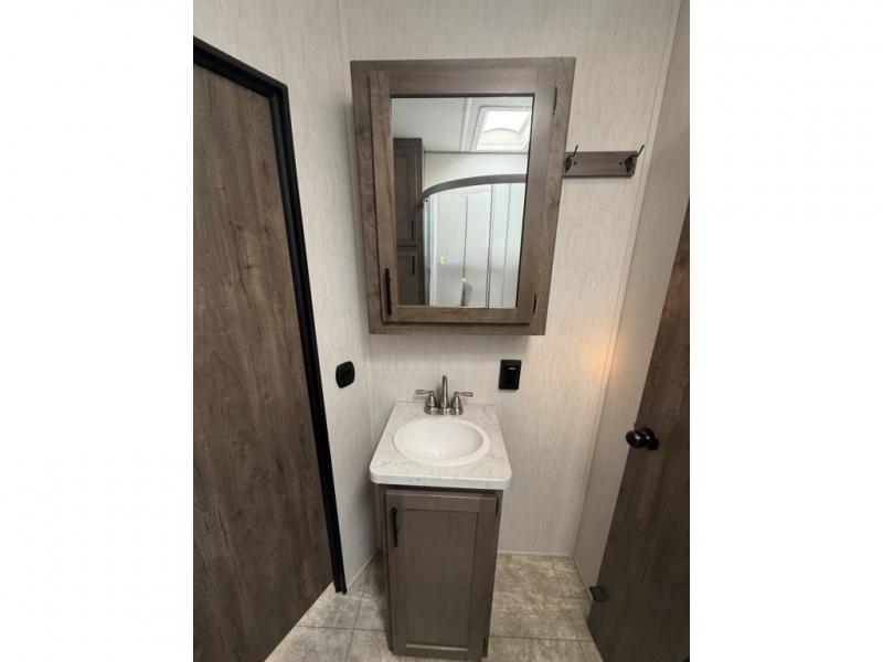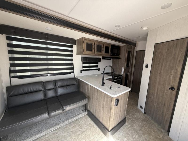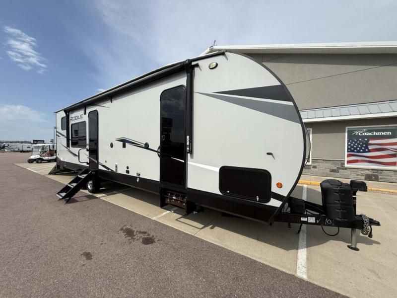 The Vengeance Rogue by Forest River is a budget-friendly toy hauler that you can really get on board with! Some of the features within the Rogue Platinum Package are the zebra shades that will keep light out, a glass shower enclosure, ultracold heated holding tank pads, and much more. There is an outside shower with hot and cold water so you can fill the dogs water bowl or wash the mud from your riding gear, and the enclosed underbelly will allow you to extend your camping season. You will love the look of the residential black stainless steel farm sink, along with seamless countertops and LED interior lighting with accents.