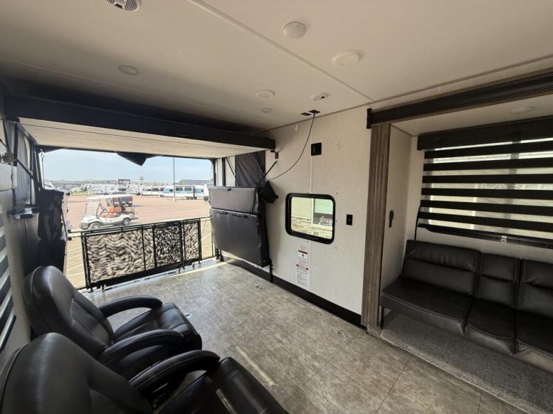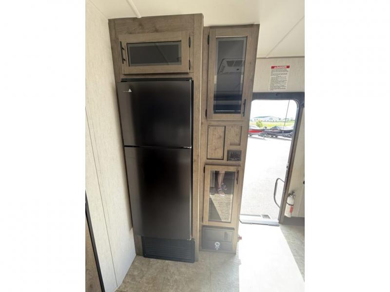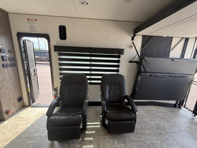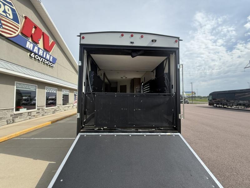 Bring along your kayaks, dirt bikes, or even a side-by-side in this toy hauler. There is 15' 10" total garage space, and a ramp door for easy unloading. Once your toys are out, enjoy lunch at the roll-over sofas, or let your guests rest on the quick set queen bed system before heading out. There is a dual entry bath to clean up in each day, and the Rogue king bed is sure to bring sweet dreams. In the morning, prepare eggs and bacon on the three burner cooktop, and the milk can go back in the 10.1 cu. ft. residential refrigerator. This model also includes a flip-up sofa for more seating and sleeping space, and you can add the optional lounge chairs too!