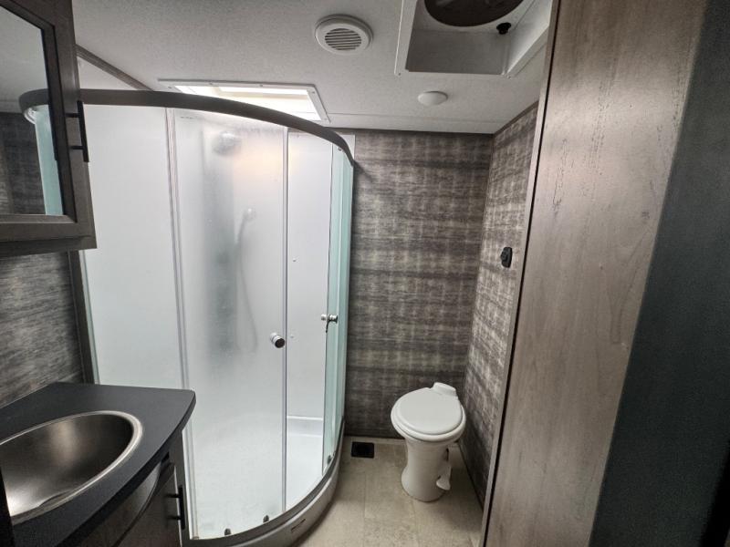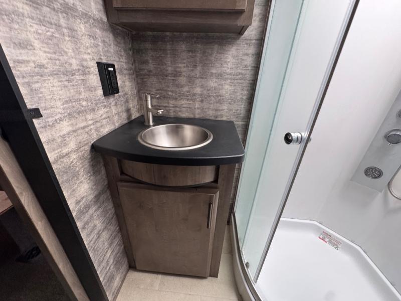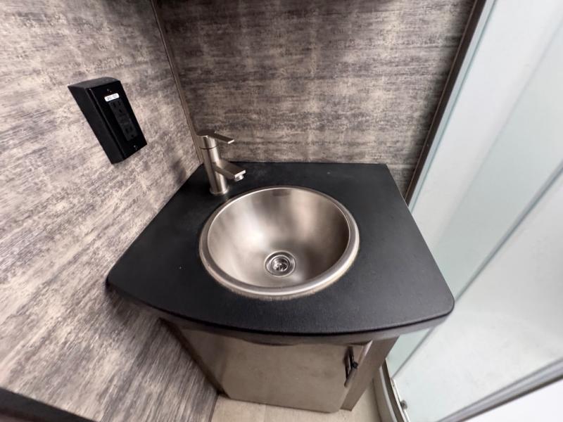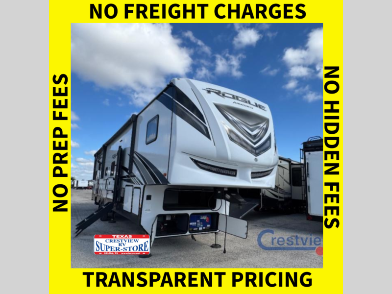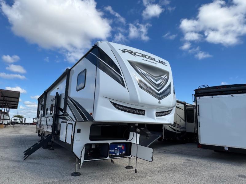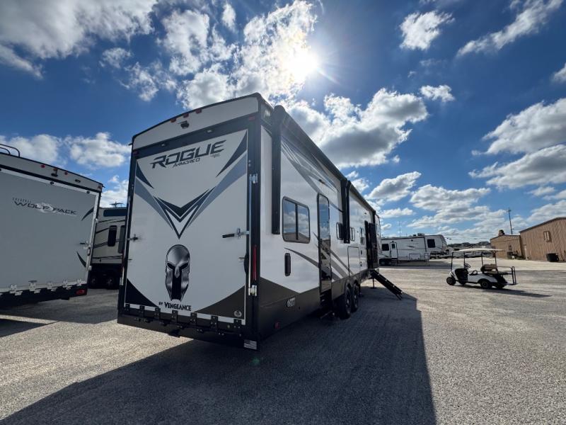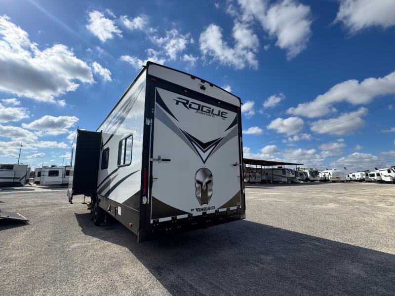 Every one of these Forest River Vengeance Rogue Armored fifth wheel toy haulers come with the features you want most at an affordable price tag! The DUR-A-POXY cargo floor has 5,000 lb. tie downs to ensure your toys will arrive safely without damaging the flooring, plus the 8' ramp door makes it easy to load them. A 15,000 BTU air conditioner will keep you cool even on the hottest summer days. An enclosed and heated underbelly keeps your unit's vitals protected and a central docking station makes life a little easier. The Rogue Armored package comes with a six point leveling system, a comfort plus adjustable powered king bed system, and a ramp door patio system. You can be sure to find one that fits your needs!