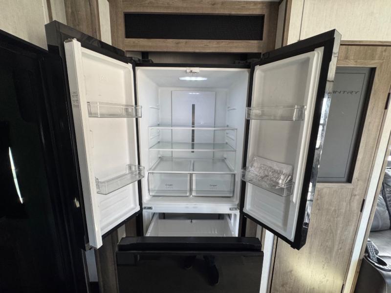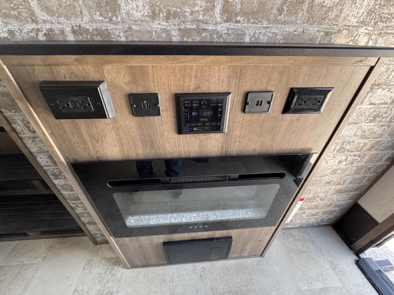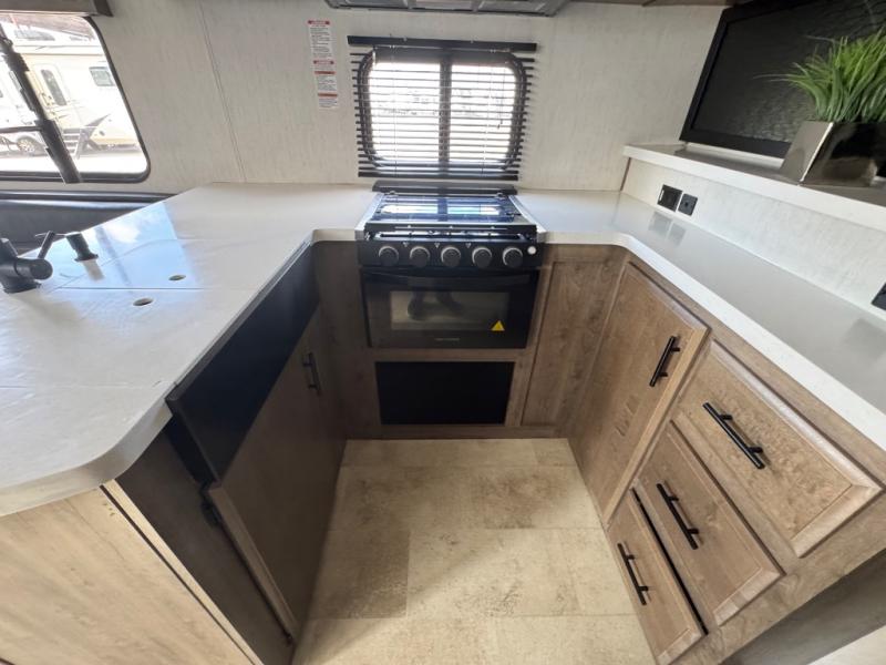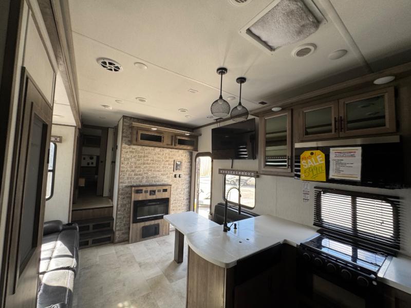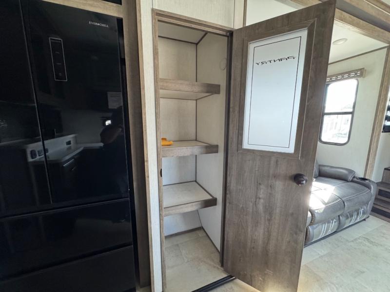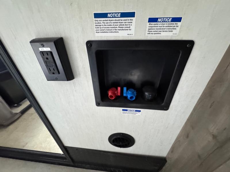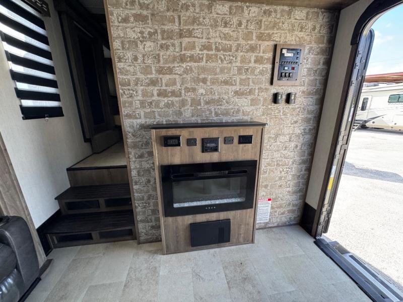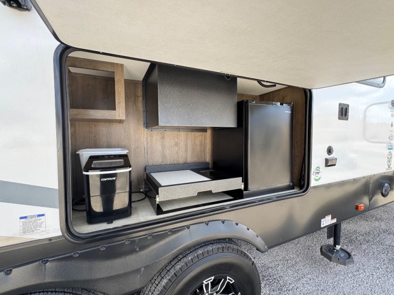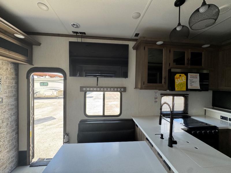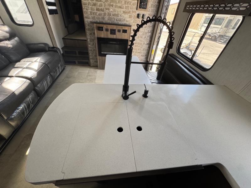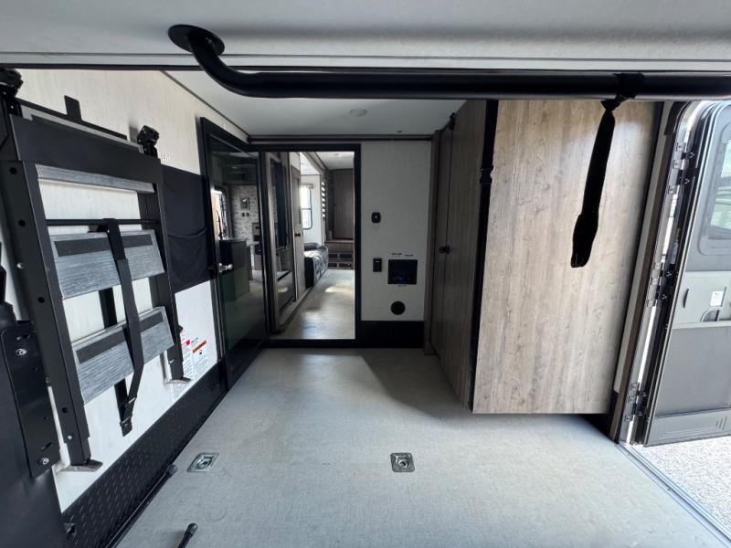 With dual entry doors, you will experience a smooth flow of traffic in and out of this fifth wheel toy hauler! The middle kitchen/living area is set up perfectly for the chef to prepare a delicious meal while others socialize with them at the dinette with a bench or the sofa. You could even prepare breakfast at the outdoor kitchen to enjoy the beautiful sunrise. The 13' garage area has opposing flip-up sofas with a table in between and a raised queen bed above, as well as a loft and a half bathroom. The front private bedroom has king bed for a good night's rest, a wardrobe/dresser slide, and an entrance into the dual entry bathroom!
