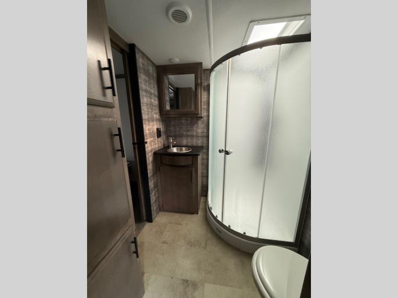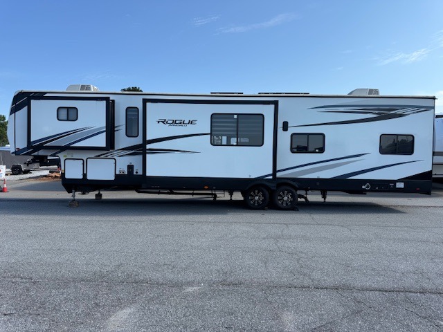 Every one of these Forest River Vengeance Rogue Armored fifth wheel toy haulers come with the features you want most at an affordable price tag! The DUR-A-POXY cargo floor has 5,000 lb. tie downs to ensure your toys will arrive safely without damaging the flooring, plus the 8' ramp door makes it easy to load them. A 15,000 BTU air conditioner will keep you cool even on the hottest summer days. An enclosed and heated underbelly keeps your unit's vitals protected and a central docking station makes life a little easier. The Rogue Armored package comes with a six point leveling system, a comfort plus adjustable powered king bed system, and a ramp door patio system. You can be sure to find one that fits your needs!