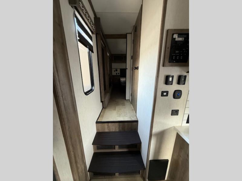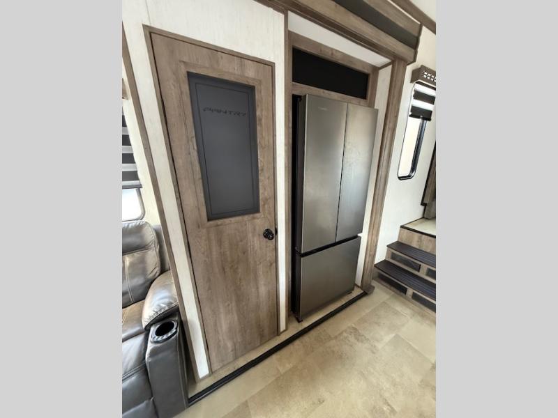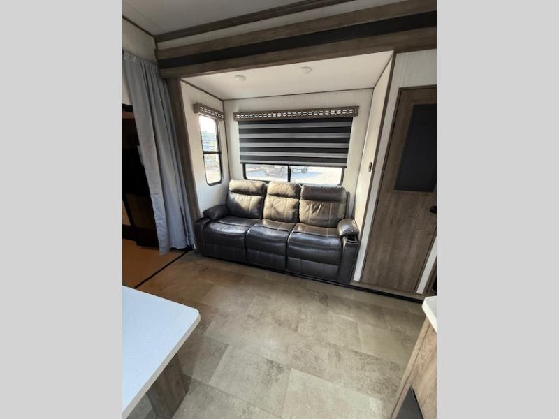 The whole gang can join in on the fun with this fifth wheel toy hauler! Everyone will have a comfortable place to sleep between the king bed in the front private bedroom, the raised queen bed above the flip-up sofas with table in between, and the loft, plus you can even use the sofa in the living area. The large kitchen pantry is big enough to hold your favorite snacks and the dinette with bench is another place to enjoy your meals comfortably. A few other conveniences you will appreciate include dual entry doors, a dual entry bathroom, two 15' power awnings, and 14' 6" of cargo space!