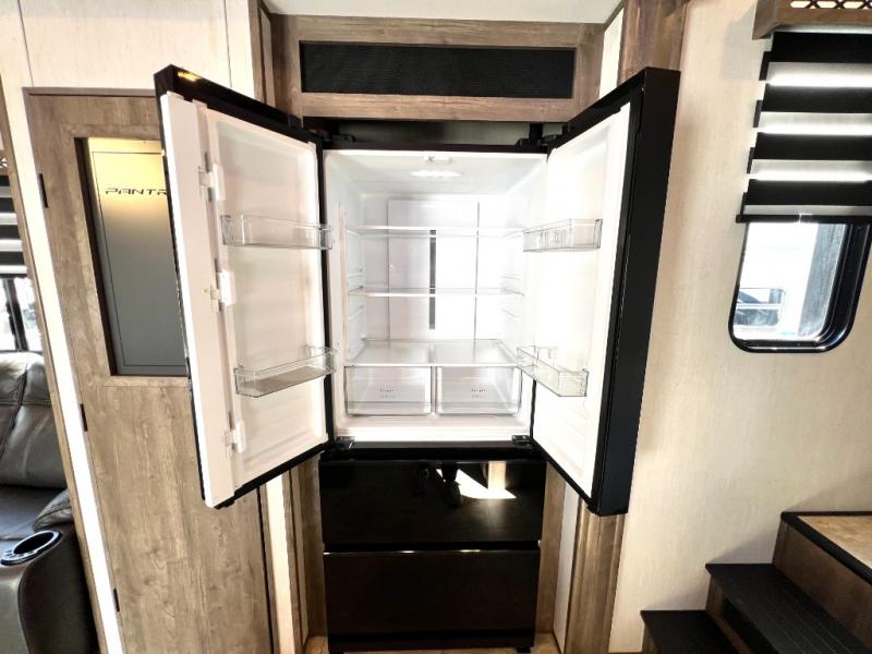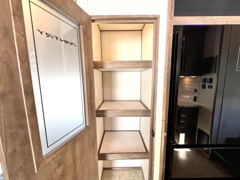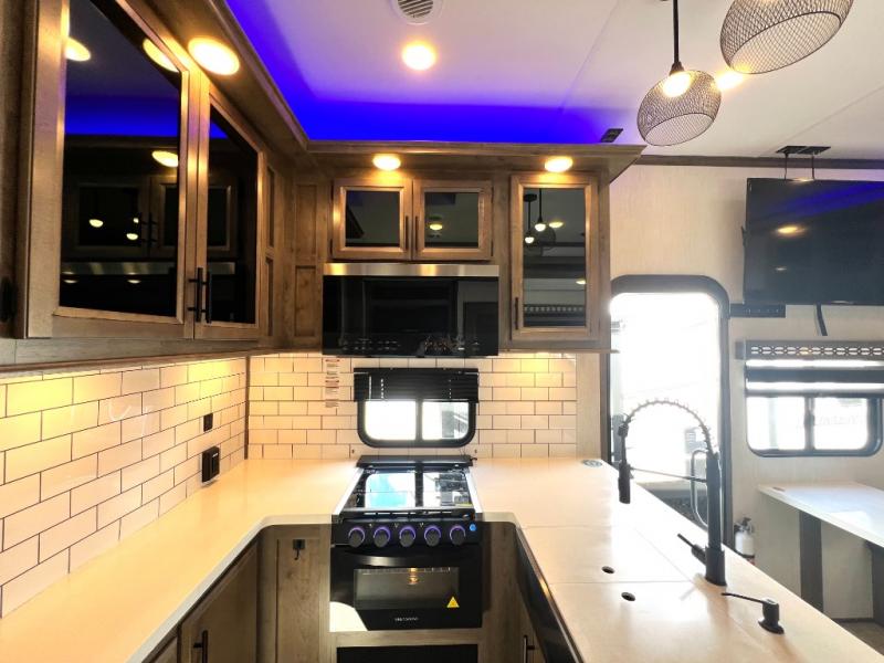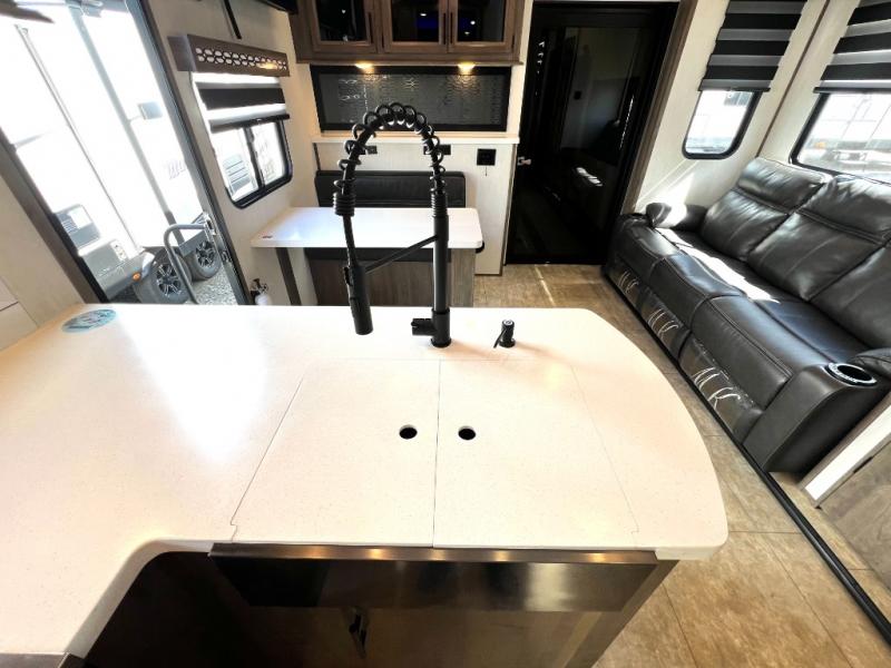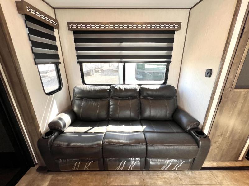 The whole gang can join in on the fun with this fifth wheel toy hauler! Everyone will have a comfortable place to sleep between the king bed in the front private bedroom, the raised queen bed above the flip-up sofas with table in between, and the loft, plus you can even use the sofa in the living area. The large kitchen pantry is big enough to hold your favorite snacks and the dinette with bench is another place to enjoy your meals comfortably. A few other conveniences you will appreciate include dual entry doors, a dual entry bathroom, two 15' power awnings, and 14' 6" of cargo space!