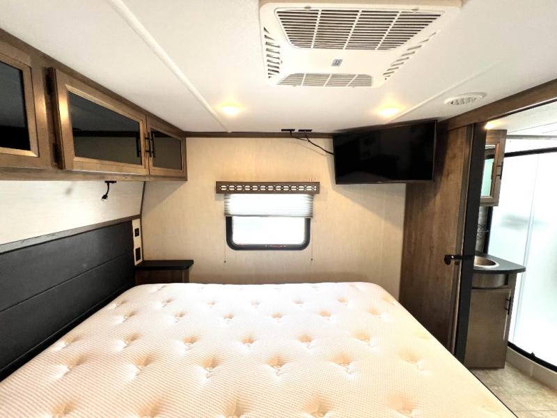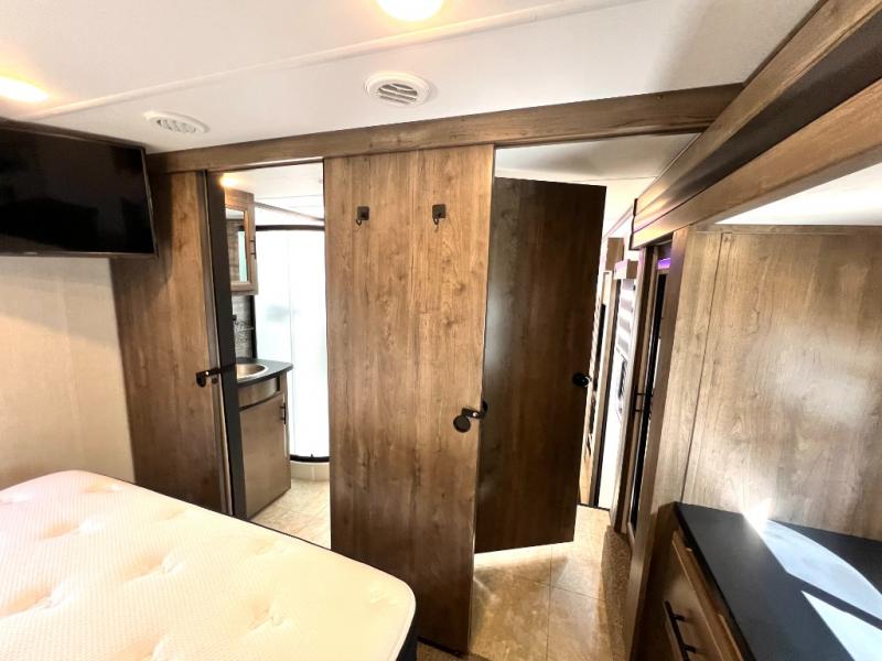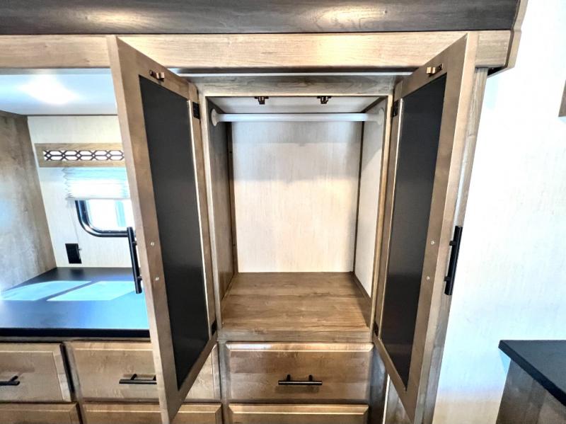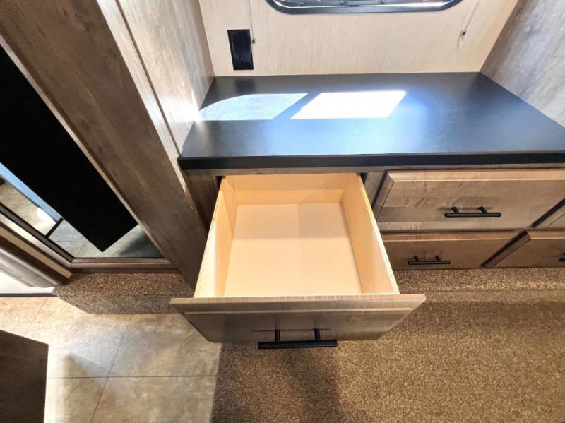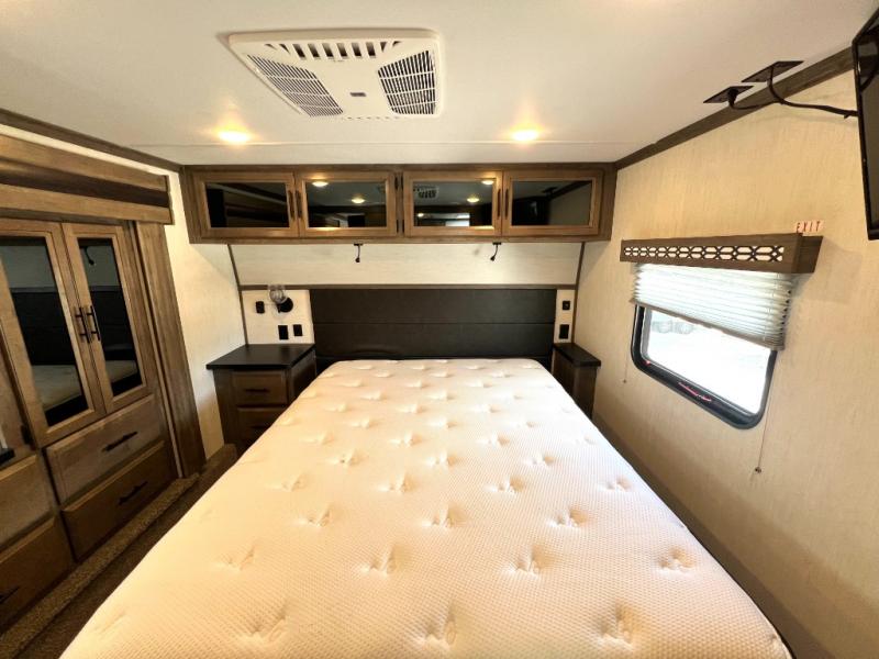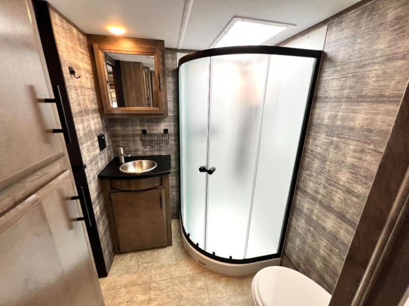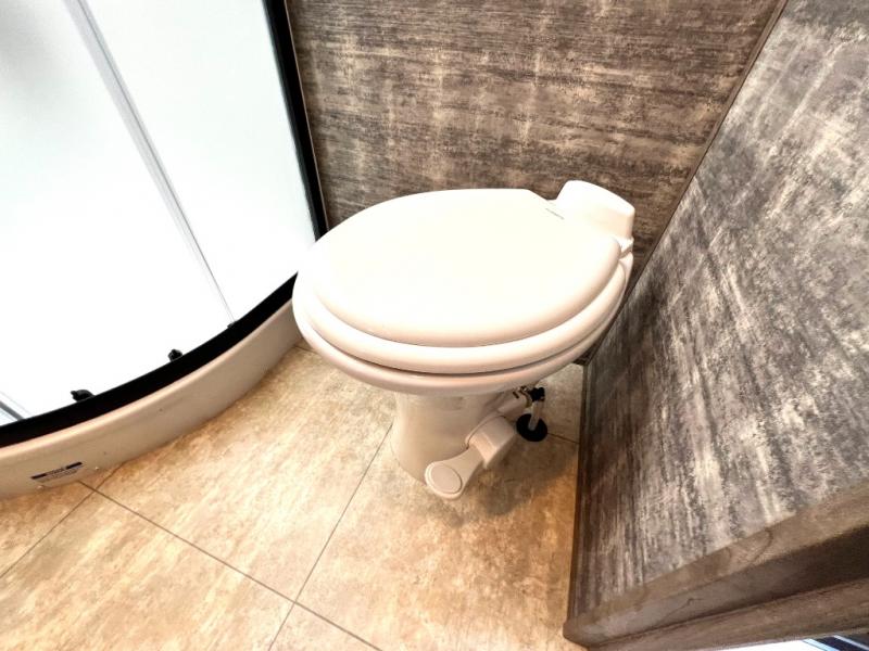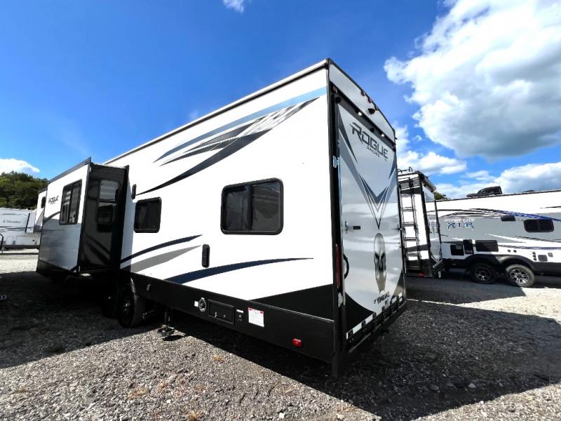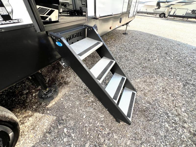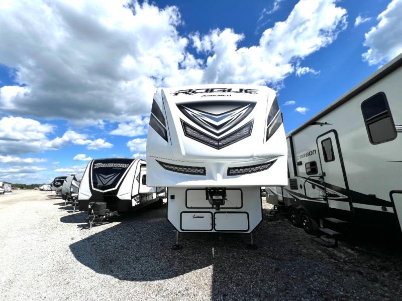 Every one of these Forest River Vengeance Rogue Armored fifth wheel toy haulers come with the features you want most at an affordable price tag! The DUR-A-POXY cargo floor has 5,000 lb. tie downs to ensure your toys will arrive safely without damaging the flooring, plus the 8' ramp door makes it easy to load them. A 15,000 BTU air conditioner will keep you cool even on the hottest summer days. An enclosed and heated underbelly keeps your unit's vitals protected and a central docking station makes life a little easier. The Rogue Armored package comes with a six point leveling system, a comfort plus adjustable powered king bed system, and a ramp door patio system. You can be sure to find one that fits your needs!