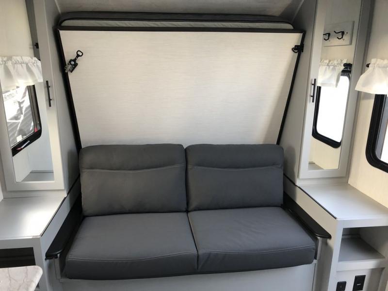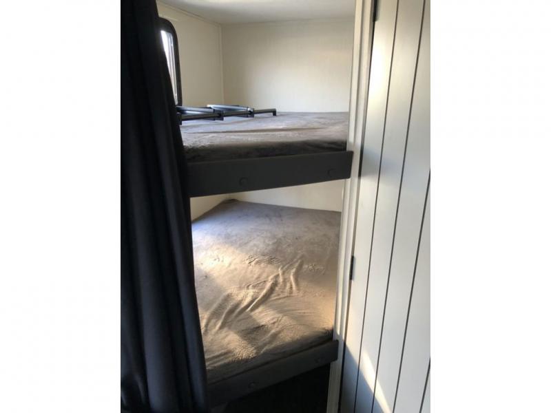 This double axle travel trailer will comfortably be your home away from home on all your adventures. Once you arrive at your destination, grab the fishing pole from the pass-through storage, then head down to the river. When you return, the chef of your group can prepare lunch on the three burner cooktop or use the exterior kitchen option that includes an outdoor grill. You will find sleeping space on the Murphy bed when the jackknife sofa in front isn't being used, and the kids will love having double-size bunks. There is also a booth dinette that will be perfect for meal times, game night, and additional sleeping space.