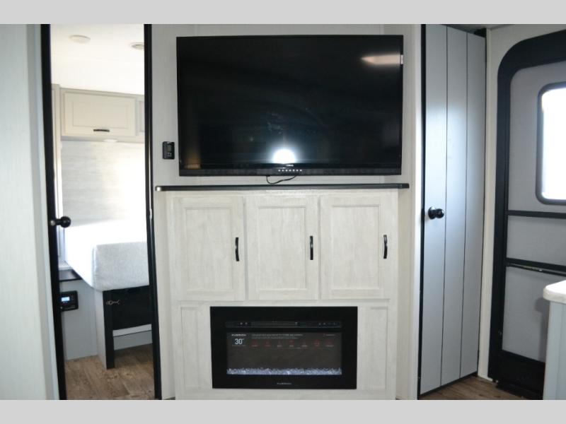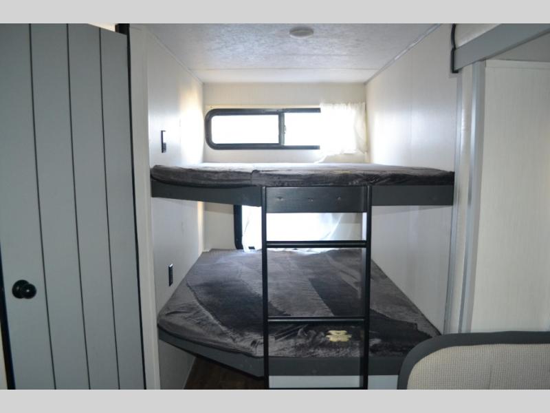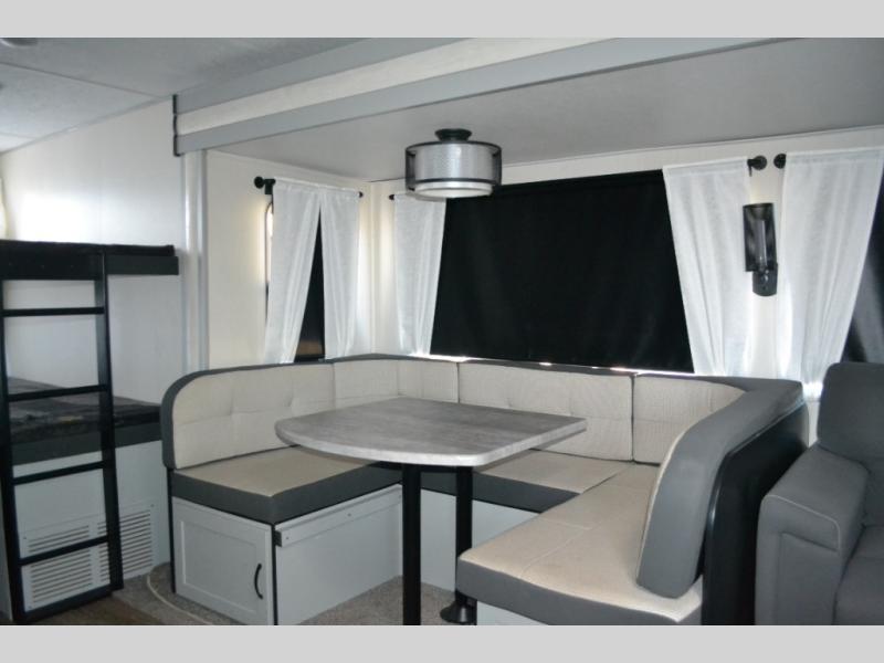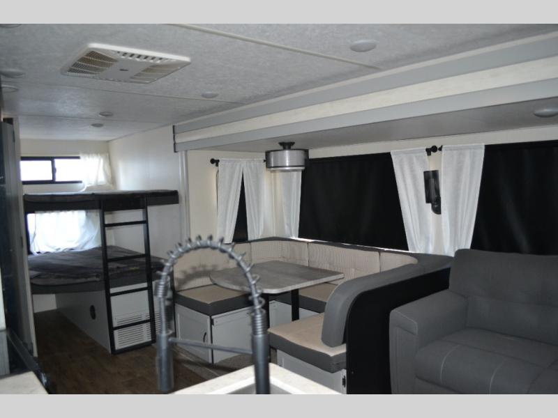 Are you looking to upgrade your RV to a trailer with more space and more features? Look no further than this Vibe that can sleep ten people each night. The kids are sure to claim the double-size bunks to themselves, while the adults take the front private bedroom with the queen bed. You will find even more sleeping space on the U-shaped dinette and sleeper sofa within the large slide out. After a day outdoors at the lake, get cleaned up in the full bath that includes a 40" x 30" walk-in shower and its own exterior entry door for convenience. There is so much more to love about this model, like the fireplace and entertainment center, the oversized panoramic windows, and the large pass-through storage for all your gear!