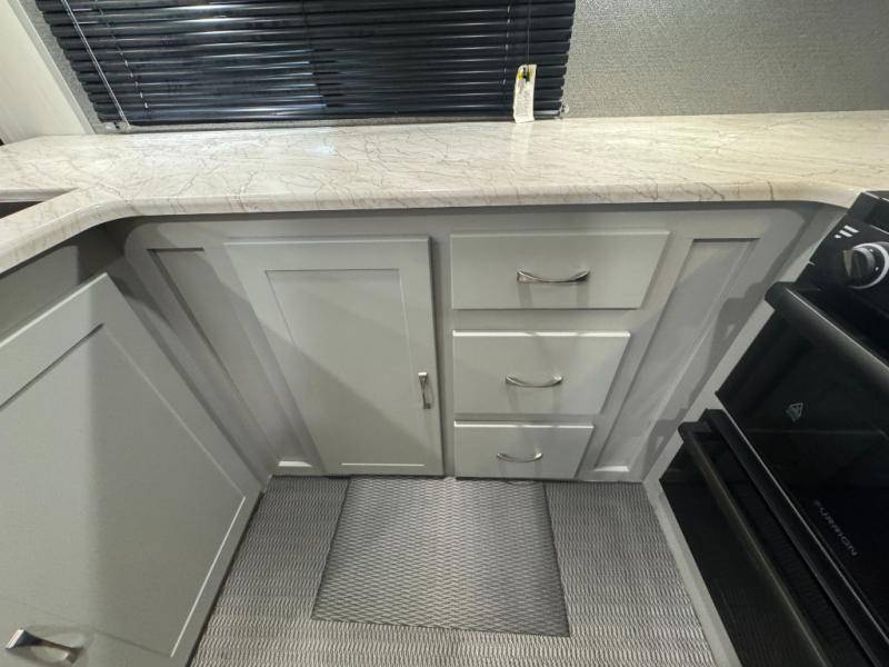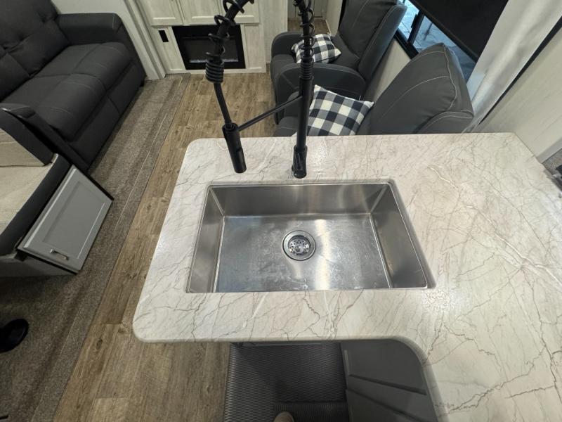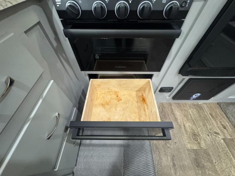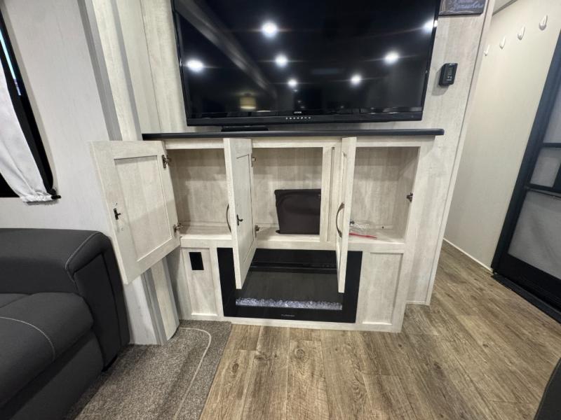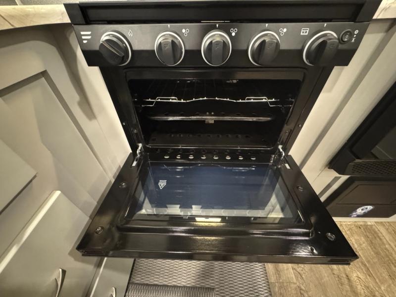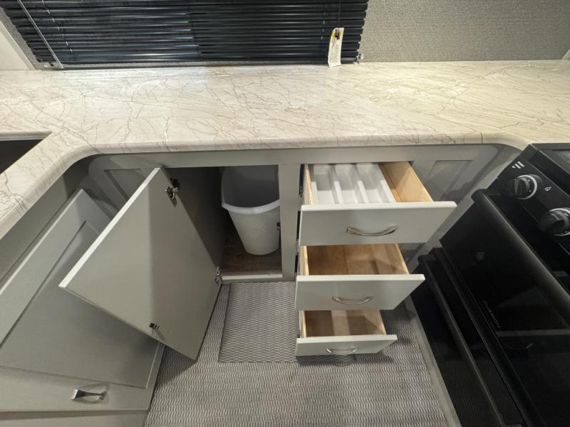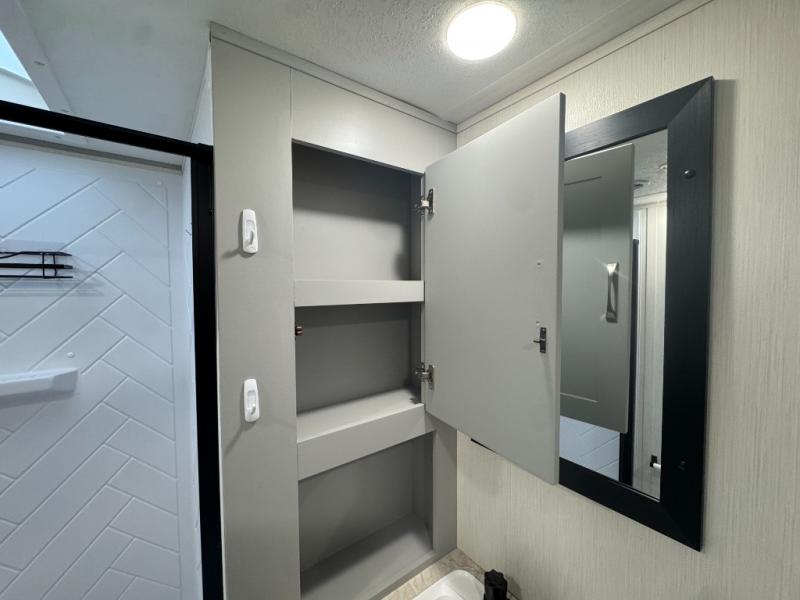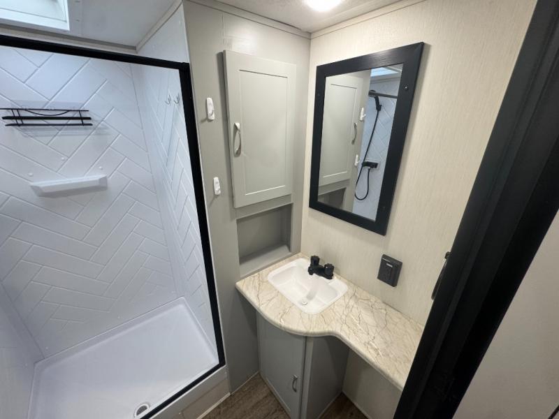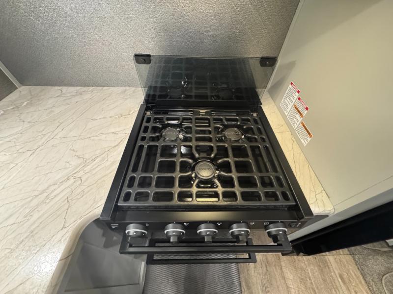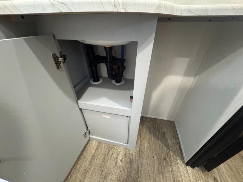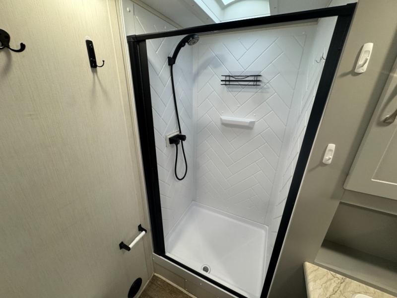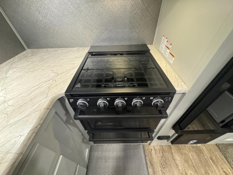 Escape to the Great Outdoors in this Vibe travel trailer. Once you arrive at your campsite, set up the 18' electric awning with LED lights, then grab the fishing poles from the large pass-through storage. You may want to make a quick lunch on the universal outside kitchen before heading out. If the weather isn't cooperating, you can cook on the three burner cooktop or in stainless steel 17' oven, and there is even a residential refrigerator to hold all your ingredients. The spacious full bath includes a 36" x 30" walk-in shower to clean up every day, and there is a linen closet to store clean towels and necessities.