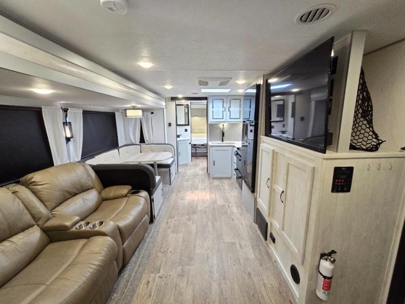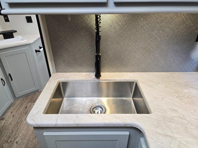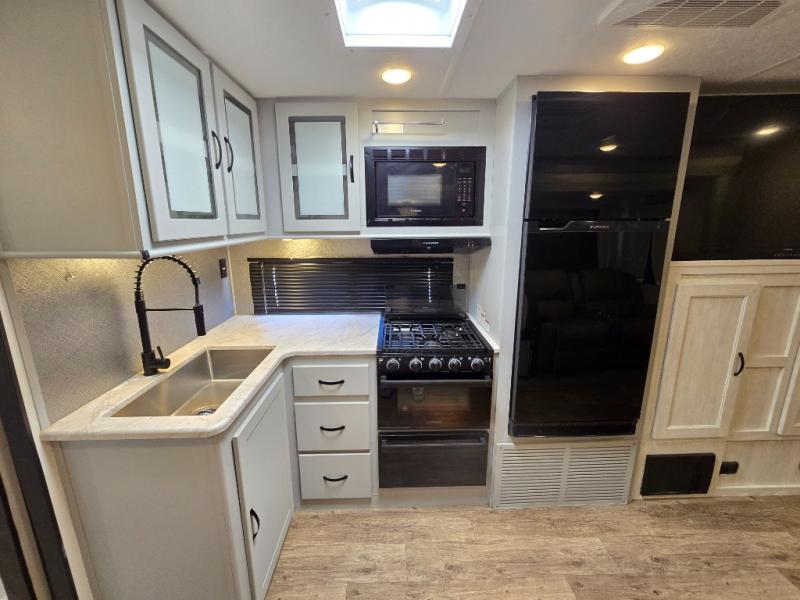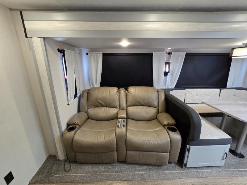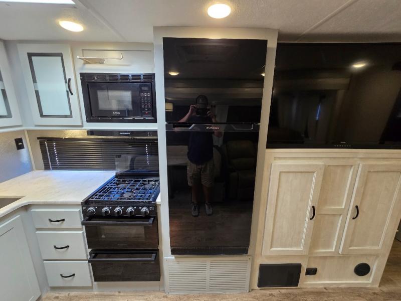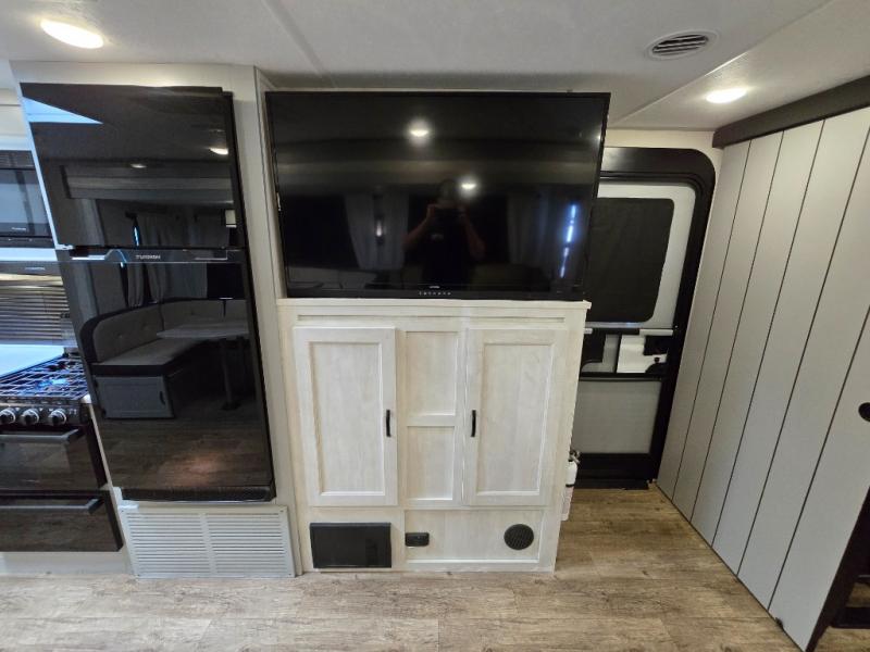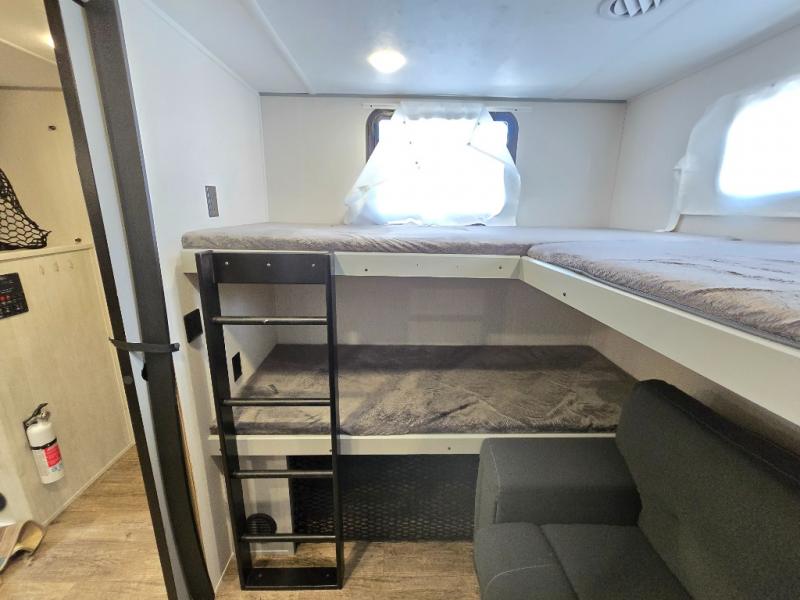 This travel trailer will feel just like home with a private bunkhouse for the kids, and a front master bedroom for mom and dad. The walk-though bath is both spacious and convenient, and the large slide out will provide enough space to let the dog nap on the floor. Play a game around the U-shaped dinette or relax on the sleeper sofa during movie night. The chef of the group can cook indoors or outdoors on the universal outside kitchen. There is even outside TV prep so you can bring your own TV to enjoy the big game outdoors!