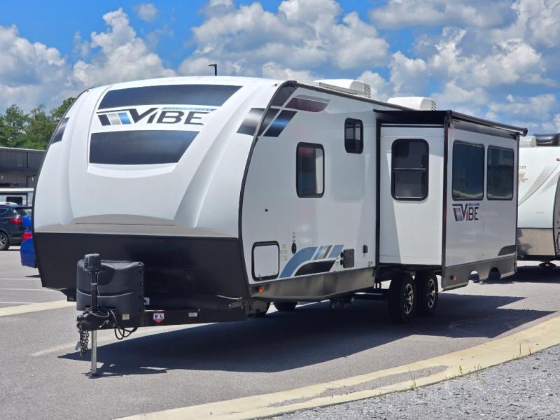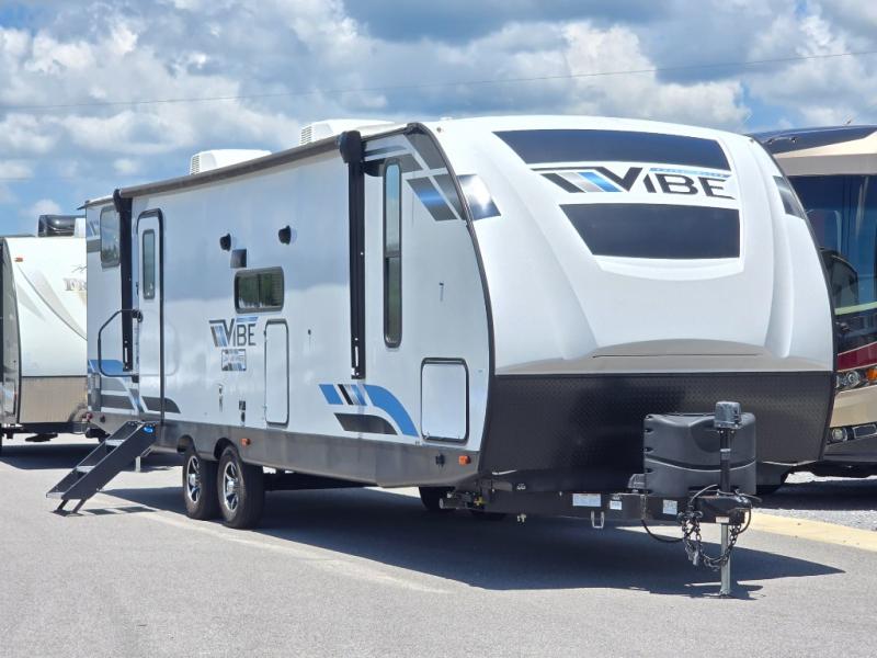 Each Vibe travel trailer by Forest River includes Hyper Lyte construction and a durable laminated "Aluma Frame" for years of use. The heated and enclosed underbelly allows you to extend your camping season, and the LED-lit exterior speakers will keep the party going as you grill outdoors and visit with family. Inside, you'll find LED lights to keep everything bright and open, a Bluetooth stereo, roller shades for your privacy, and many more amenities per region. These models also include cable and satellite prep and a digital TV antenna with a booster so you can stay connected to the outside world if you choose. Make the easy choice and choose a Vibe travel trailer today!
