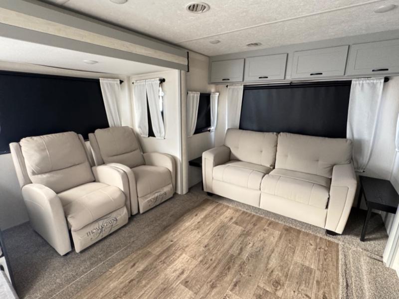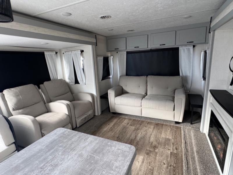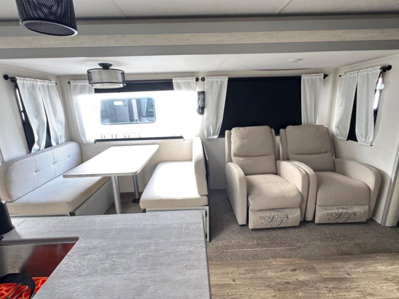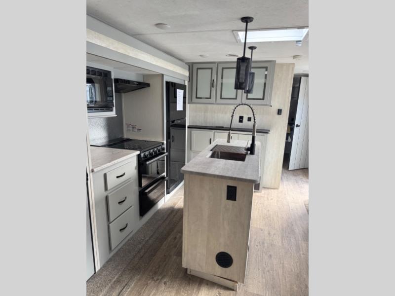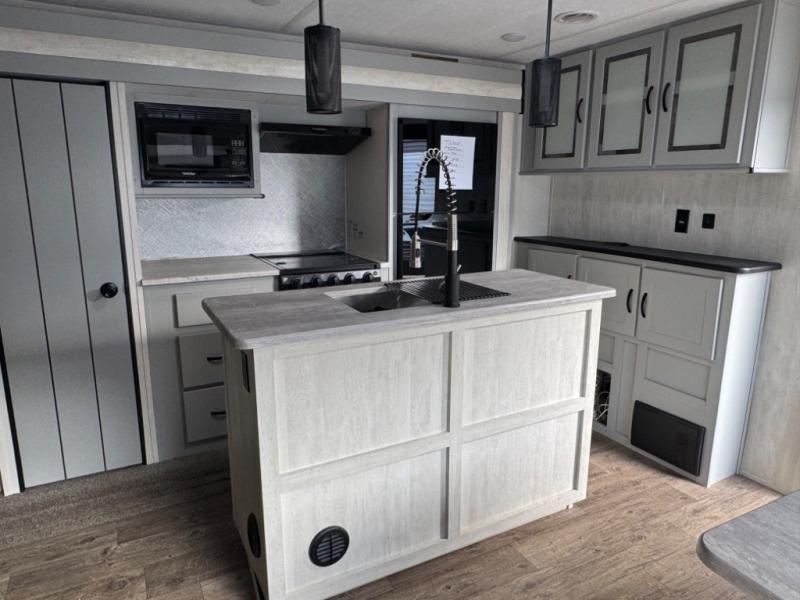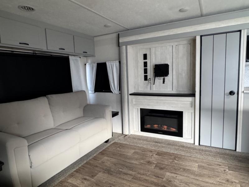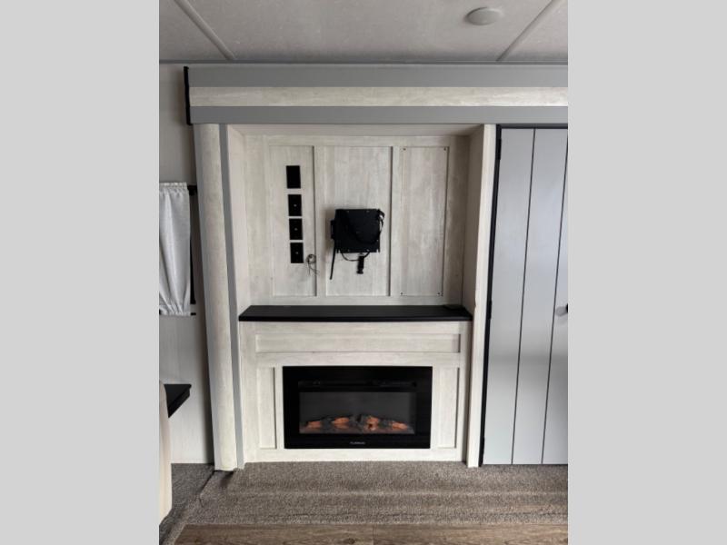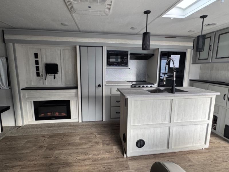 This travel trailer allows you to enjoy the Great Outdoors without having to give up your creature comforts. The dual opposing slides provide the chef space to work around the kitchen island, and there is plenty of seating space for your guests on the dual recliners, the sleeper sofa, and the booth dinette. The fireplace and LCD TV will be perfect for those rainy days, and there is even a living area skylight to let natural light in. This model also includes Sure-Step entry steps, a large pass-through storage, plus two power awnings with LED lights so you can spend more time outdoors with friends and family!