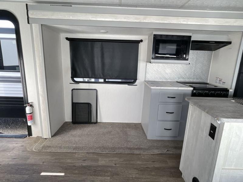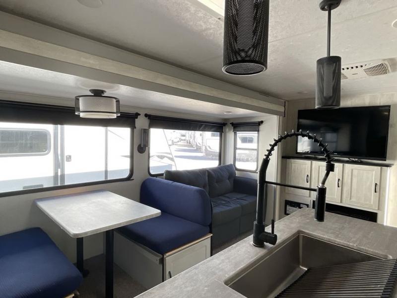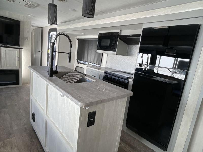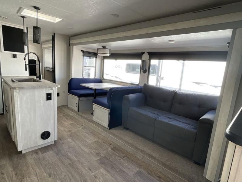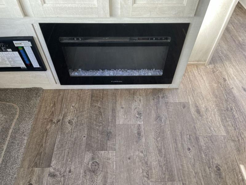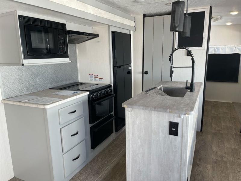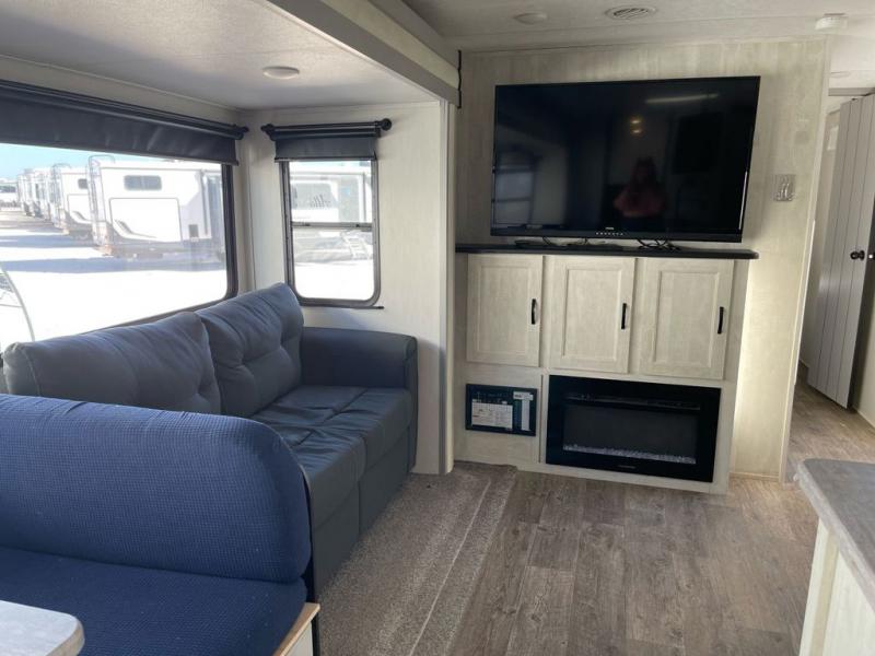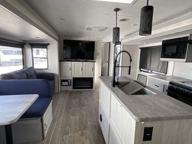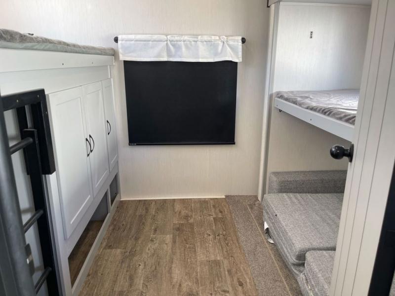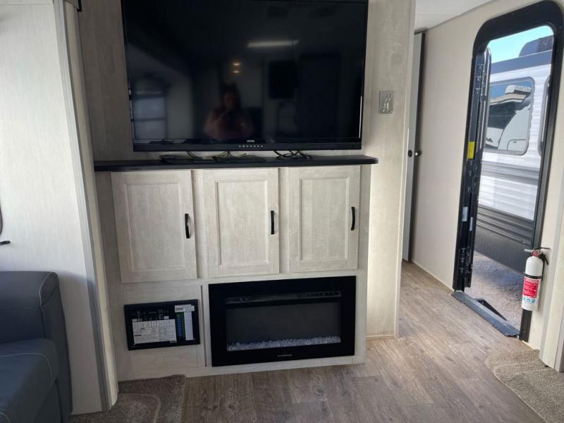 Whether you enjoy spending time outdoors or indoors, there is something for everyone in this travel trailer. The large pass-through storage can store your fishing poles, and the 20' electric awning with LED lights will create an outdoor living space. There is even an exterior baggage door with two exterior refrigerators, a TV, a spray port, and storage for snacks! You will love all the interior space thanks to the dual opposing slides in the main living area, which will give the chef space to work around the kitchen island. Your crew can visit on the two tri-fold sofas and booth dinette while the fireplace is going, but you'll probably find the kids spending most of their time in the private bunkhouse! They will have two bunks, Vibe cubes, a slide out for more space, plus a wardrobe to store all their clothes. What more could you want in a travel trailer?!