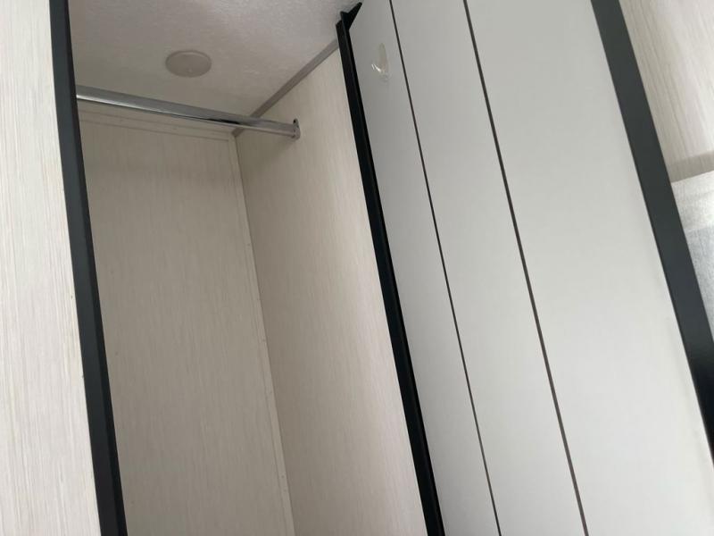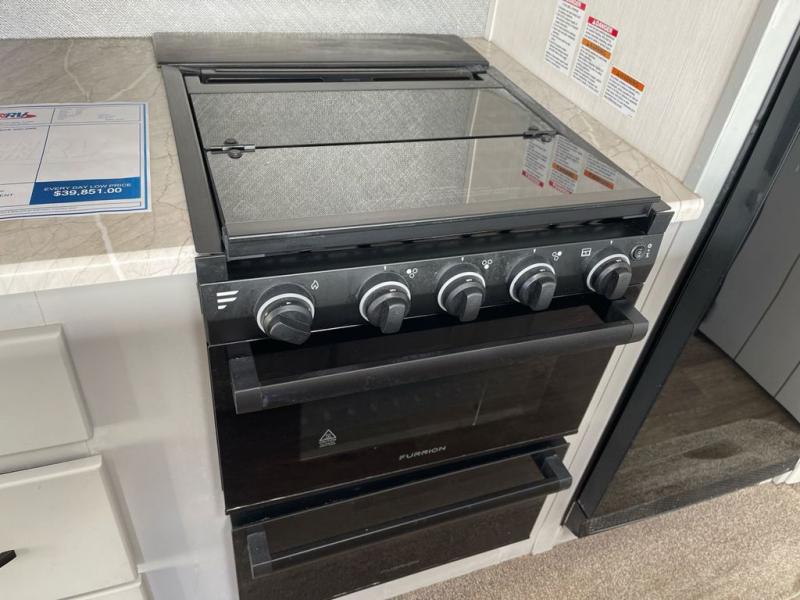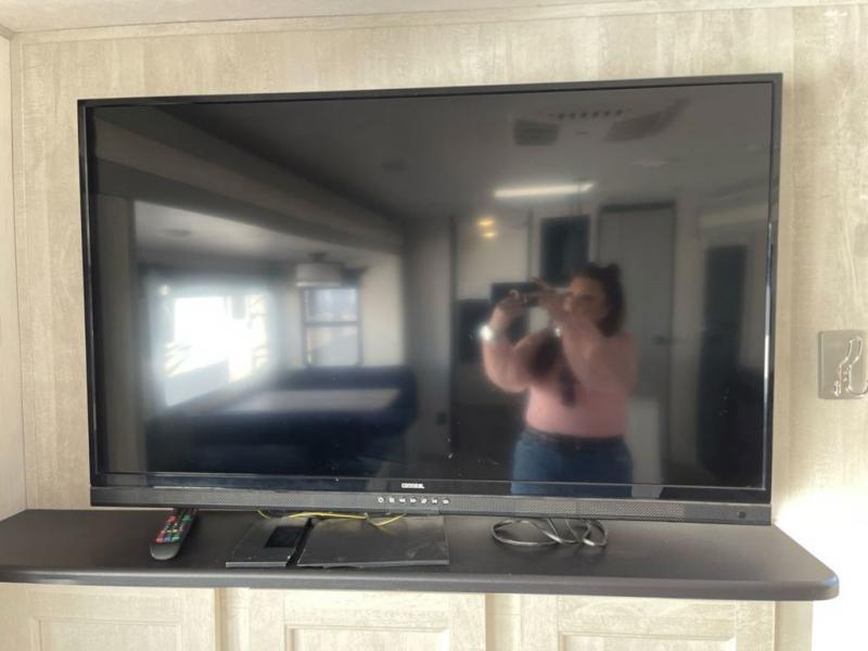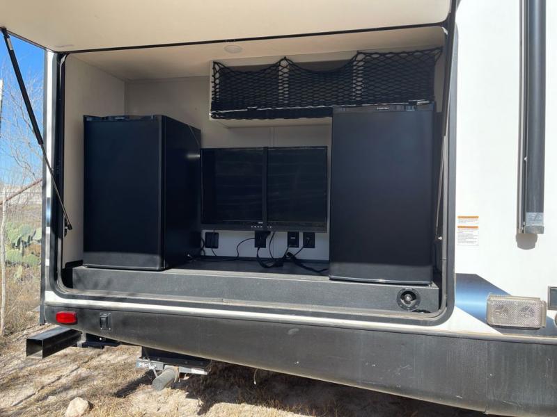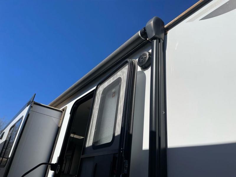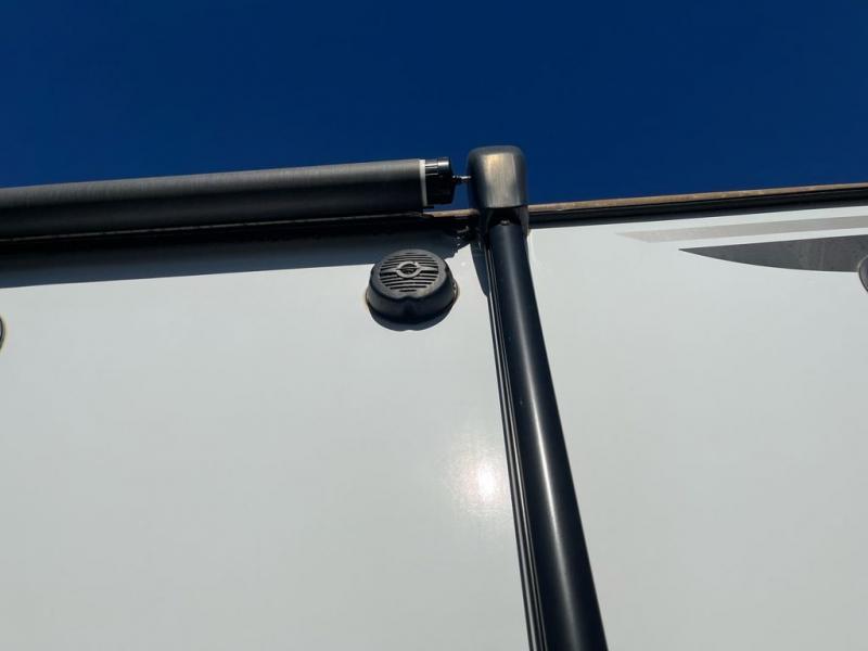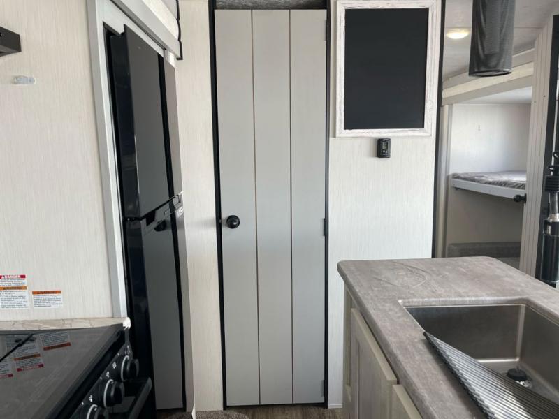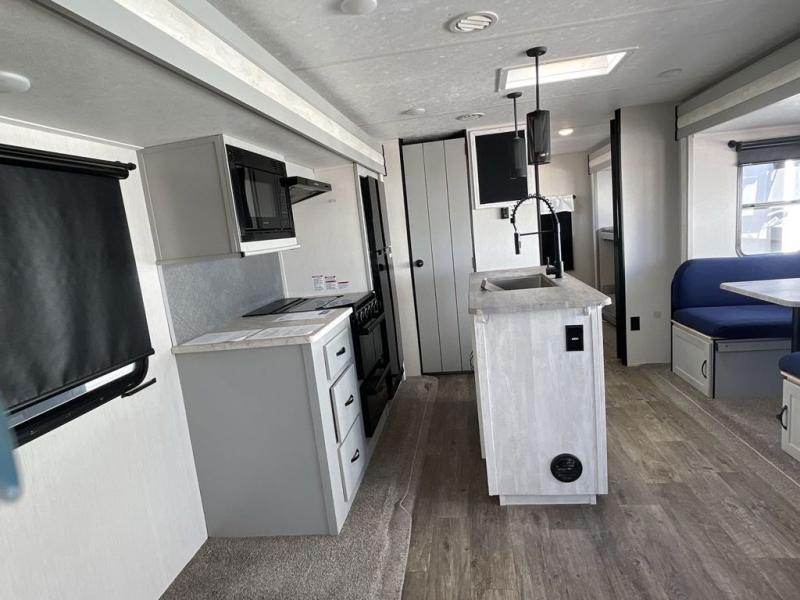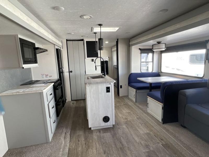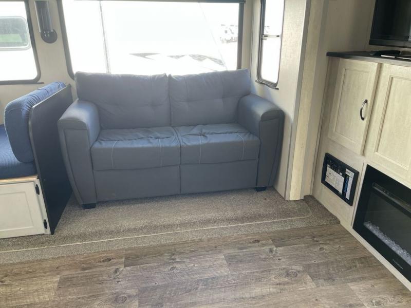 Whether you enjoy spending time outdoors or indoors, there is something for everyone in this travel trailer. The large pass-through storage can store your fishing poles, and the 20' electric awning with LED lights will create an outdoor living space. There is even an exterior baggage door with two exterior refrigerators, a TV, a spray port, and storage for snacks! You will love all the interior space thanks to the dual opposing slides in the main living area, which will give the chef space to work around the kitchen island. Your crew can visit on the two tri-fold sofas and booth dinette while the fireplace is going, but you'll probably find the kids spending most of their time in the private bunkhouse! They will have two bunks, Vibe cubes, a slide out for more space, plus a wardrobe to store all their clothes. What more could you want in a travel trailer?!