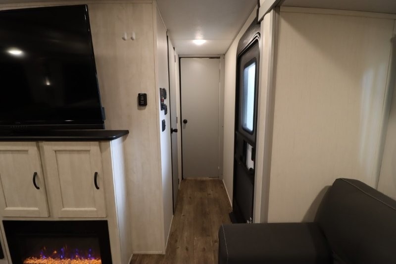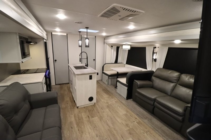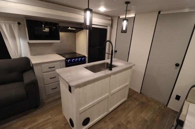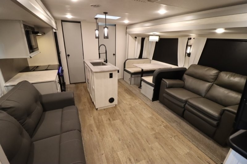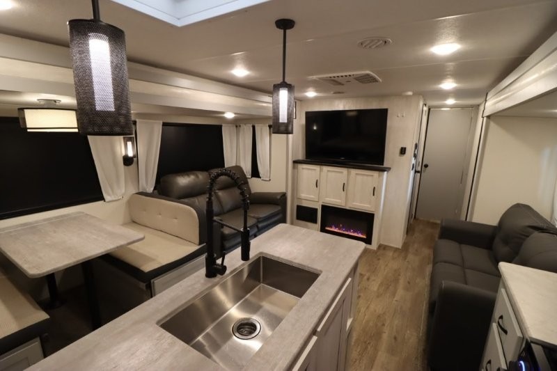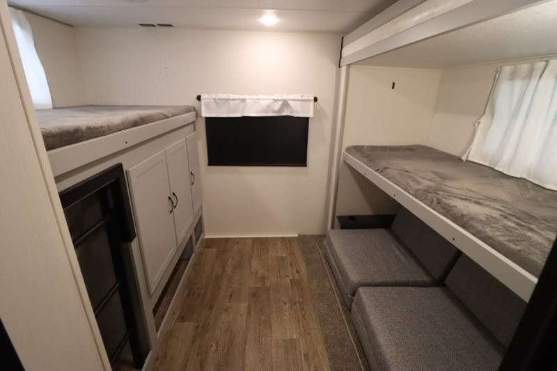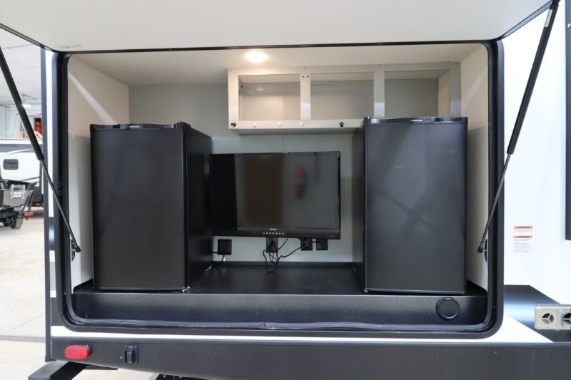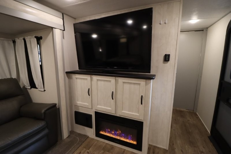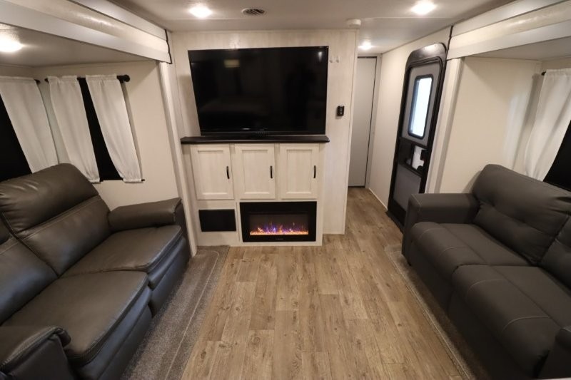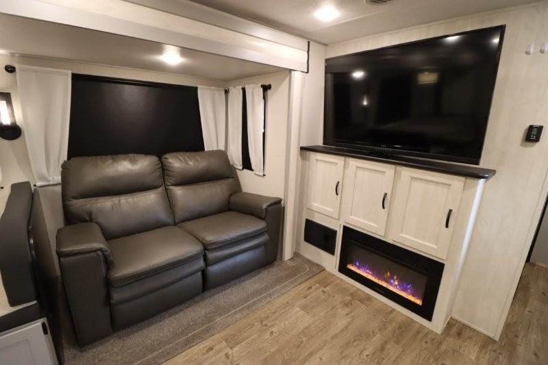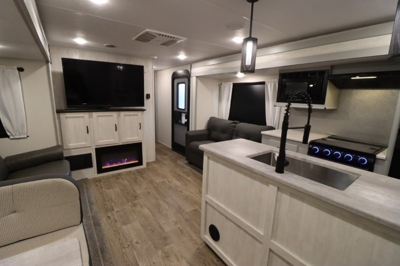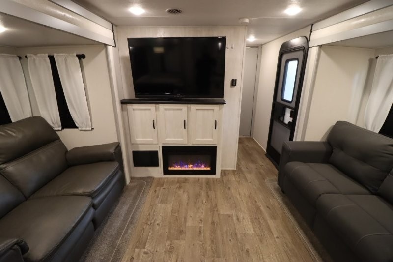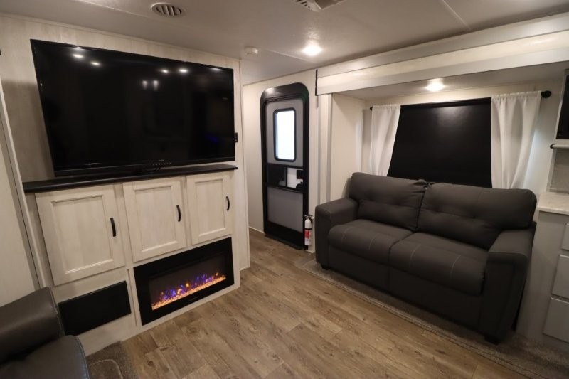 Whether you enjoy spending time outdoors or indoors, there is something for everyone in this travel trailer. The large pass-through storage can store your fishing poles, and the 20' electric awning with LED lights will create an outdoor living space. There is even an exterior baggage door with two exterior refrigerators, a TV, a spray port, and storage for snacks! You will love all the interior space thanks to the dual opposing slides in the main living area, which will give the chef space to work around the kitchen island. Your crew can visit on the two tri-fold sofas and booth dinette while the fireplace is going, but you'll probably find the kids spending most of their time in the private bunkhouse! They will have two bunks, Vibe cubes, a slide out for more space, plus a wardrobe to store all their clothes. What more could you want in a travel trailer?!