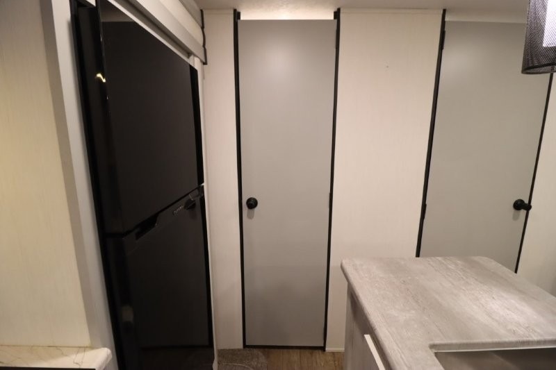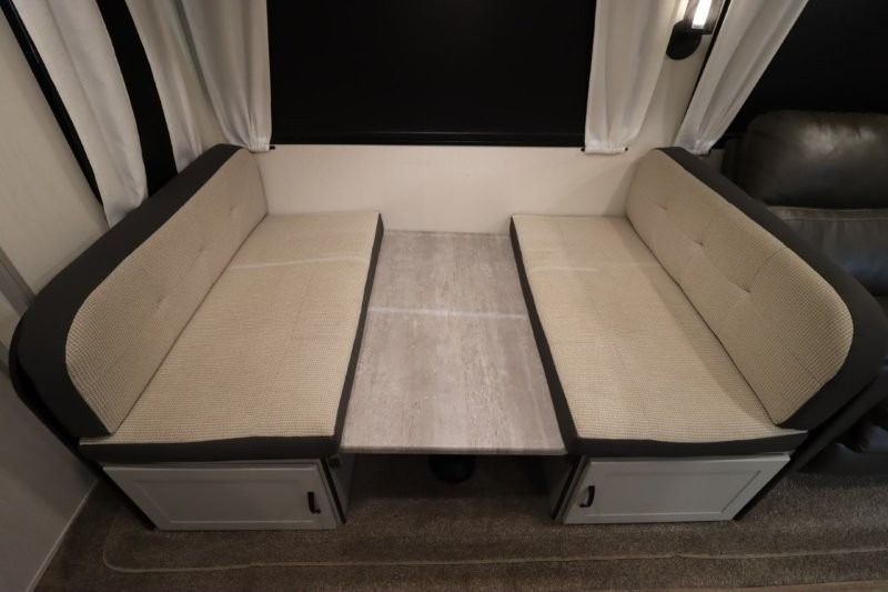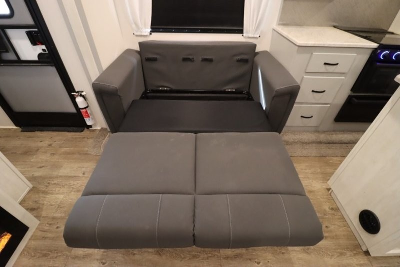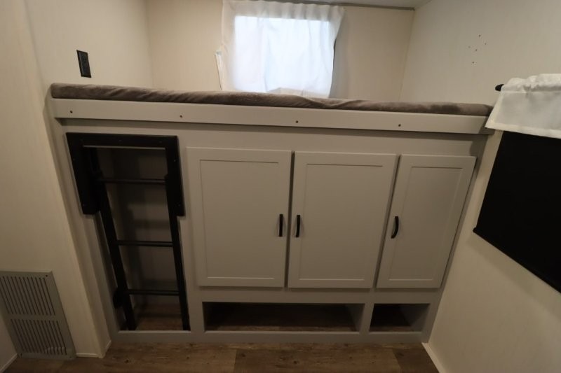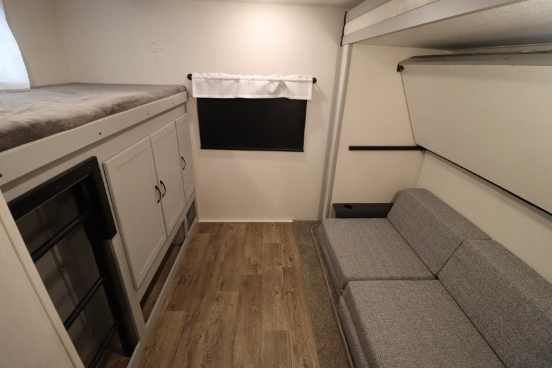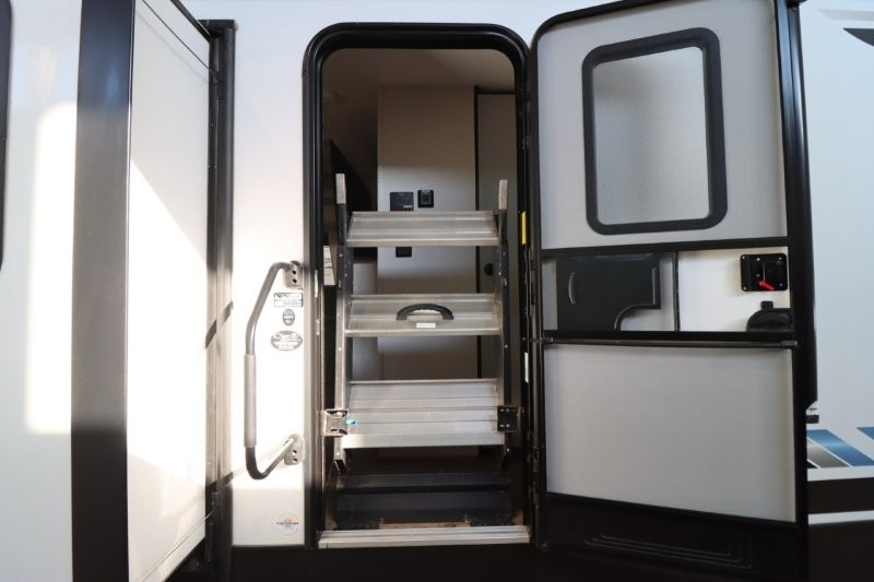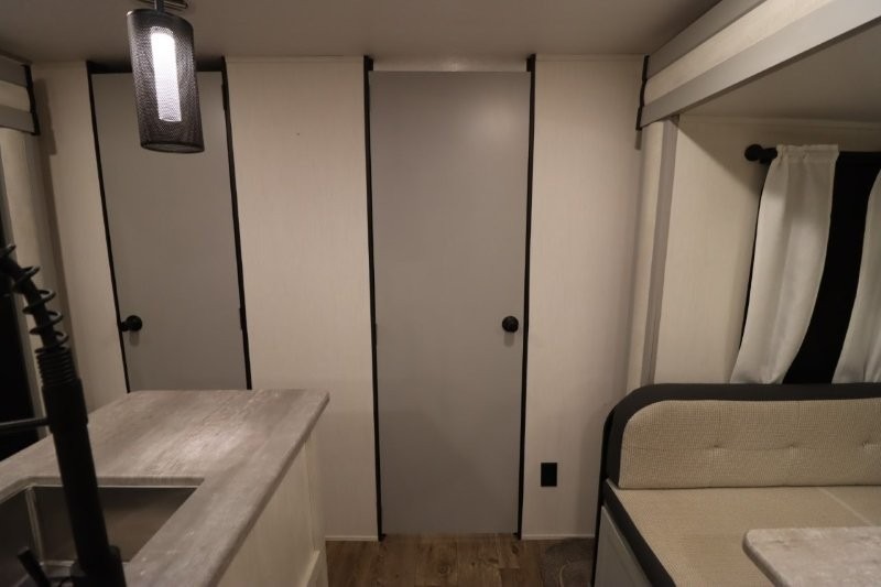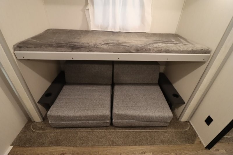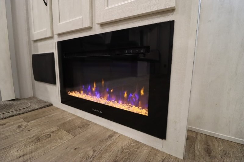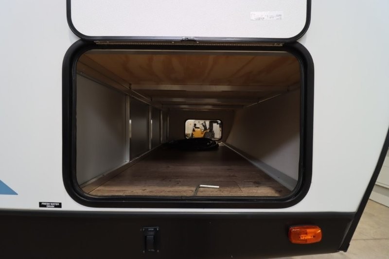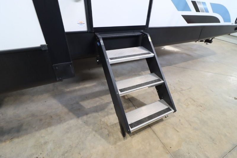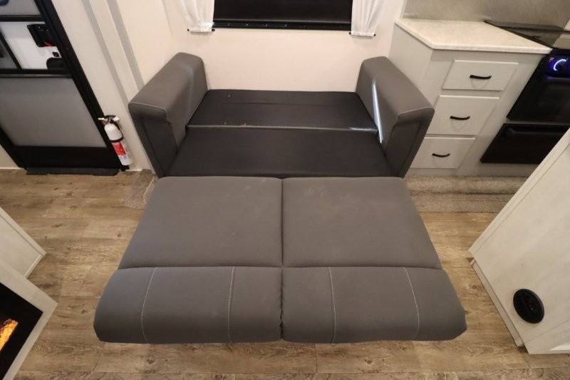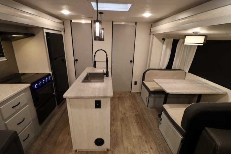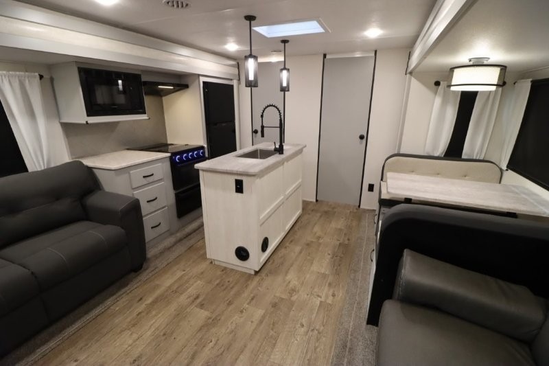 Whether you enjoy spending time outdoors or indoors, there is something for everyone in this travel trailer. The large pass-through storage can store your fishing poles, and the 20' electric awning with LED lights will create an outdoor living space. There is even an exterior baggage door with two exterior refrigerators, a TV, a spray port, and storage for snacks! You will love all the interior space thanks to the dual opposing slides in the main living area, which will give the chef space to work around the kitchen island. Your crew can visit on the two tri-fold sofas and booth dinette while the fireplace is going, but you'll probably find the kids spending most of their time in the private bunkhouse! They will have two bunks, Vibe cubes, a slide out for more space, plus a wardrobe to store all their clothes. What more could you want in a travel trailer?!