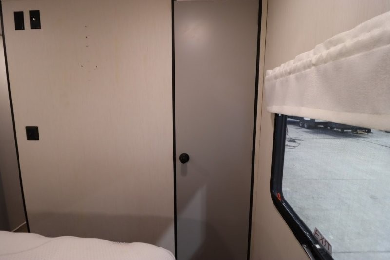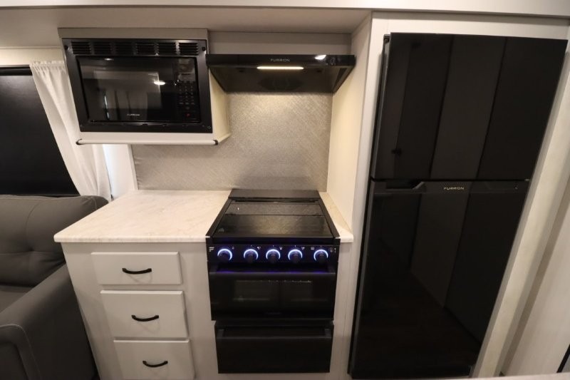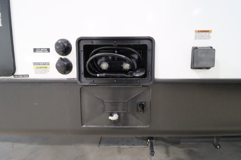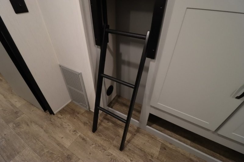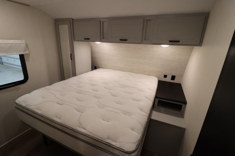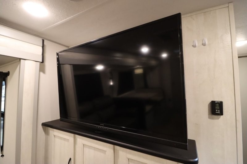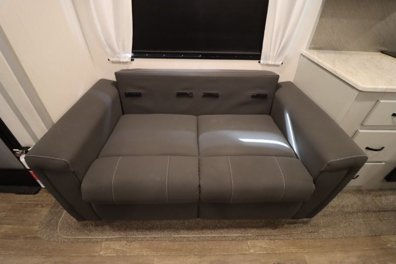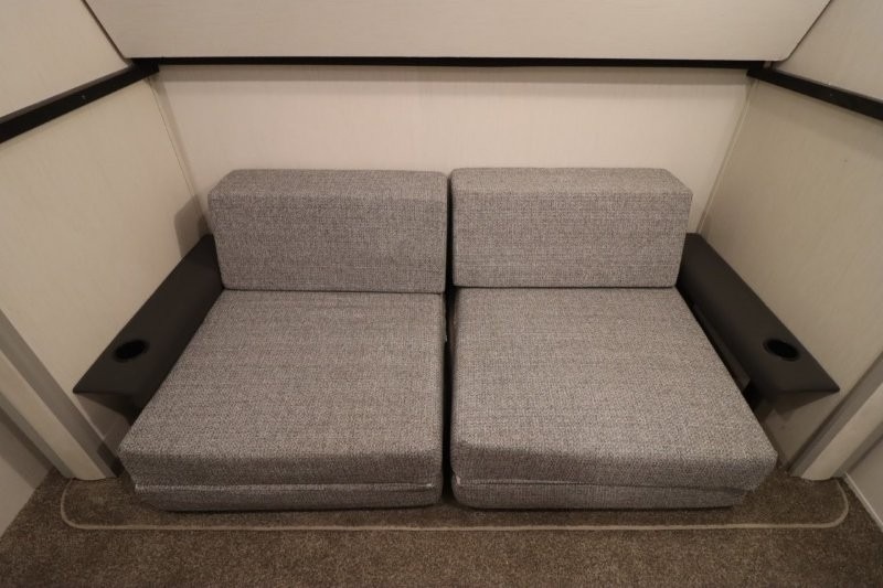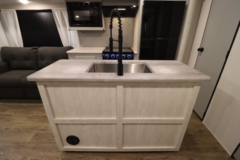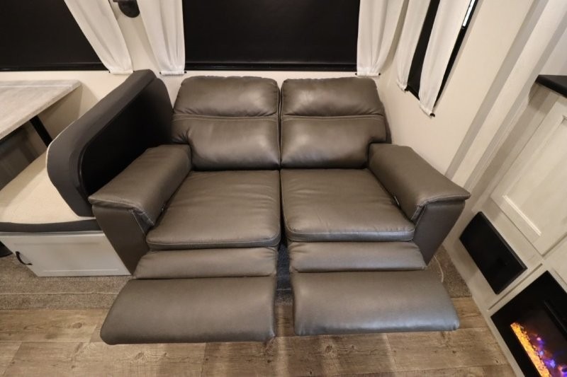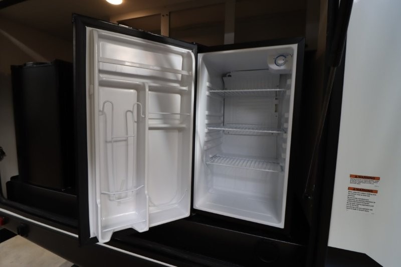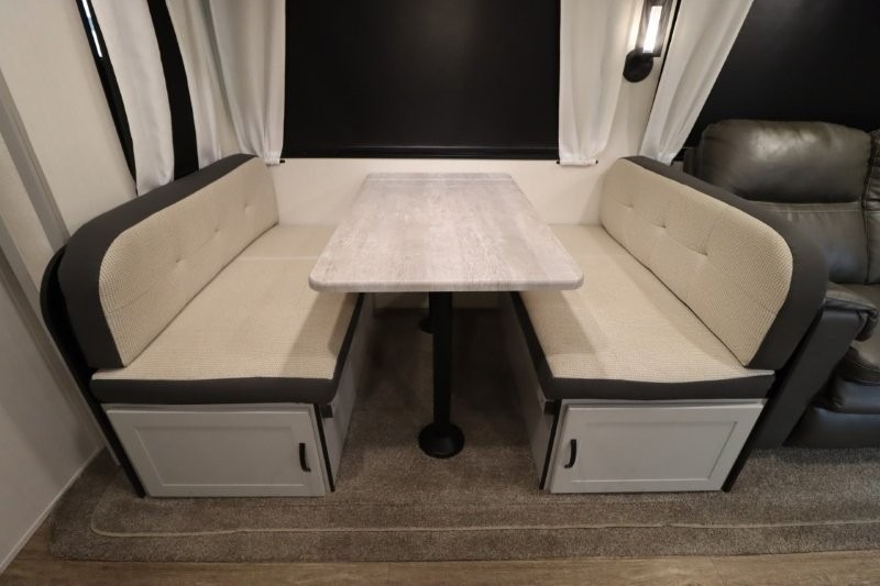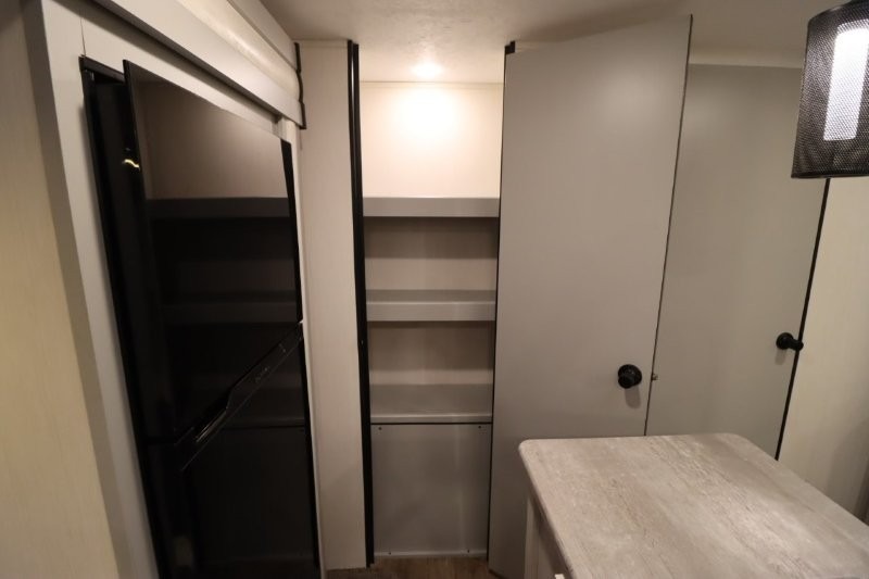 Whether you enjoy spending time outdoors or indoors, there is something for everyone in this travel trailer. The large pass-through storage can store your fishing poles, and the 20' electric awning with LED lights will create an outdoor living space. There is even an exterior baggage door with two exterior refrigerators, a TV, a spray port, and storage for snacks! You will love all the interior space thanks to the dual opposing slides in the main living area, which will give the chef space to work around the kitchen island. Your crew can visit on the two tri-fold sofas and booth dinette while the fireplace is going, but you'll probably find the kids spending most of their time in the private bunkhouse! They will have two bunks, Vibe cubes, a slide out for more space, plus a wardrobe to store all their clothes. What more could you want in a travel trailer?!