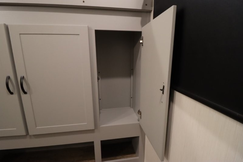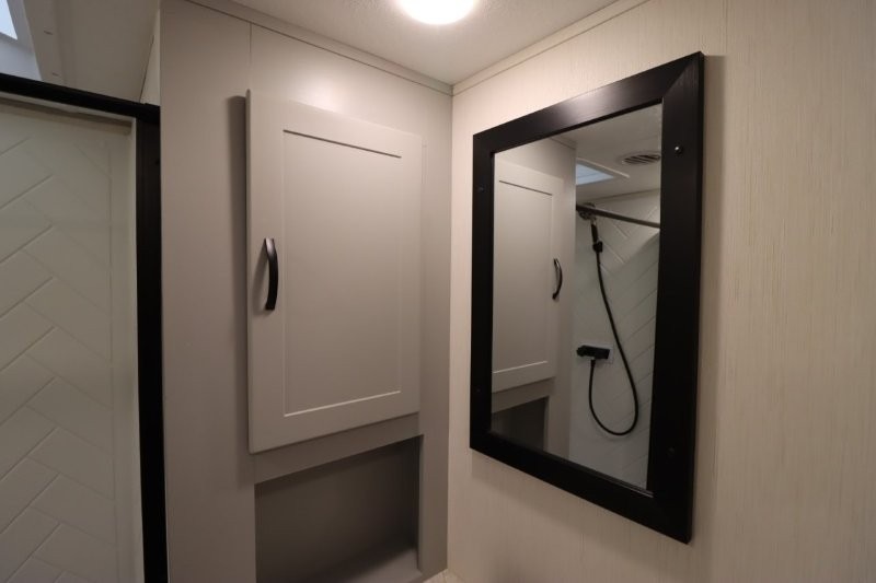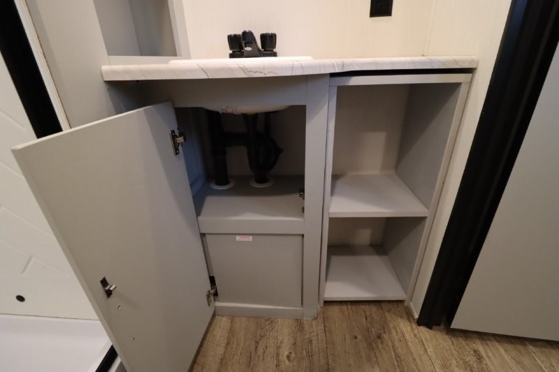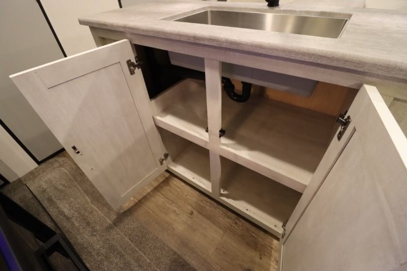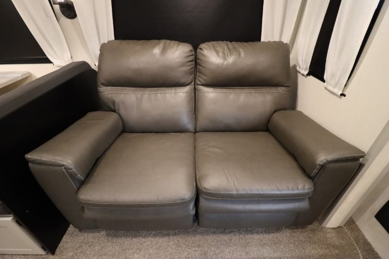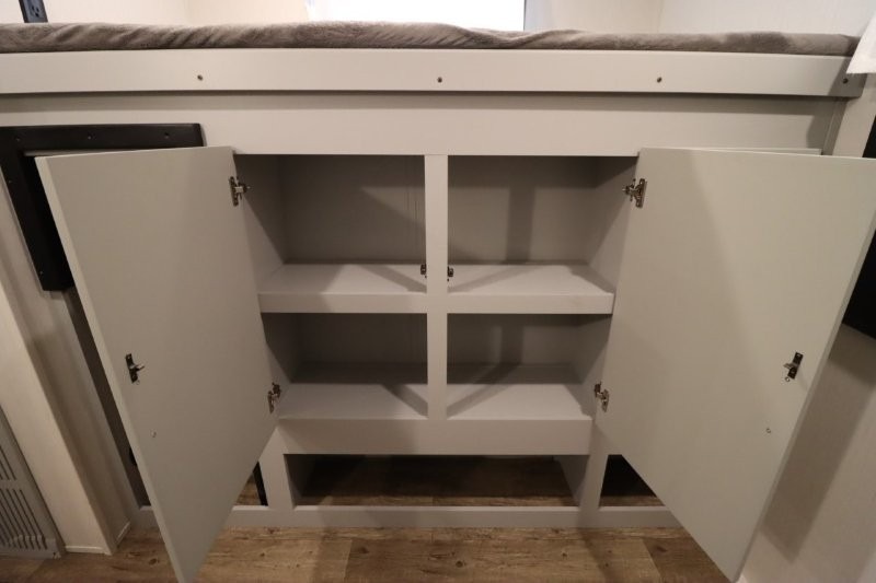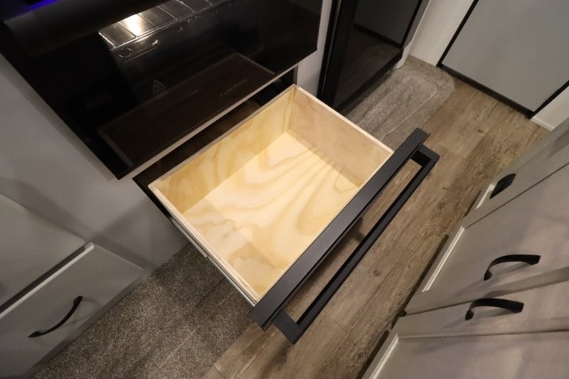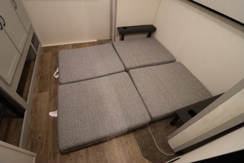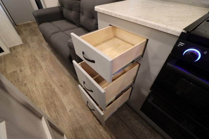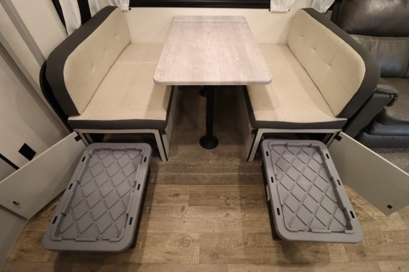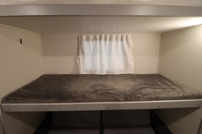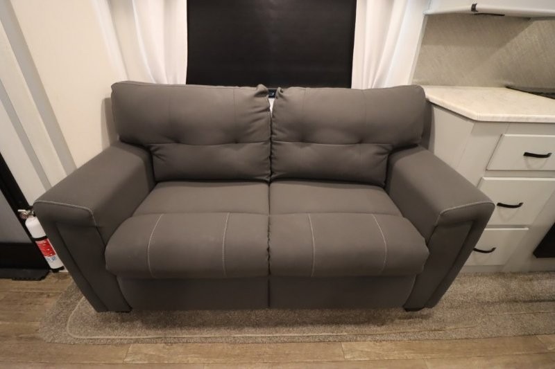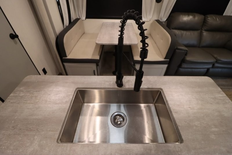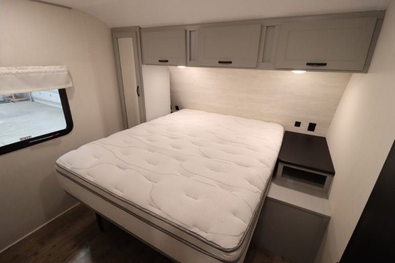 Whether you enjoy spending time outdoors or indoors, there is something for everyone in this travel trailer. The large pass-through storage can store your fishing poles, and the 20' electric awning with LED lights will create an outdoor living space. There is even an exterior baggage door with two exterior refrigerators, a TV, a spray port, and storage for snacks! You will love all the interior space thanks to the dual opposing slides in the main living area, which will give the chef space to work around the kitchen island. Your crew can visit on the two tri-fold sofas and booth dinette while the fireplace is going, but you'll probably find the kids spending most of their time in the private bunkhouse! They will have two bunks, Vibe cubes, a slide out for more space, plus a wardrobe to store all their clothes. What more could you want in a travel trailer?!