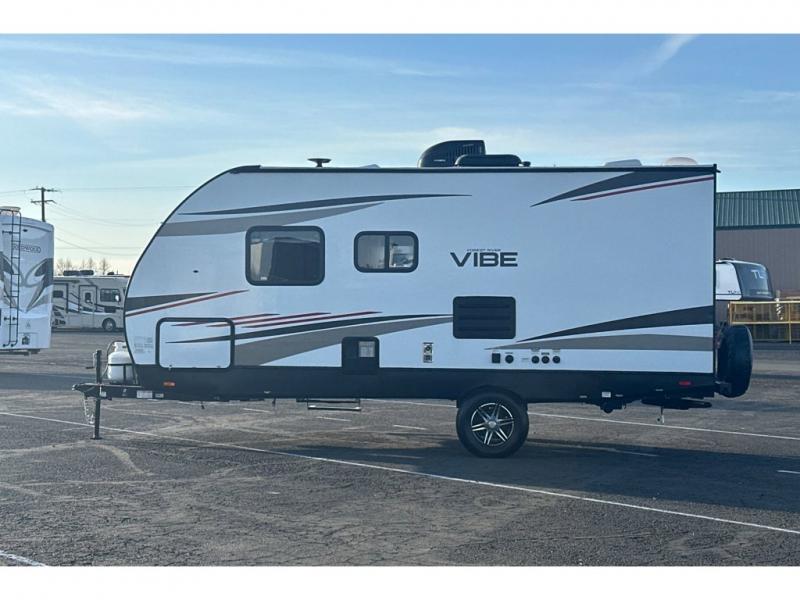Each Vibe travel trailer by Forest River includes Hyper Lyte construction and a durable laminated "Aluma Frame" for years of use. The heated and enclosed underbelly allows you to extend your camping season, and the LED-lit exterior speakers will keep the party going as you grill outdoors and visit with family. Inside, you'll find LED lights to keep everything bright and open, a Bluetooth stereo, roller shades for your privacy, and many more amenities per region. These models also include cable and satellite prep and a digital TV antenna with a booster so you can stay connected to the outside world if you choose. Make the easy choice and choose a Vibe travel trailer today!