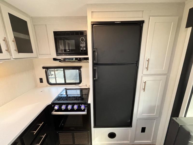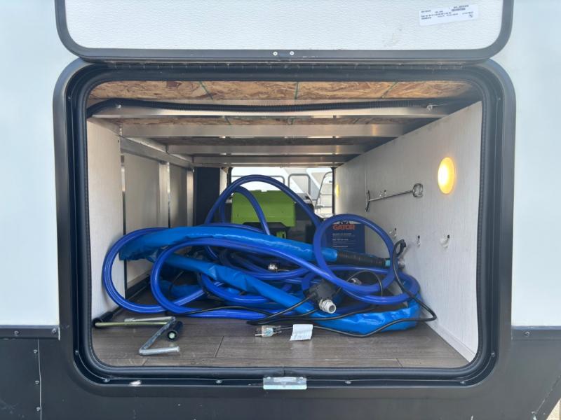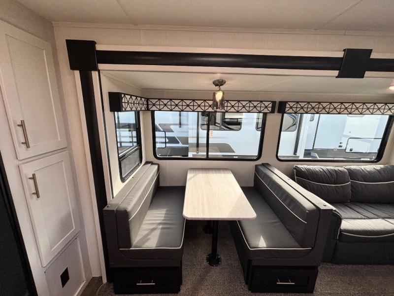If you love outdoor views and natural lighting, you're going to love this travel trailer with panoramic windows, and the large slide out will provide more space to relax. The rear kitchen features tons of counter space, a full-length pantry, plus a central trash station for easy clean-up. After dinner is over, relax on the dual recliners by the fireplace, or watch a movie on the 50" TV. There is more seating space on the tri-fold sleeper sofa and booth dinette as well. When it comes time to call it a night, freshen up in the full bath before heading to the front private bedroom. Here, you'll enjoy a king bed with under-bed storage, a wardrobe/linen closet, plus dual shirt closets to keep your best shirts wrinkle-free. This model also includes an outside cooktop and refrigerator, a 20' power awning, plus a large pass-through storage for fishing poles and tackle boxes!
