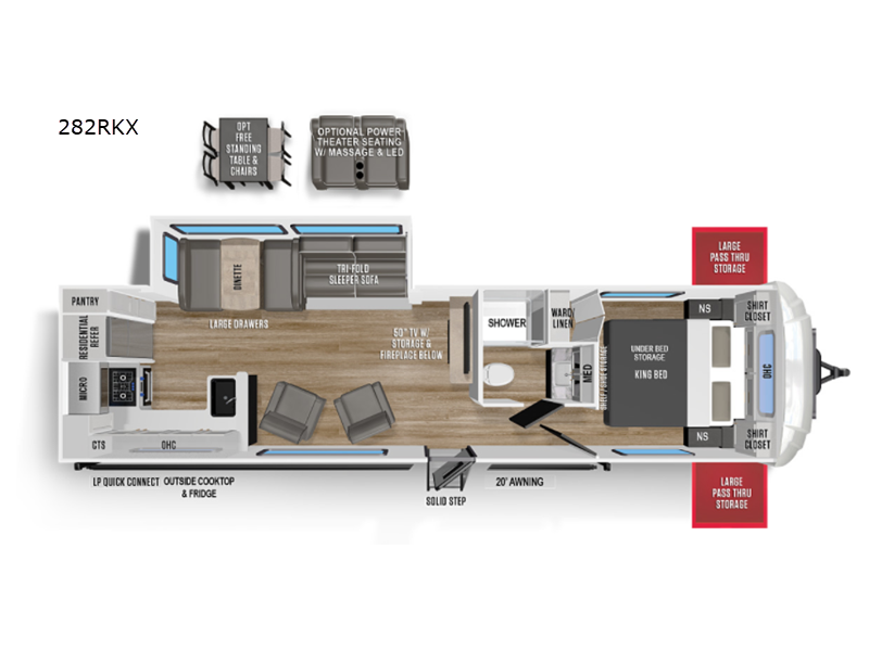 If you love outdoor views and natural lighting, you're going to love this travel trailer with panoramic windows, and the large slide out will provide more space to relax. The rear kitchen features tons of counter space, a full-length pantry, plus a central trash station for easy clean-up. After dinner is over, relax on the dual recliners by the fireplace, or watch a movie on the 50" TV. There is more seating space on the tri-fold sleeper sofa and booth dinette as well. When it comes time to call it a night, freshen up in the full bath before heading to the front private bedroom. Here, you'll enjoy a king bed with under-bed storage, a wardrobe/linen closet, plus dual shirt closets to keep your best shirts wrinkle-free. This model also includes an outside cooktop and refrigerator, a 20' power awning, plus a large pass-through storage for fishing poles and tackle boxes!