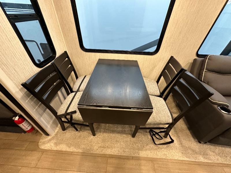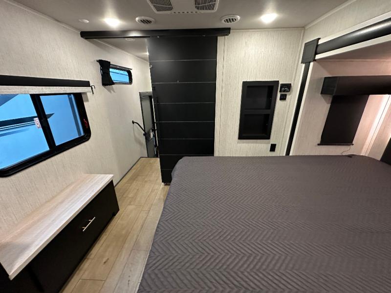 This is the perfect couple's trailer with space for two overnight guests or little ones on the rear hide-a-bed sofa. You will enjoy the front private bedroom with its king bed slide out, a dresser and a bench seat, plus a walk-in wardrobe with washer and dryer prep. The full bath includes plenty of space to freshen up, and there is a linen closet here for clean towels. Check out the main living area that features tons of space thanks to the dual opposing slides, and the kitchen island brings that extra touch of home to this space. The LED HDTV sits within the entertainment center directly across from the theater seating for perfect viewing, and this model includes tons of storage space, including two pantries, a hutch, and a pass-through storage!