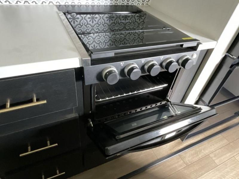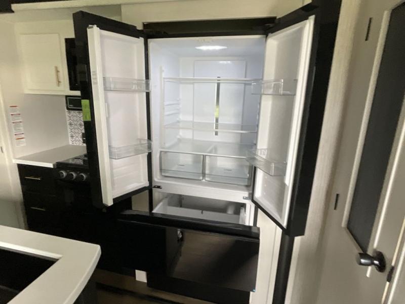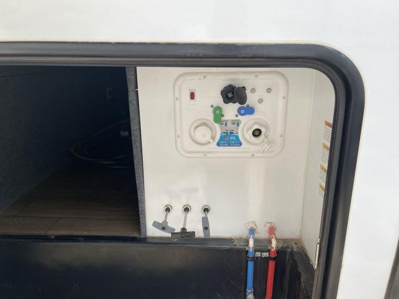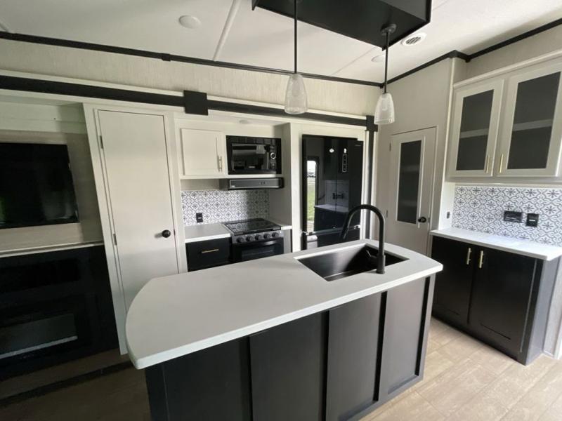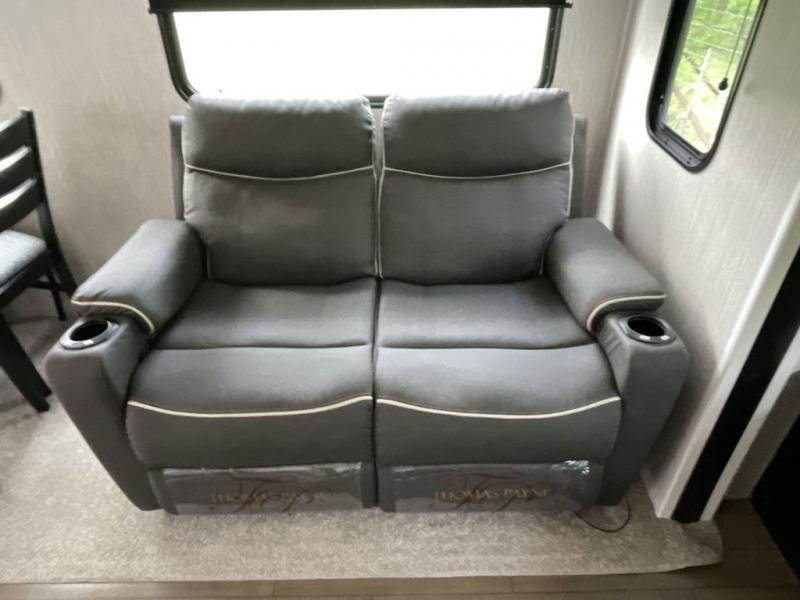This is the perfect couple's trailer with space for two overnight guests or little ones on the rear hide-a-bed sofa. You will enjoy the front private bedroom with its king bed slide out, a dresser and a bench seat, plus a walk-in wardrobe with washer and dryer prep. The full bath includes plenty of space to freshen up, and there is a linen closet here for clean towels. Check out the main living area that features tons of space thanks to the dual opposing slides, and the kitchen island brings that extra touch of home to this space. The LED HDTV sits within the entertainment center directly across from the theater seating for perfect viewing, and this model includes tons of storage space, including two pantries, a hutch, and a pass-through storage!