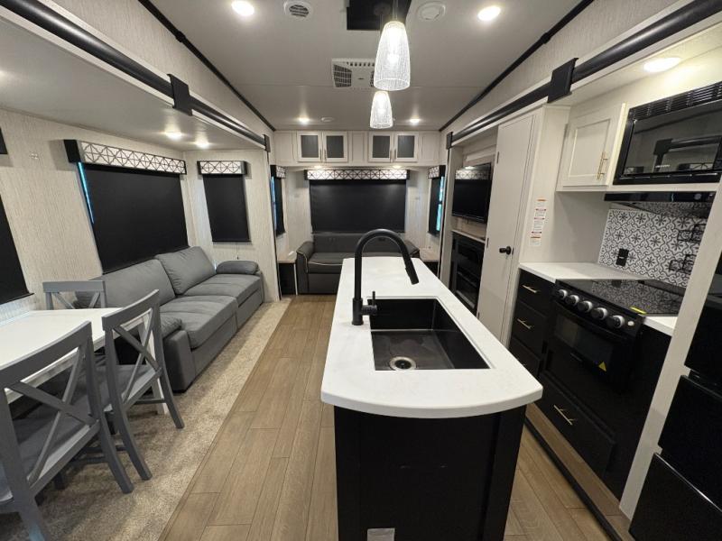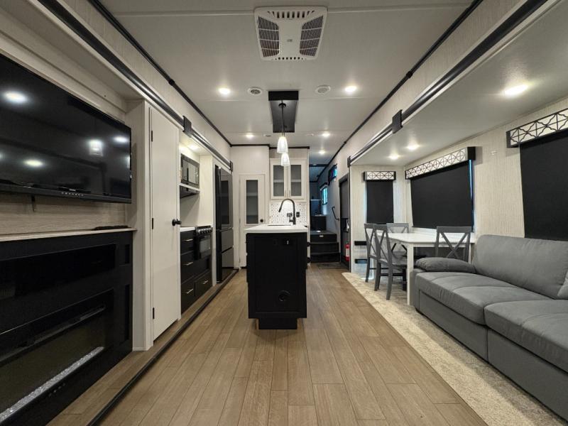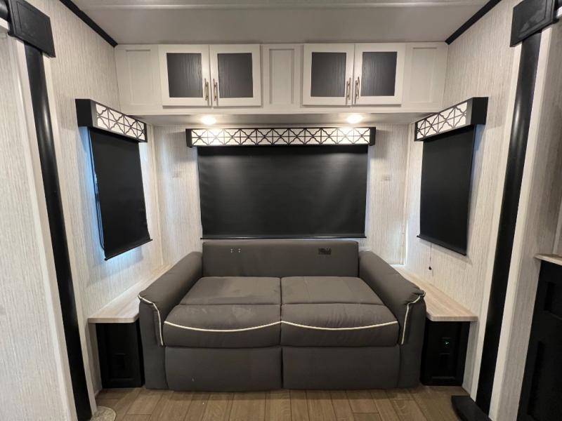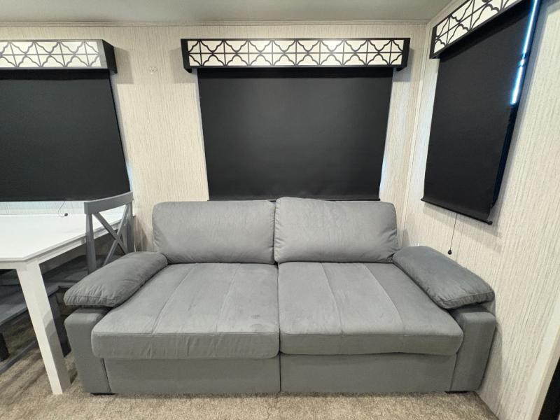 This is the perfect couple's trailer with space for two overnight guests or little ones on the rear hide-a-bed sofa. You will enjoy the front private bedroom with its king bed slide out, a dresser and a bench seat, plus a walk-in wardrobe with washer and dryer prep. The full bath includes plenty of space to freshen up, and there is a linen closet here for clean towels. Check out the main living area that features tons of space thanks to the dual opposing slides, and the kitchen island brings that extra touch of home to this space. The LED HDTV sits within the entertainment center directly across from the theater seating for perfect viewing, and this model includes tons of storage space, including two pantries, a hutch, and a pass-through storage!