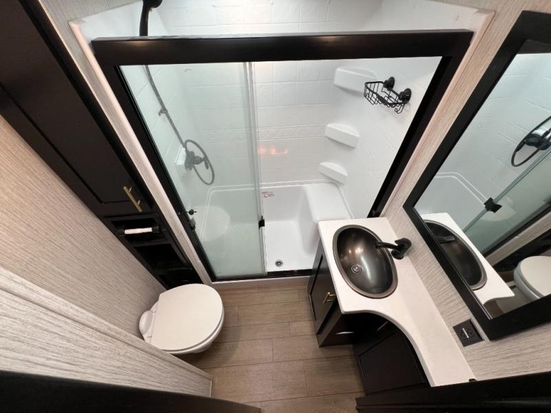 With any Wildcat fifth wheel or travel trailer by Forest River you will appreciate durable construction, including a Maxx strong laminated aluminum floor on the travel trailers, and underbelly armor on the fifth wheels. The Maxx insulation package includes high-density block foam insulation, two 30 lb. LP tanks, and a 35,000 BTU furnace to keep you comfortable year around. Some of the interior comforts you are sure to appreciate are the bedroom reading lights on both sides of the bed, the foot pedal flush toilet in the bath, the Rose Gold door and drawer hardware, and more!