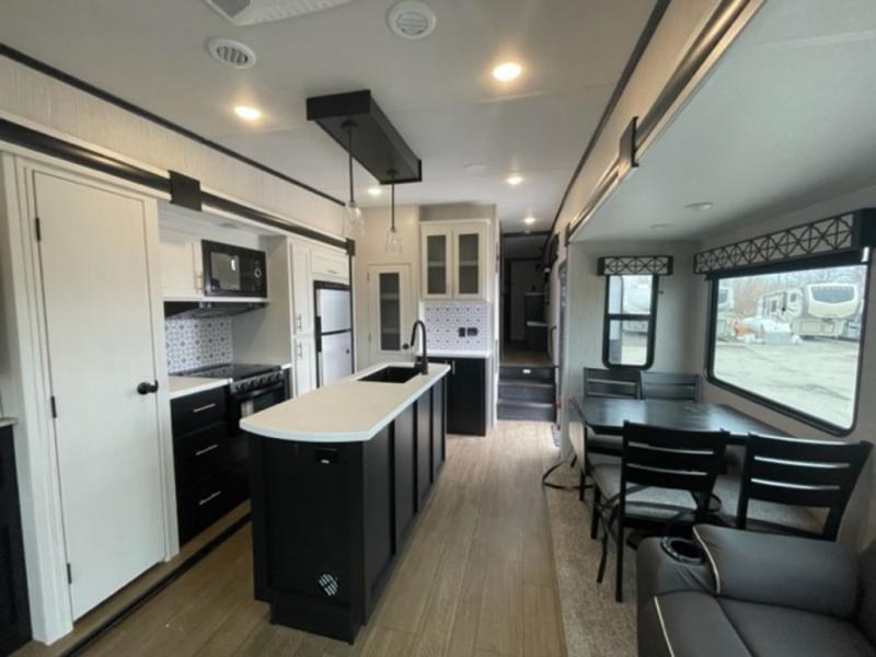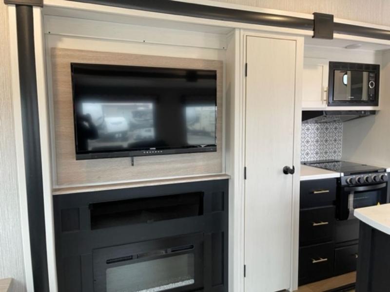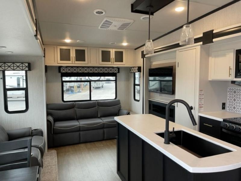 This is the perfect couple's trailer with space for two overnight guests or little ones on the rear hide-a-bed sofa. You will enjoy the front private bedroom with its king bed slide out, a dresser and a bench seat, plus a walk-in wardrobe with washer and dryer prep. The full bath includes plenty of space to freshen up, and there is a linen closet here for clean towels. Check out the main living area that features tons of space thanks to the dual opposing slides, and the kitchen island brings that extra touch of home to this space. The LED HDTV sits within the entertainment center directly across from the theater seating for perfect viewing, and this model includes tons of storage space, including two pantries, a hutch, and a pass-through storage!