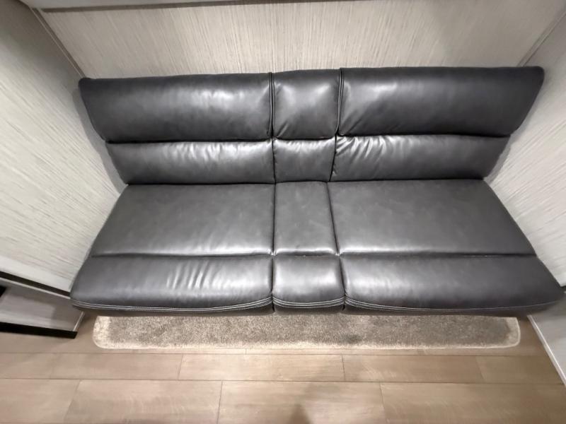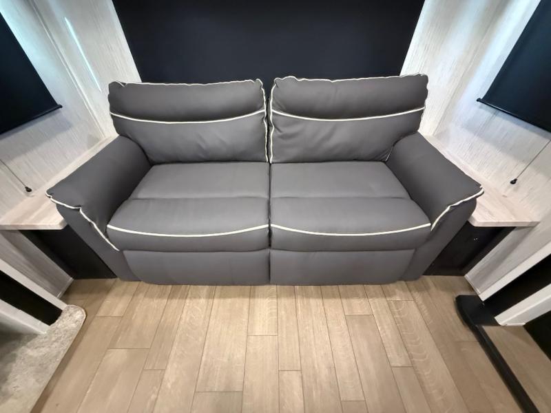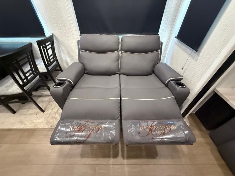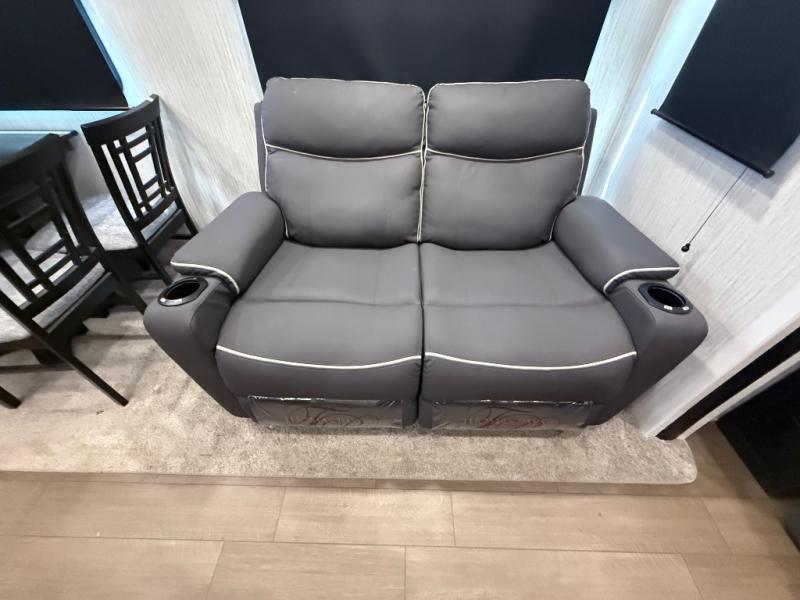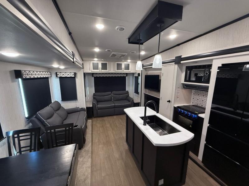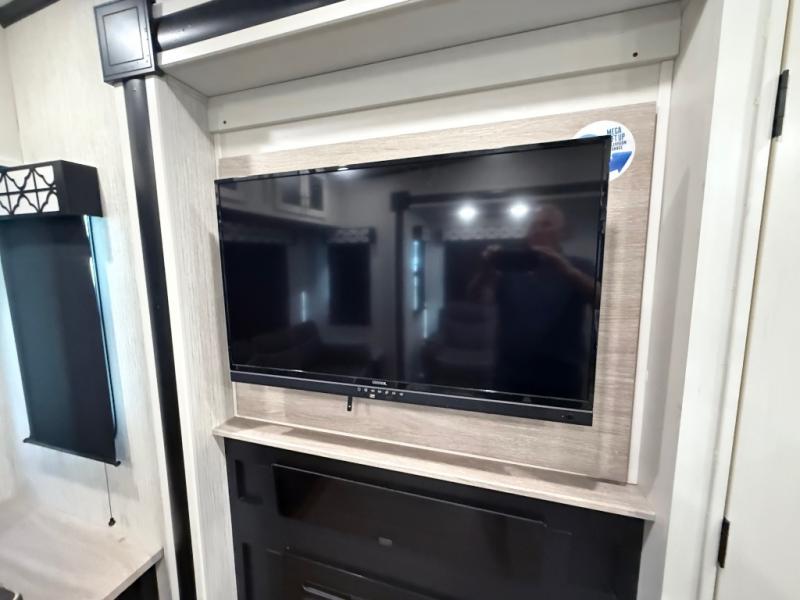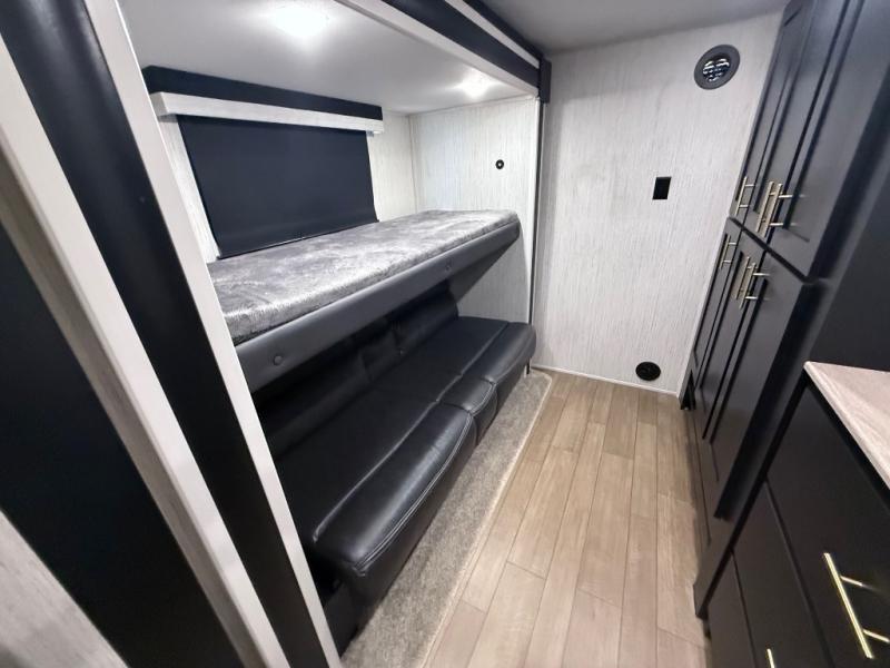 Wow check out this fifth wheel with four slide outs, a middle bunkhouse with a loft, plus two power awnings! The main living area includes 60" theater seating across from the entertainment center and fireplace, a hide-a-bed sofa, and a free-standing dinette to enjoy meals together. Your guests will love having their own space in the bunkhouse that includes a jackknife sofa, a flip-down bunk, plus a dresser and a TV. Head to the front private bedroom for a great night's rest on the slide out king bed, and there is a walk-in wardrobe with washer and dryer prep for full-time living!