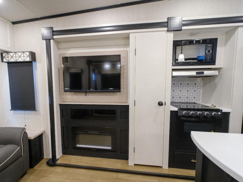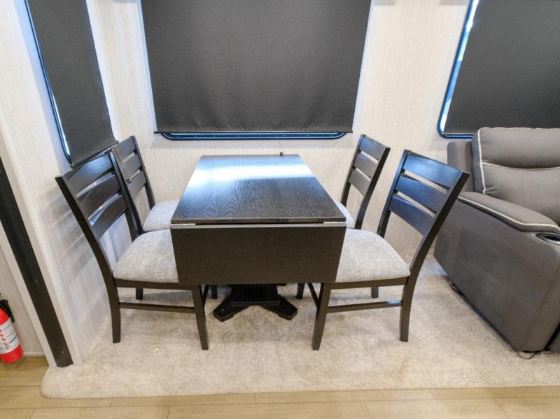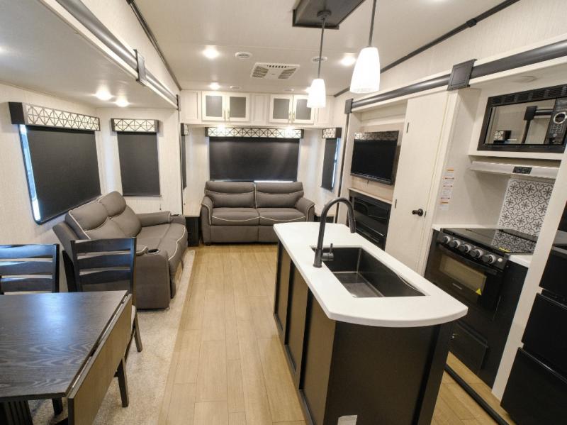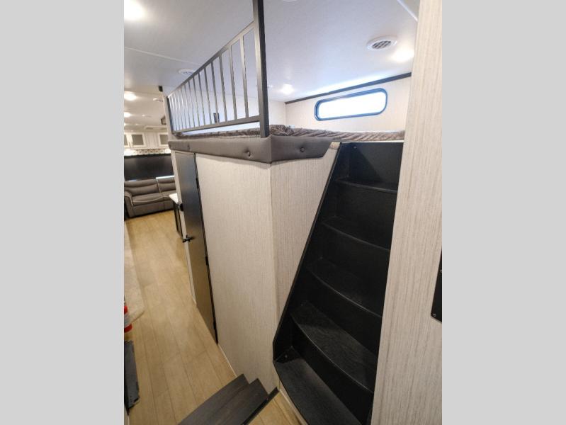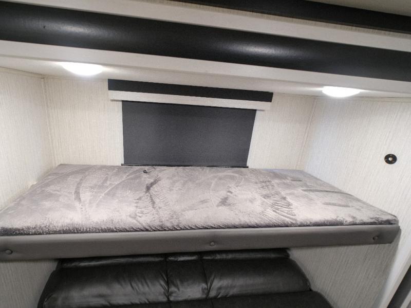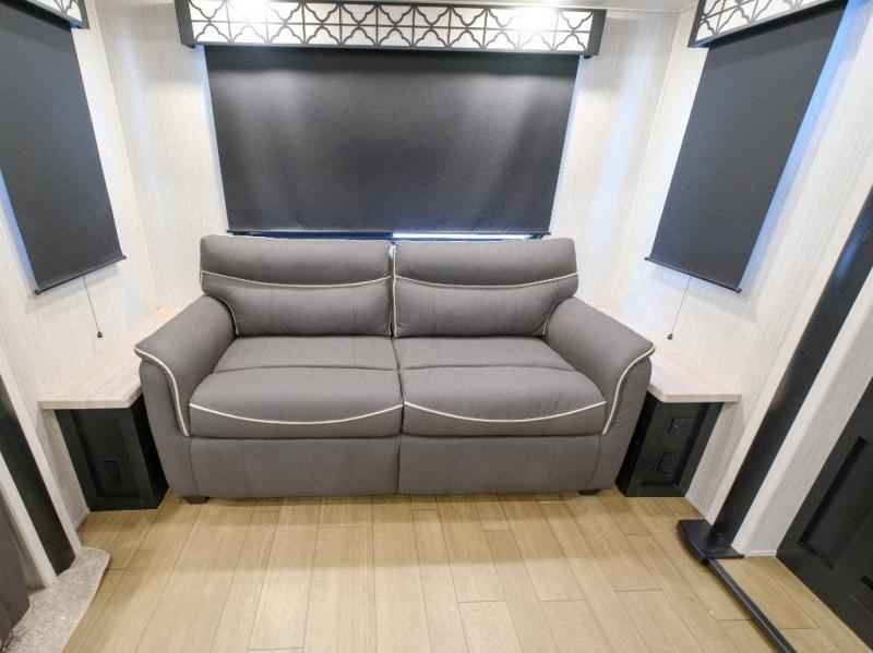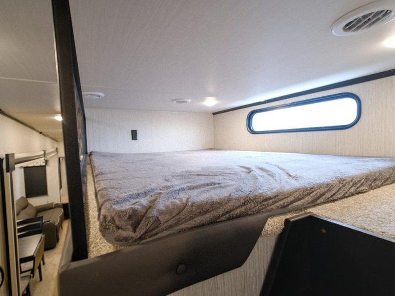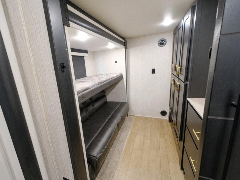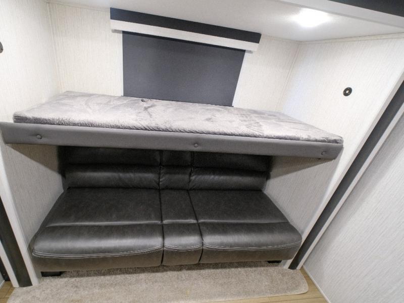 Wow check out this fifth wheel with four slide outs, a middle bunkhouse with a loft, plus two power awnings! The main living area includes 60" theater seating across from the entertainment center and fireplace, a hide-a-bed sofa, and a free-standing dinette to enjoy meals together. Your guests will love having their own space in the bunkhouse that includes a jackknife sofa, a flip-down bunk, plus a dresser and a TV. Head to the front private bedroom for a great night's rest on the slide out king bed, and there is a walk-in wardrobe with washer and dryer prep for full-time living!