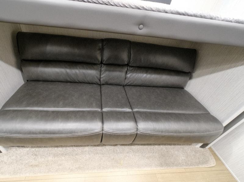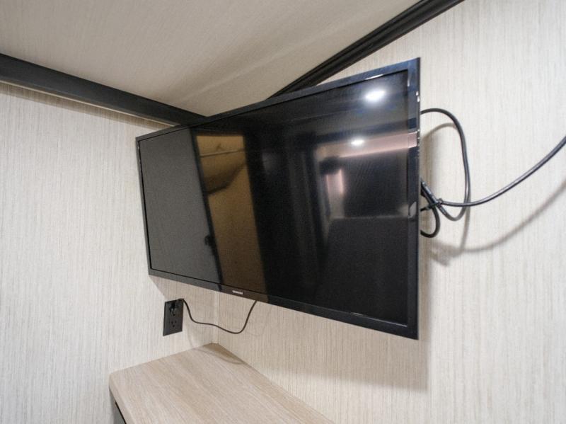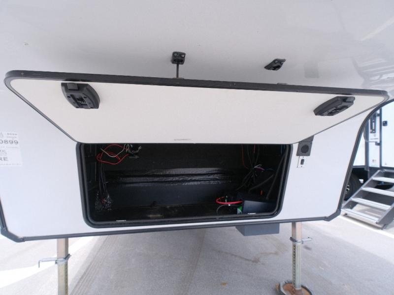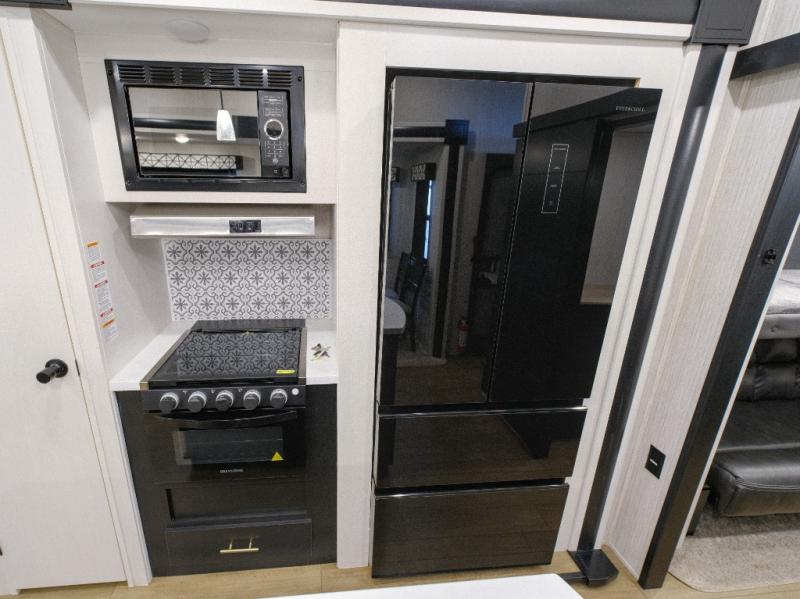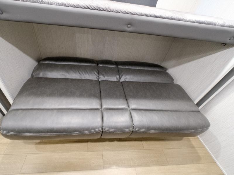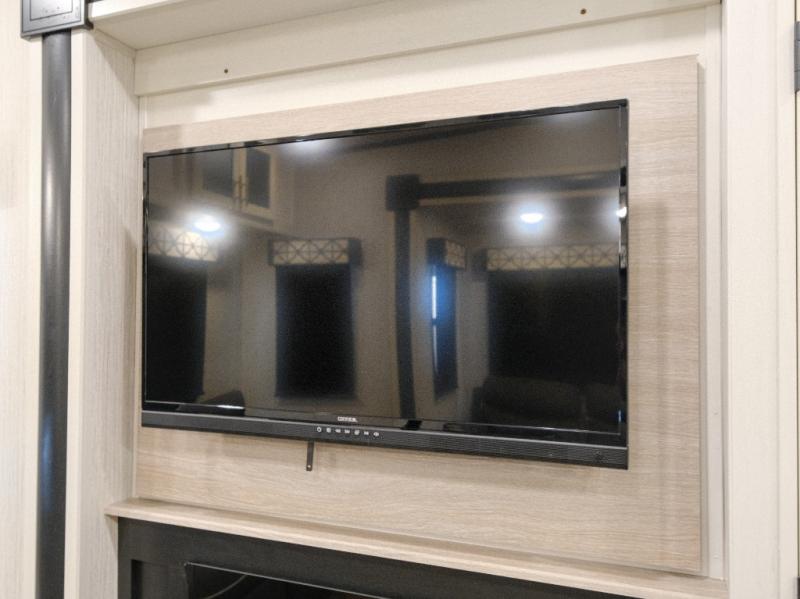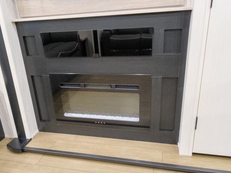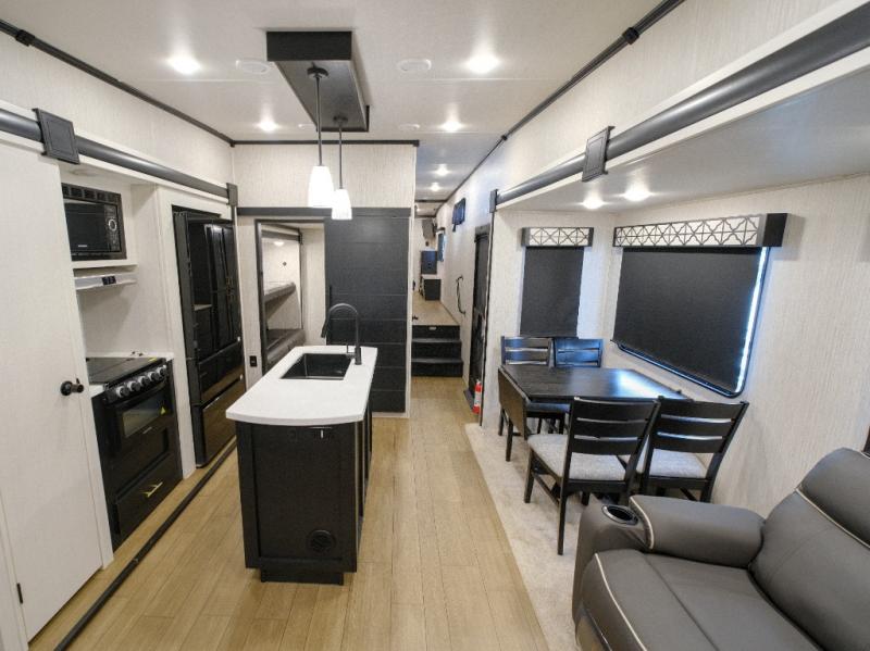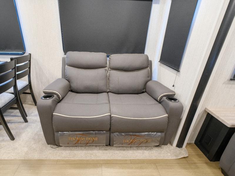 Wow check out this fifth wheel with four slide outs, a middle bunkhouse with a loft, plus two power awnings! The main living area includes 60" theater seating across from the entertainment center and fireplace, a hide-a-bed sofa, and a free-standing dinette to enjoy meals together. Your guests will love having their own space in the bunkhouse that includes a jackknife sofa, a flip-down bunk, plus a dresser and a TV. Head to the front private bedroom for a great night's rest on the slide out king bed, and there is a walk-in wardrobe with washer and dryer prep for full-time living!