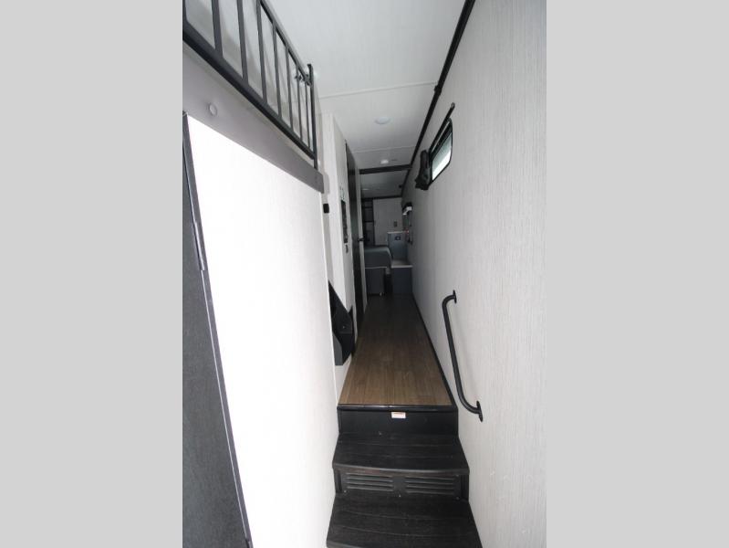 Wow check out this fifth wheel with four slide outs, a middle bunkhouse with a loft, plus two power awnings! The main living area includes 60" theater seating across from the entertainment center and fireplace, a hide-a-bed sofa, and a free-standing dinette to enjoy meals together. Your guests will love having their own space in the bunkhouse that includes a jackknife sofa, a flip-down bunk, plus a dresser and a TV. Head to the front private bedroom for a great night's rest on the slide out king bed, and there is a walk-in wardrobe with washer and dryer prep for full-time living!