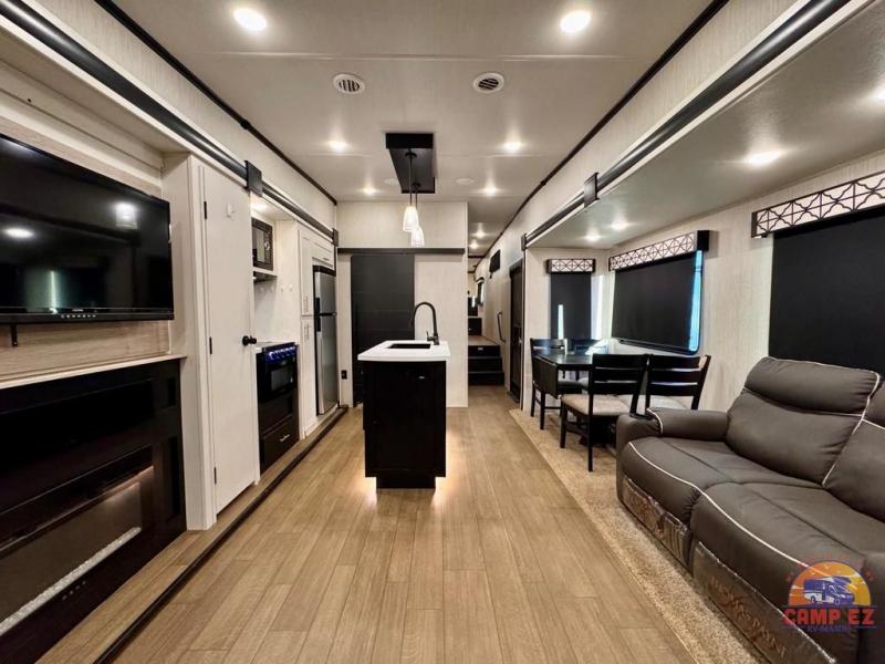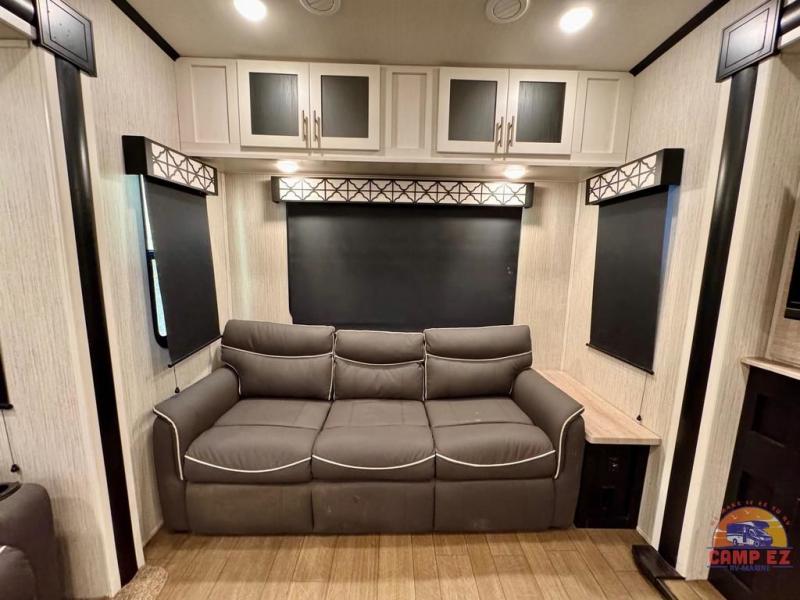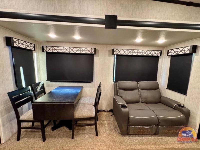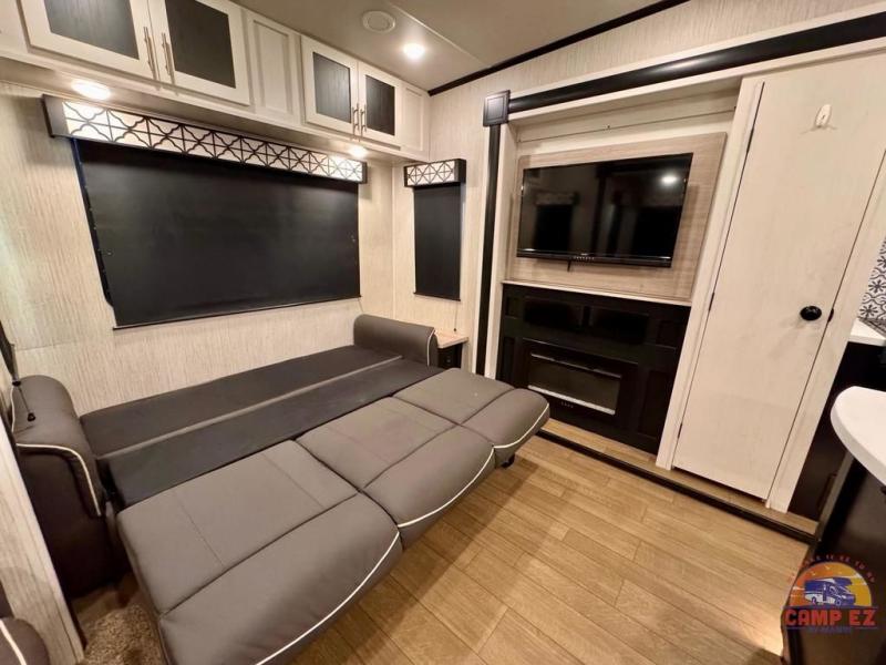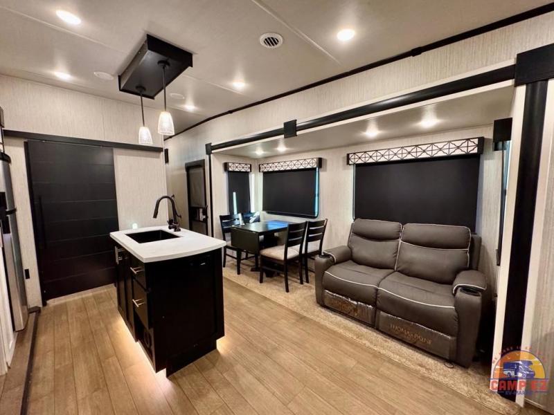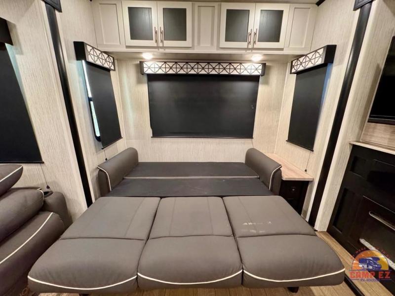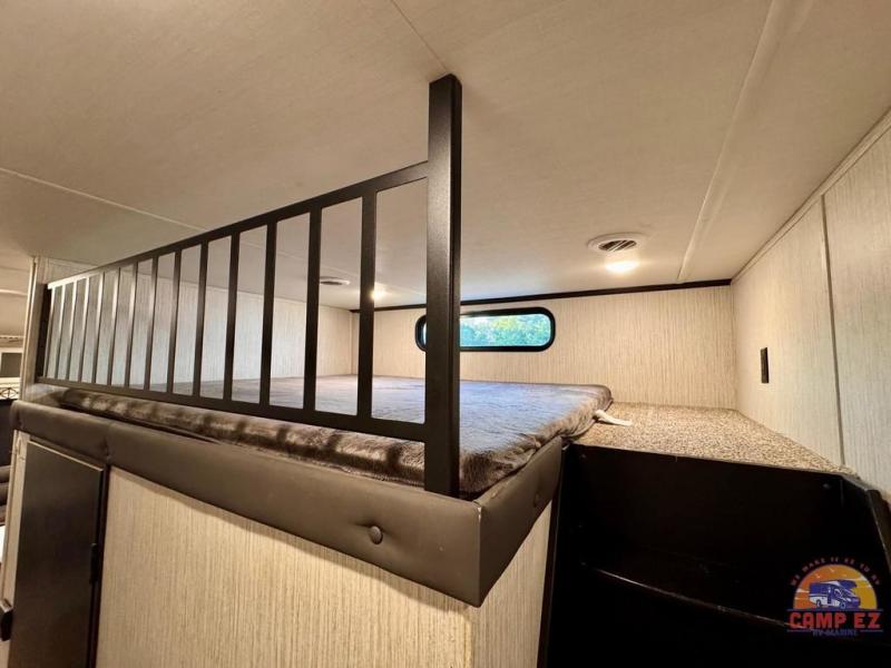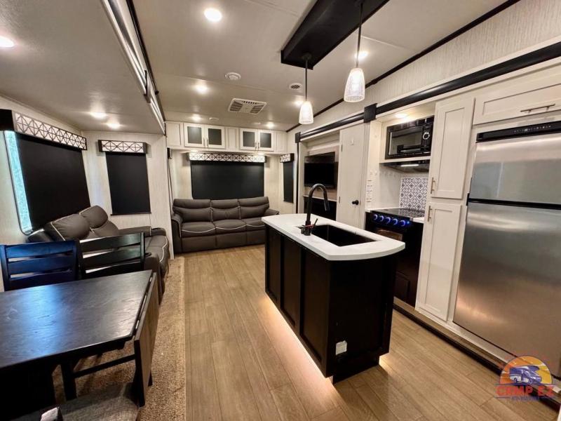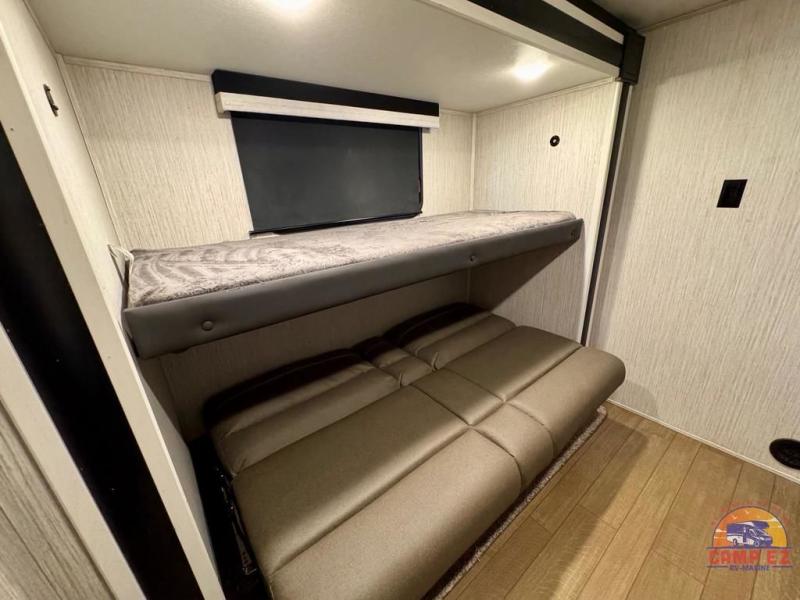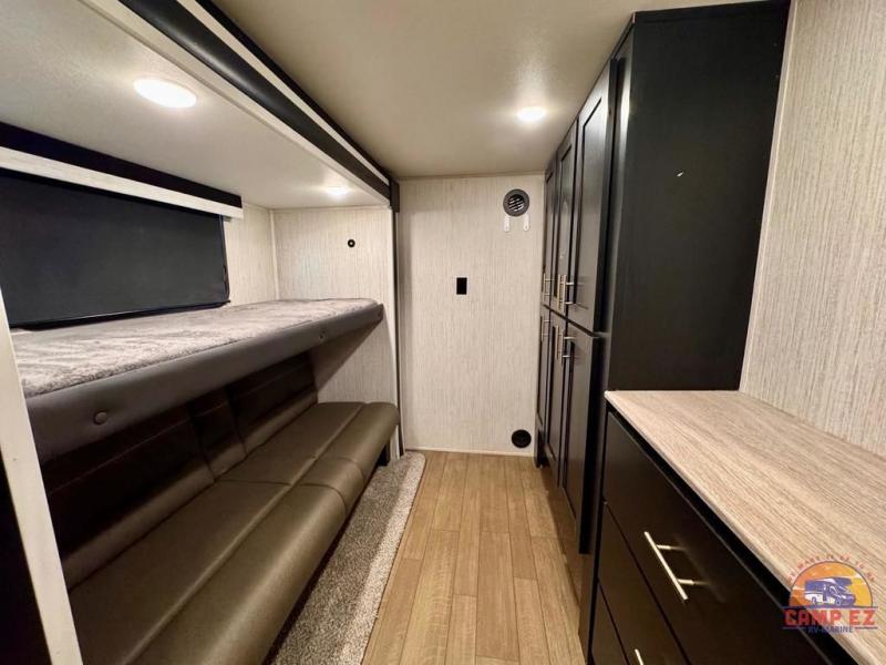 Wow check out this fifth wheel with four slide outs, a middle bunkhouse with a loft, plus two power awnings! The main living area includes 60" theater seating across from the entertainment center and fireplace, a hide-a-bed sofa, and a free-standing dinette to enjoy meals together. Your guests will love having their own space in the bunkhouse that includes a jackknife sofa, a flip-down bunk, plus a dresser and a TV. Head to the front private bedroom for a great night's rest on the slide out king bed, and there is a walk-in wardrobe with washer and dryer prep for full-time living!