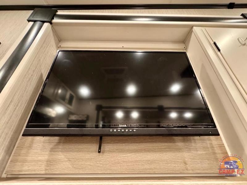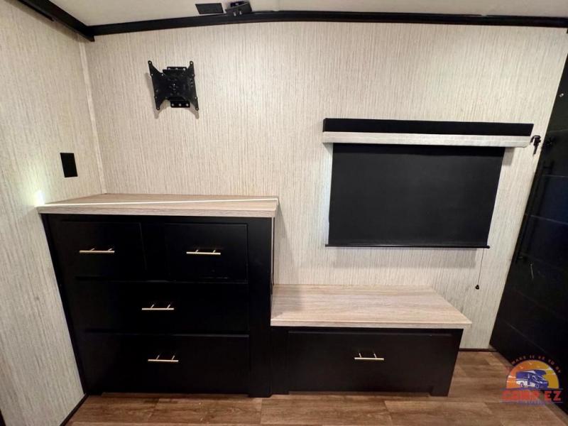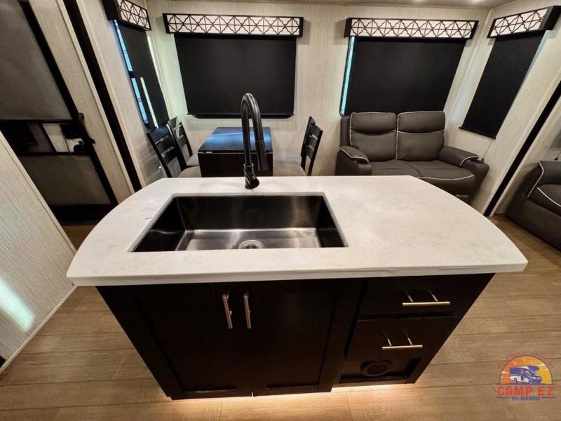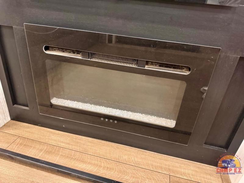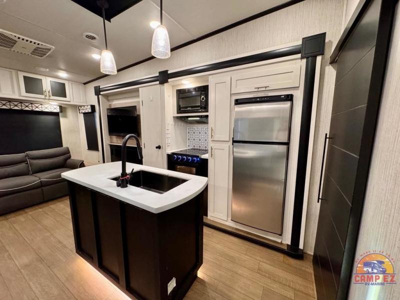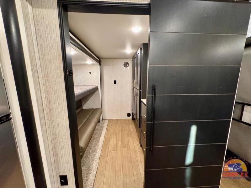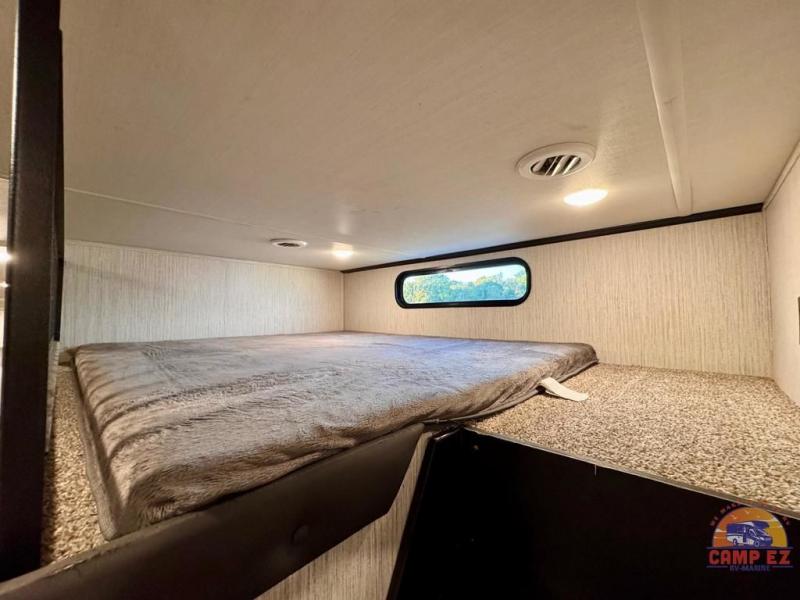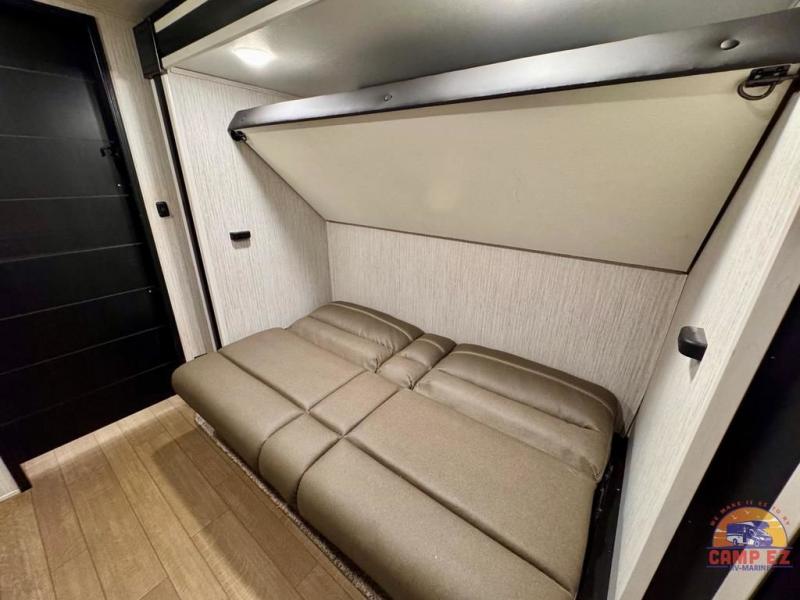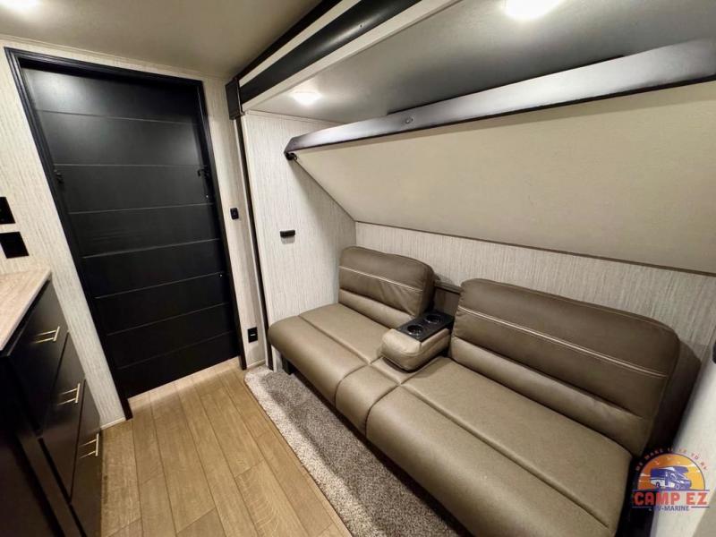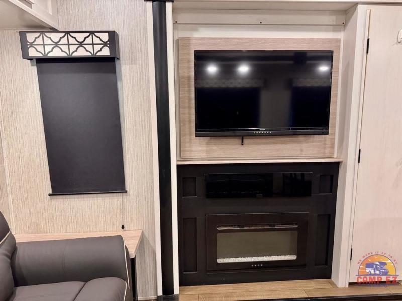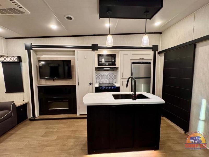 Wow check out this fifth wheel with four slide outs, a middle bunkhouse with a loft, plus two power awnings! The main living area includes 60" theater seating across from the entertainment center and fireplace, a hide-a-bed sofa, and a free-standing dinette to enjoy meals together. Your guests will love having their own space in the bunkhouse that includes a jackknife sofa, a flip-down bunk, plus a dresser and a TV. Head to the front private bedroom for a great night's rest on the slide out king bed, and there is a walk-in wardrobe with washer and dryer prep for full-time living!
