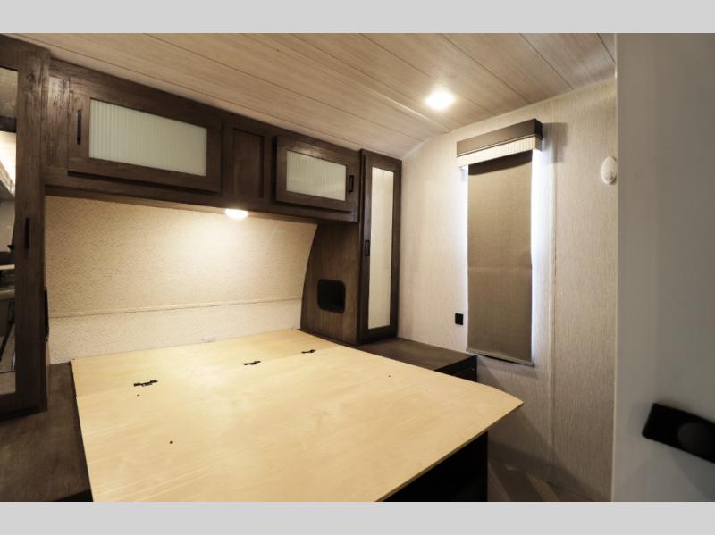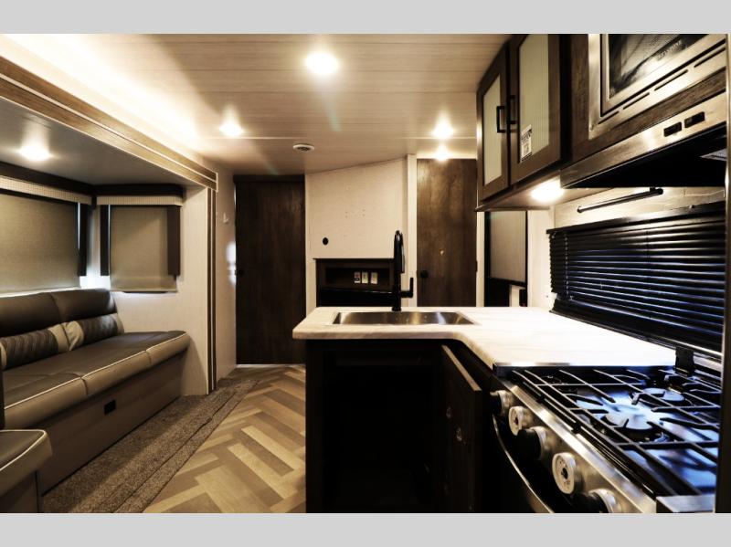 Inside, the Wildwood 26DBUD offers residential comfort with a well-equipped kitchen and modern living features. The full kitchen includes a three-burner cooktop, oversized refrigerator, microwave, large pantry, and glass-front cabinetry, giving travelers the convenience of preparing meals just like at home. The spacious U-shaped dinette provides a comfortable place to dine, play games, or convert into additional sleeping space when needed. The innovative Versa-Lounge with Stow-N-Go storage adds flexible seating and extra storage, making it easy to keep gear organized during long trips.