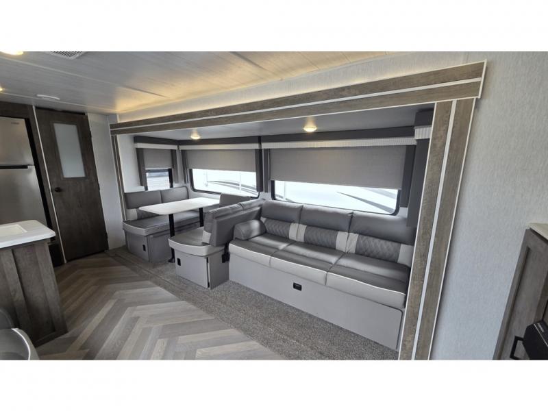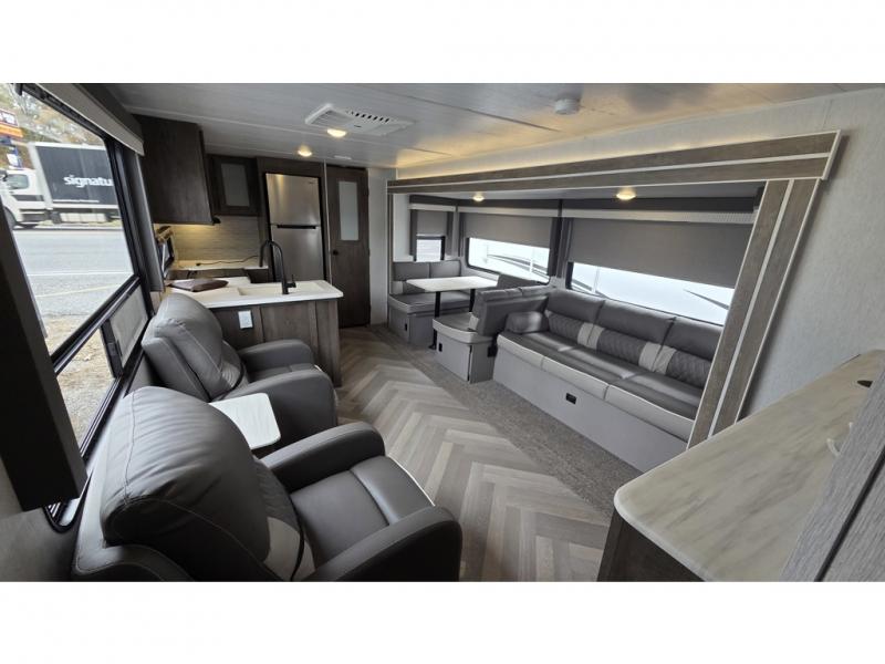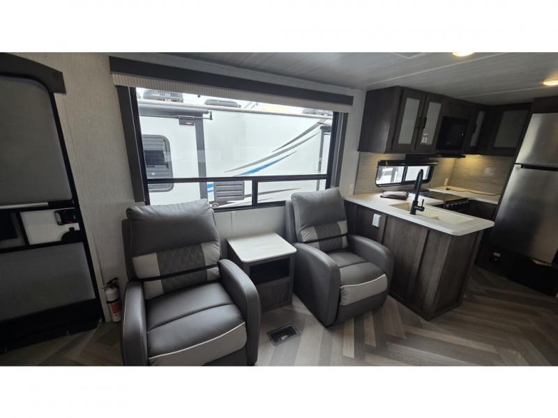 This Wildwood travel trailer is perfect for your family of five looking for a new adventure. You will enjoy the rear kitchen that includes an oversized refrigerator and a three-burner cooktop. The booth dinette within the slide out is perfect for enjoying meals, and when you're through, you can relax on the sofa. Both of these pieces of furniture are a part of the Versa Lounge which allows you to customize their function by moving the middle section to create a larger sofa or a larger dinette. This unit also includes two lounge chairs, so you'll feel right at home! You'll love the full bath in this unit, and the queen bed in the private bedroom is perfect for a good night's rest.