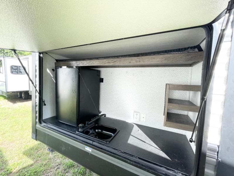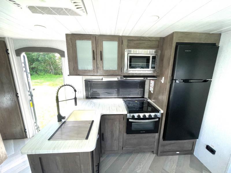Forest River offers you the highest quality and the best components in its Wildwood travel trailer! The fully walkable one-piece roof is ultra reliable, and the rest of the construction is just as dependable with the powder-coated I-beam frame, cambered chassis, R-7 fiberglass insulation, nitrogen-filled tires, and triple-seal slide-out system. The Wildwood is not only full of quality, but it is also full of style with its herringbone luxury vinyl flooring, upgraded designer furniture, high-gloss exterior metal, and seamless countertops. The Wildwood also comes with some extra features that will make your life more comfortable, like the exterior speakers with blue LED light, the tablet-compatible USB ports, the residential vanity with shower caddy, and true stabilizer jacks with JT's Strong Arm.