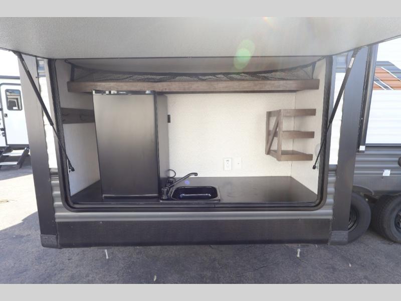 With this triple-slide Wildwood travel trailer, everyone can have their own space! The private bunkhouse features dual opposing slides that provide tons of space for the kids to play. The large slide in the living area opens up the whole space, and here you'll find a Versa Lounge with a U-shaped dinette and sofa which is perfect for meal times and relaxing. You'll love the front private bedroom with a queen bed, and everyone will appreciate the full bath. The chef of the family can cook a meal on the three-burner range, or you can prepare hamburgers on the outside kitchen you are sure to love!