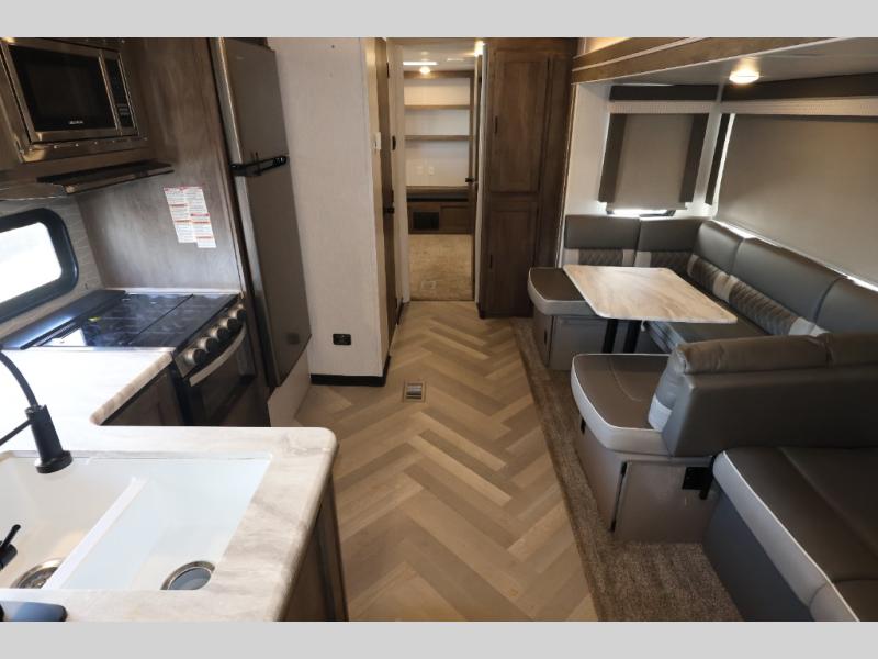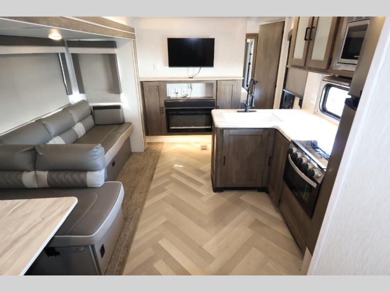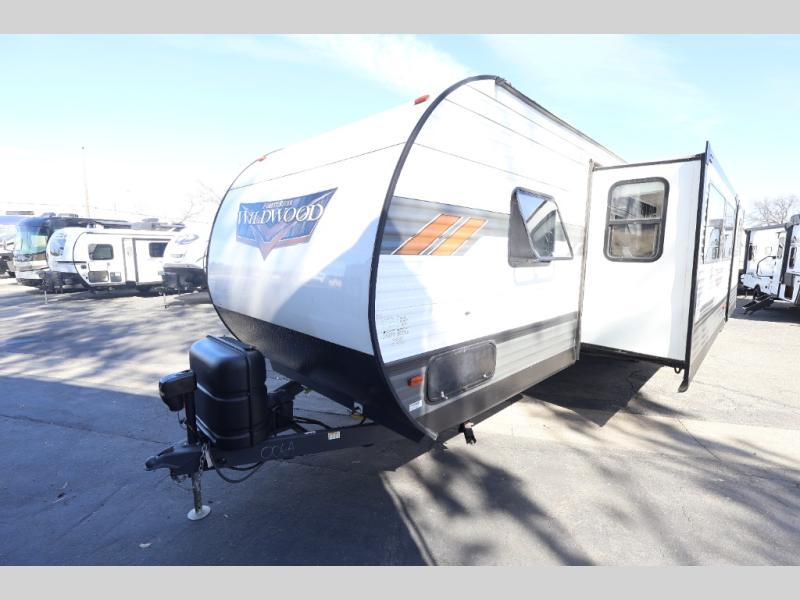 Forest River offers you the highest quality and the best components in its Wildwood travel trailer! The fully walkable one-piece roof is ultra reliable, and the rest of the construction is just as dependable with the powder-coated I-beam frame, cambered chassis, R-7 fiberglass insulation, and triple-seal slide-out system. The Wildwood is not only full of quality, but it is also full of style with its herringbone luxury vinyl flooring, upgraded designer furniture, high-gloss exterior metal, and seamless countertops. The Wildwood also comes with some extra features that will make your life more comfortable, like the exterior speakers with blue LED light, the tablet-compatible USB ports, the residential vanity with shower caddy, and true stabilizer jacks with JT's Strong Arm.