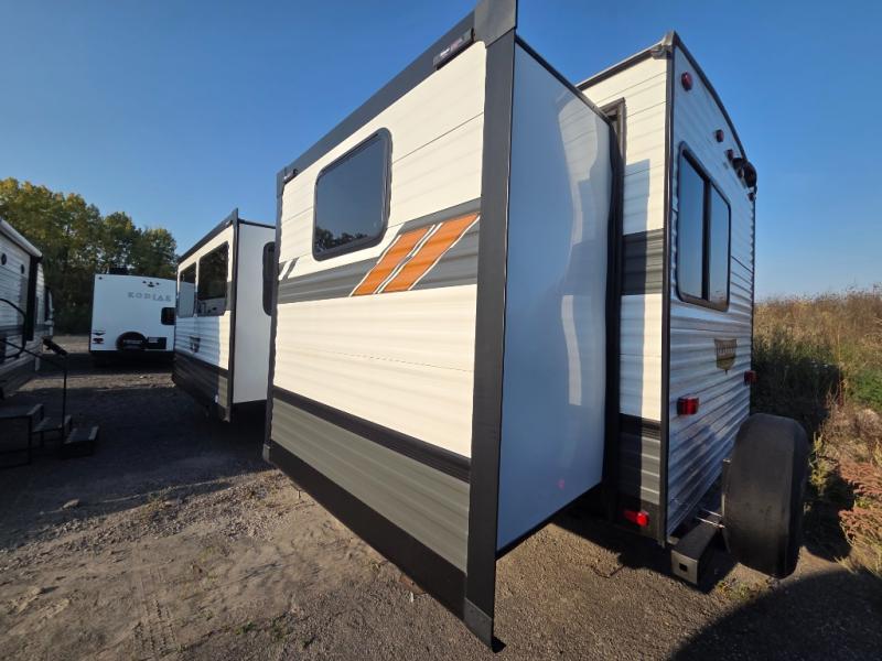 Get ready for your next weekend getaway to your local state park with this double-slide Wildwood travel trailer. The private bunkhouse is perfect for the kids, and you can enjoy the front private bedroom with a queen bed. This unit also includes a U-shaped dinette and sofa which create the Versa Lounge, and the kitchen features an L-shaped countertop which allows you to have more space to cut and prepare a meal. The double-bowl sink is perfect for cleaning up afterward, and you'll love how convenient the full bath is with its own exterior entry door.