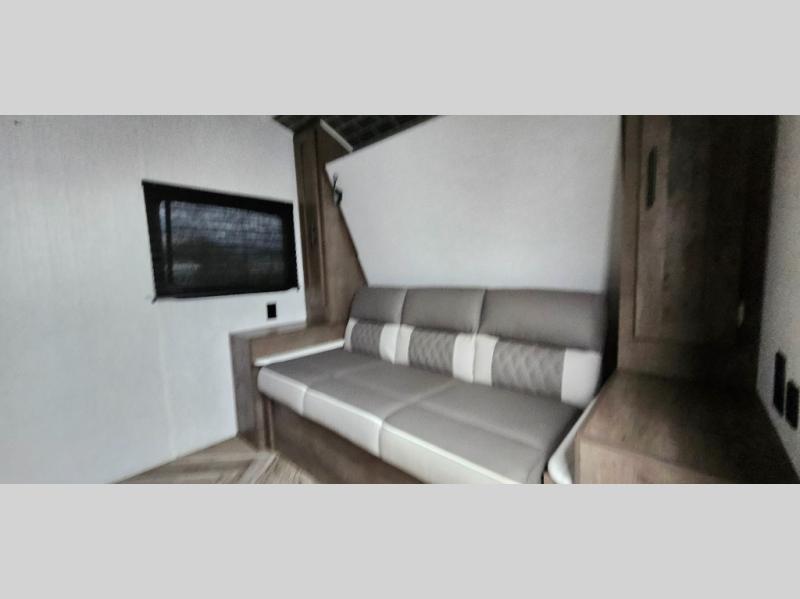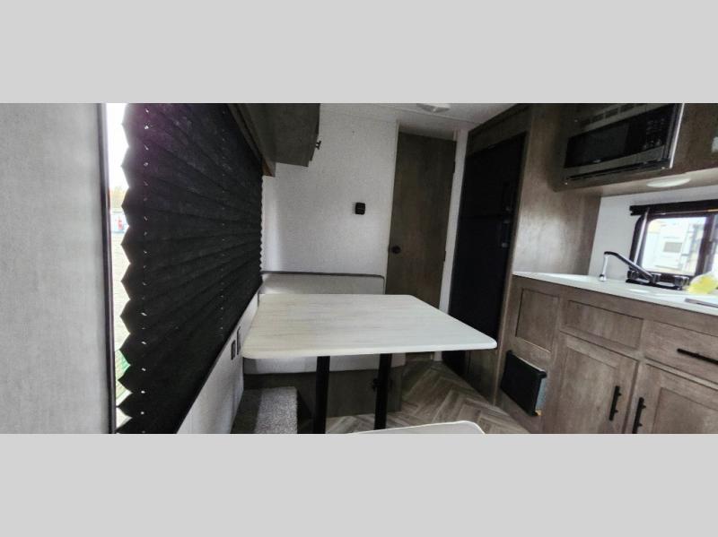 This travel trailer with a full rear bath and versatile sleeping space is your ticket to fun and adventure. While you're putting out the 12' power awning, you can grab a cold drink from the outdoor refrigerator and grab the lawn chairs from the outside storage. There is a two burner cooktop and a microwave oven to prepare your meals in, and a booth dinette to dine at. You'll love the queen Murphy bed to sleep on at night, and the sofa to relax on during the day!