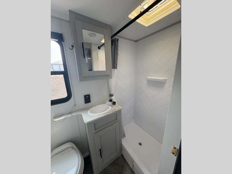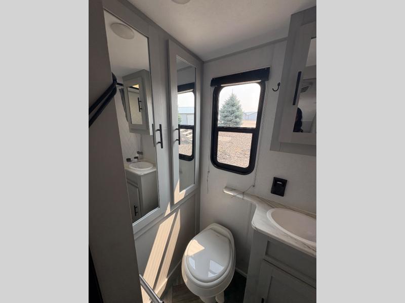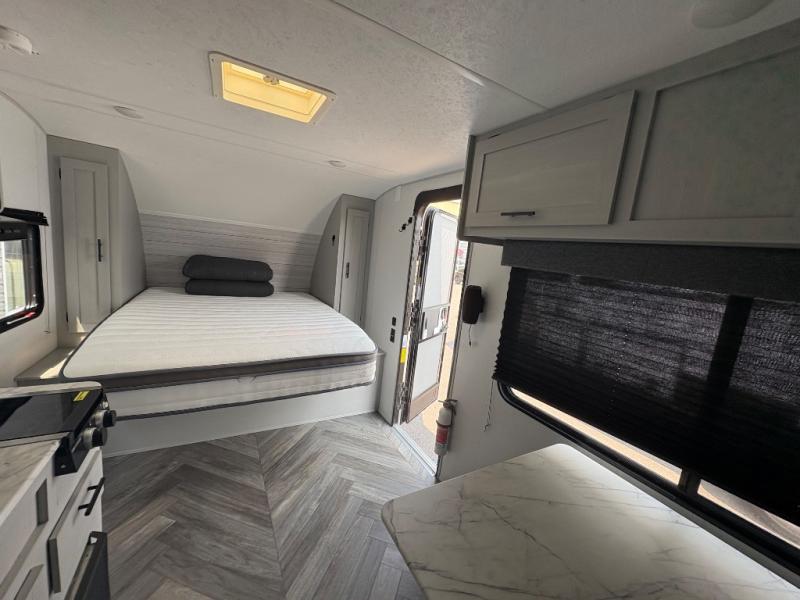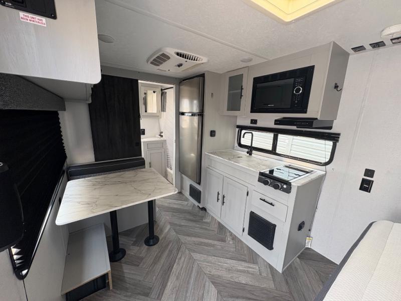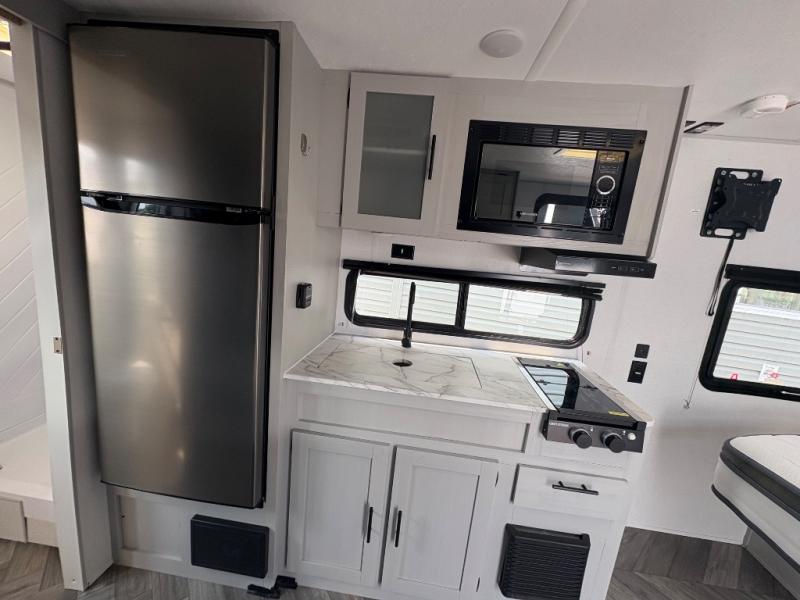 This travel trailer with a full rear bath and versatile sleeping space is your ticket to fun and adventure. While you're putting out the 12' power awning, you can grab a cold drink from the outdoor refrigerator and grab the lawn chairs from the full pass-through storage. There is a two burner cooktop and a microwave oven to prepare your meals in, and a booth dinette to dine at. You'll love the RV queen Murphy bed to sleep on at night, and the sofa with storage to relax on during the day!