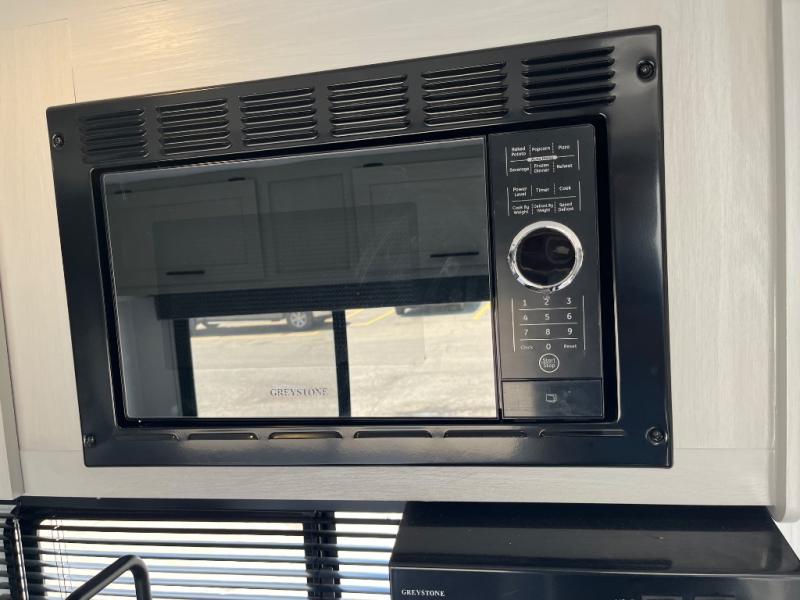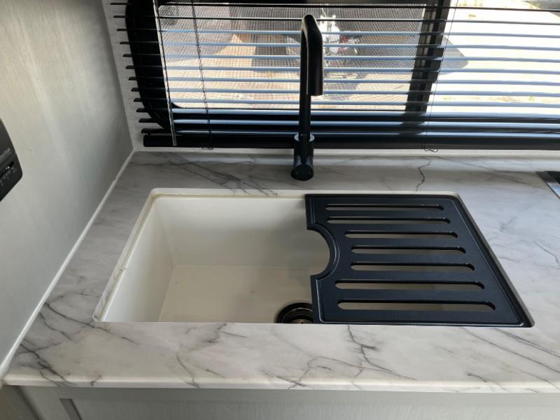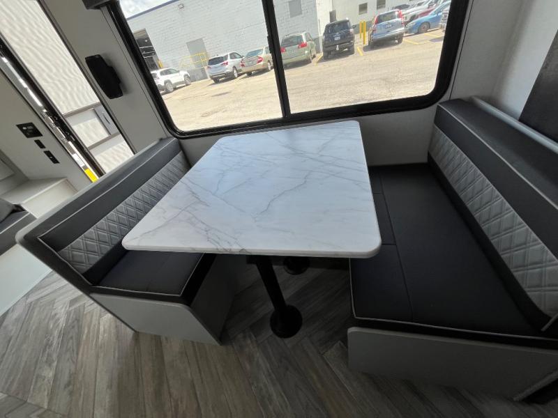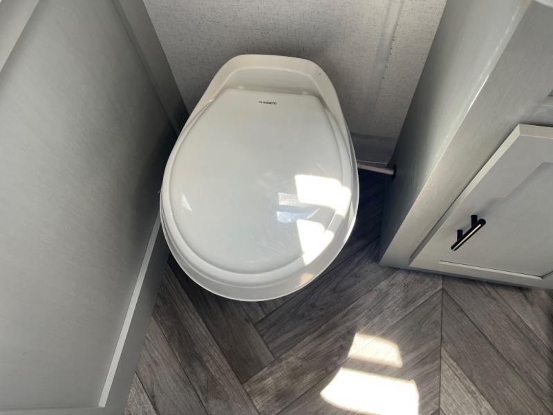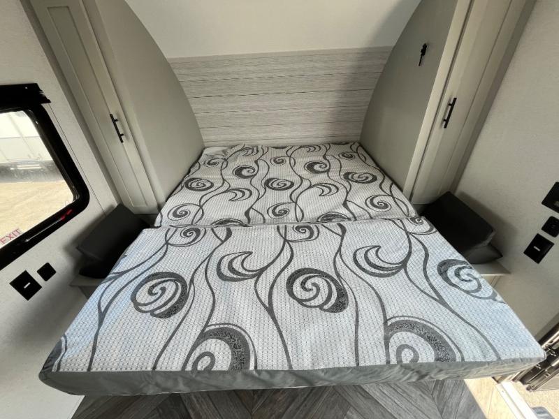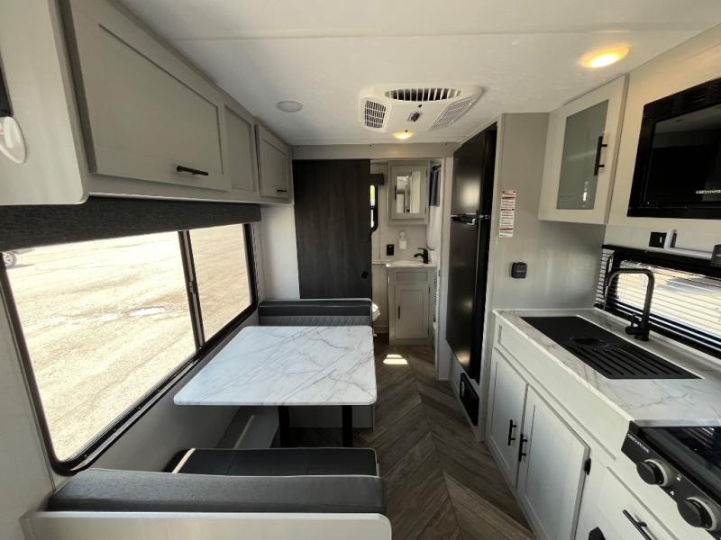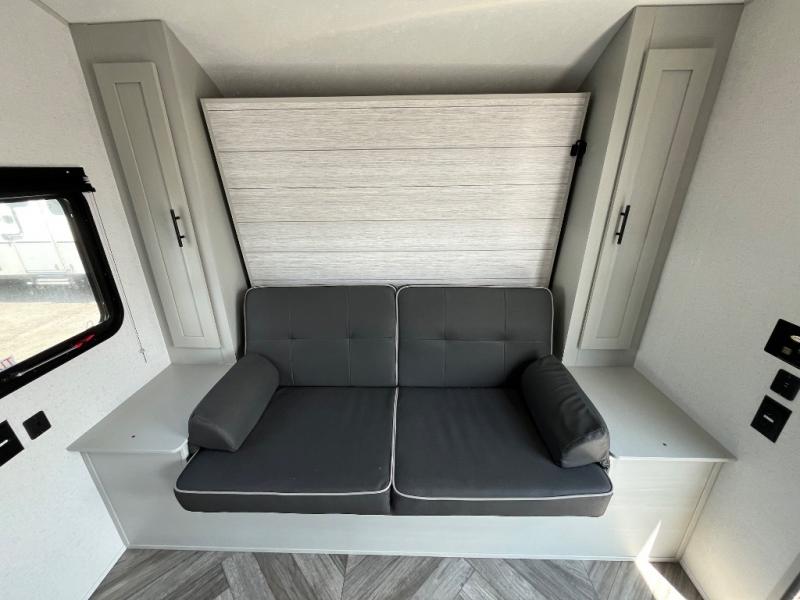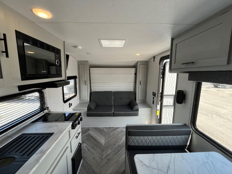 This travel trailer with a full rear bath and versatile sleeping space is your ticket to fun and adventure. While you're putting out the 12' power awning, you can grab a cold drink from the outdoor refrigerator and grab the lawn chairs from the full pass-through storage. There is a two burner cooktop and a microwave oven to prepare your meals in, and a booth dinette to dine at. You'll love the RV queen Murphy bed to sleep on at night, and the sofa with storage to relax on during the day!